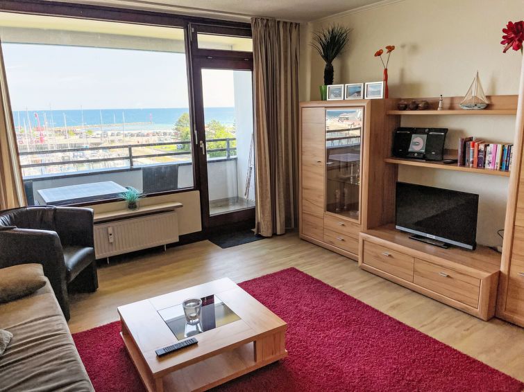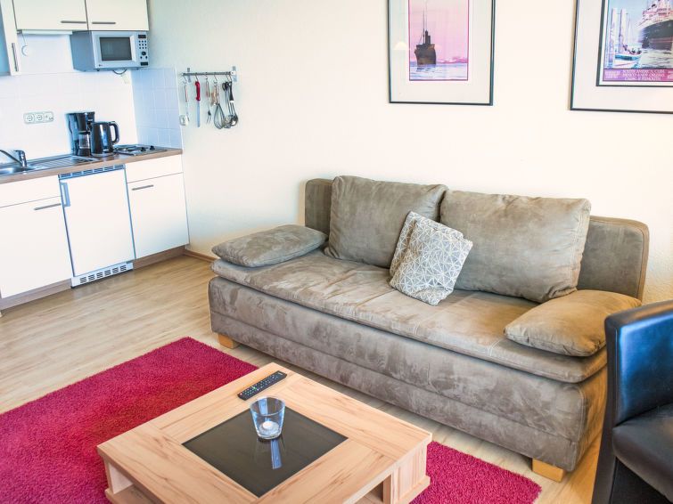 1-room apartment 35 m2 on 4th floor. Cosy furnishings: living/sleeping room with 1 double sofabed (180 cm, length 200 cm), dining table and cable TV (flat screen). Exit to the balcony. Open kitchen (2 hot plates, toaster, kettle, microwave, electric coffee machine). Shower/WC. Small balcony.