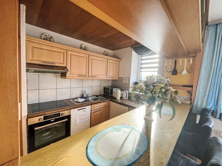 "Fewo 4 in ruhigem Haus", 3-room apartment 45 m2 on 2 levels, on the upper floor. Comfortable furnishings: living/dining room with satellite TV (flat screen), radio, CD-player and DVD. 1 room with 1 double bed and satellite TV (flat screen). Kitchenette (oven, dishwasher, 4 ceramic glass hob hotplates, toaster, kettle, microwave, electric coffee machine) with bar, dining table.