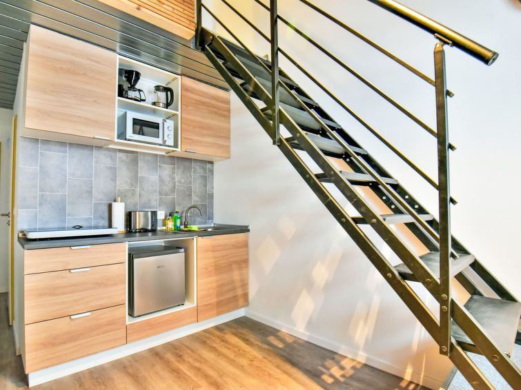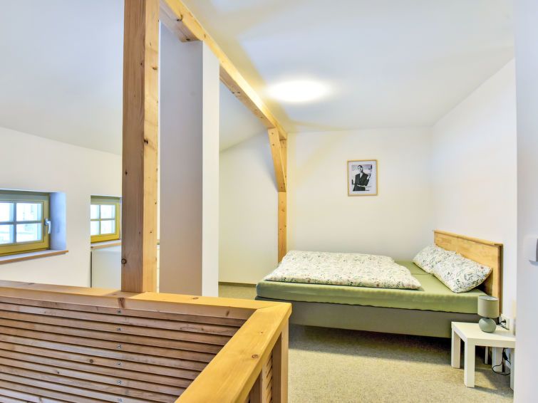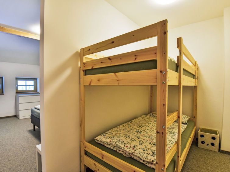 "Millie", 2-room apartment 36 m2 on 2 levels. Fully renovated in 2023, practical and modern furnishings: kitchen-/living room (2 ceramic glass hob hotplates, toaster, kettle, microwave, electric coffee machine) with dining table and satellite TV (flat screen). Shower/WC. Upper floor: with sloping ceilings, 1 large room with 1 x 2 bunk beds (90 cm, length 200 cm), 1 double bed (180 cm, length 200 cm).