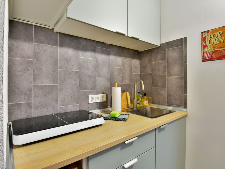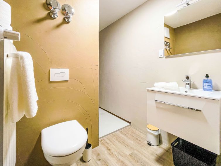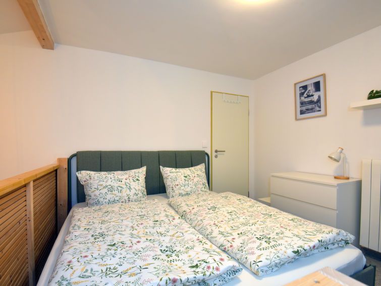 "Liz", 2-room apartment 26 m2 on 2 levels. Fully renovated in 2023, practical and modern furnishings: kitchen-/living room (2 ceramic glass hob hotplates, toaster, kettle, microwave, electric coffee machine) with dining table and satellite TV (flat screen). Shower/WC. Upper floor: with sloping ceilings, 1 large room with 1 double bed (180 cm, length 200 cm).