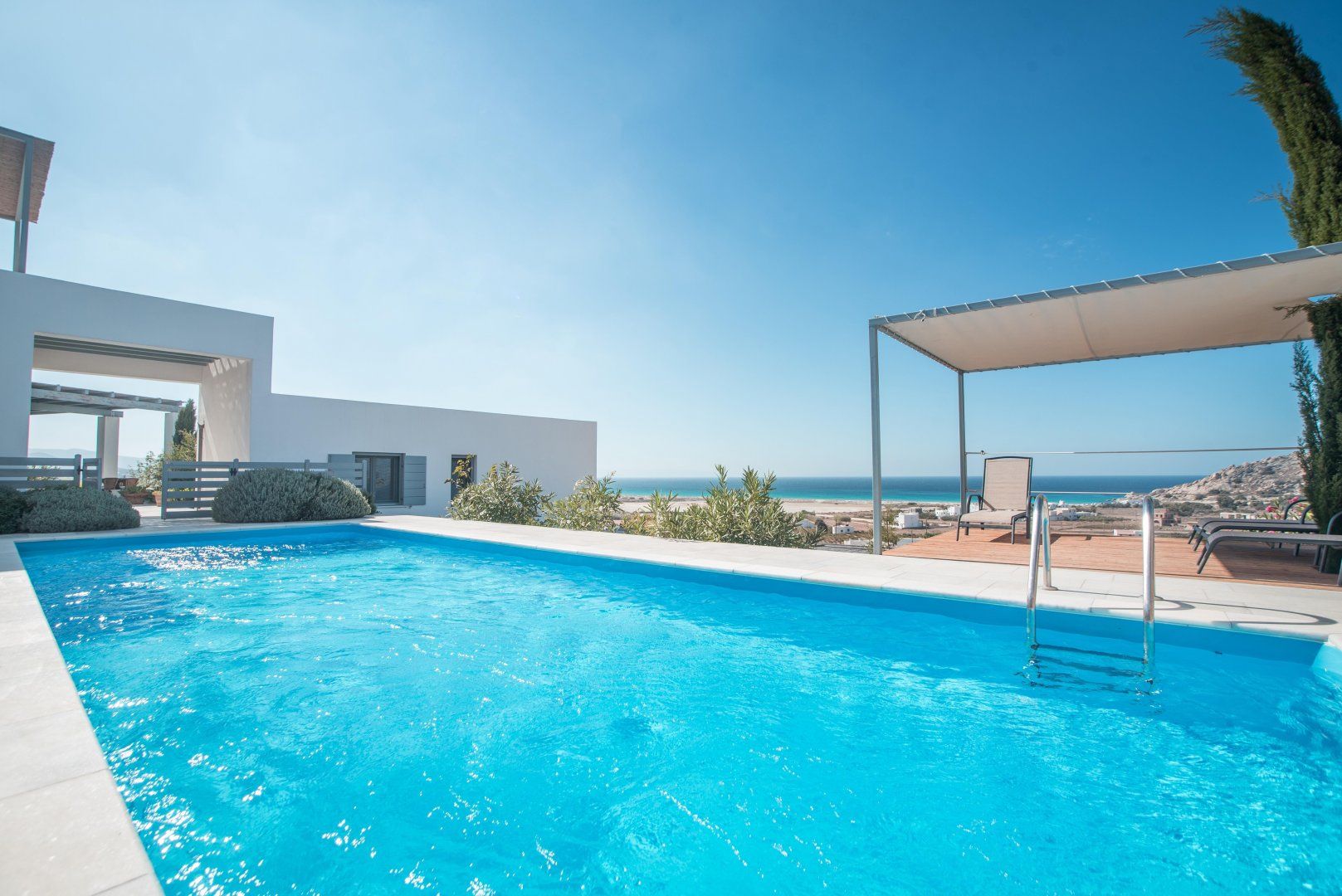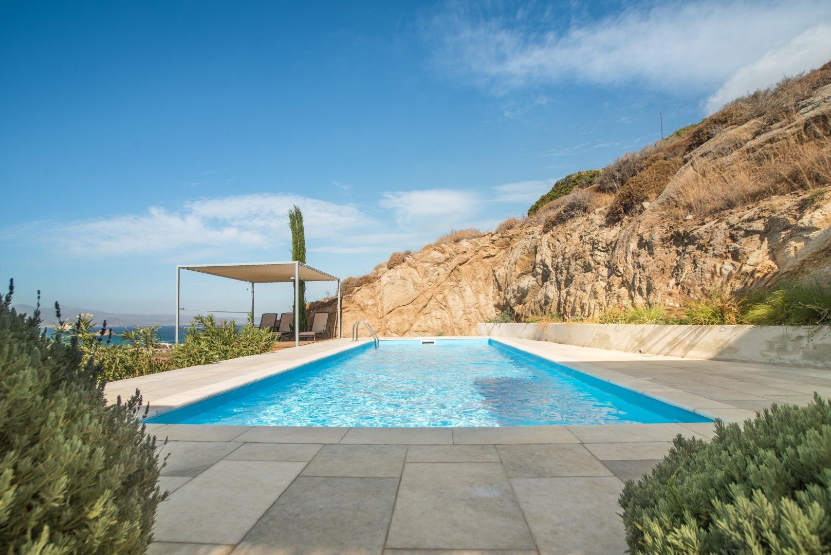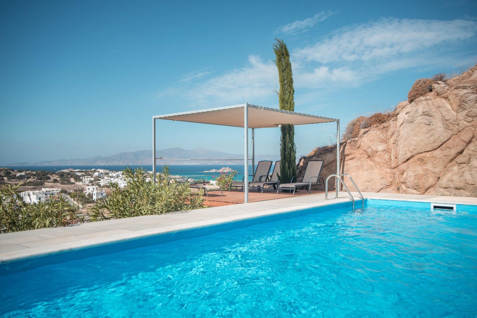 This stunning villa is perfect for families or groups of up to 14 people. With two separate buildings, this property offers a total of six large bedrooms and five bathrooms. The layout of the villa is ideal for families with children or six couples, with three separate buildings and many spacious communal private areas to escape for private moments. Guests can also enjoy a beautiful swimming pool carved out of the surrounding rocks, with fantastic views and a pergola for shade and lounging. The villa is located on a hillside in Mikri Vigla, just a 10-minute walk from one of Greece's best beaches with sun beds, umbrellas available for hire and a great restaurant. There are further restaurants, cafes, grocery stores, and an ATM/cash machine located near the beach. A car is recommended, however there is a bus service to Naxos town. Naxos averages more than 10 hours of sunshine a day in the summer months and almost no rain in June, July, August and September.
