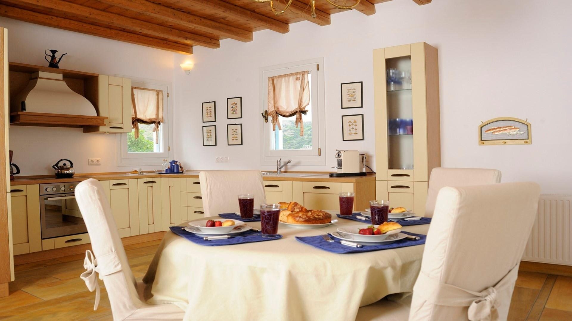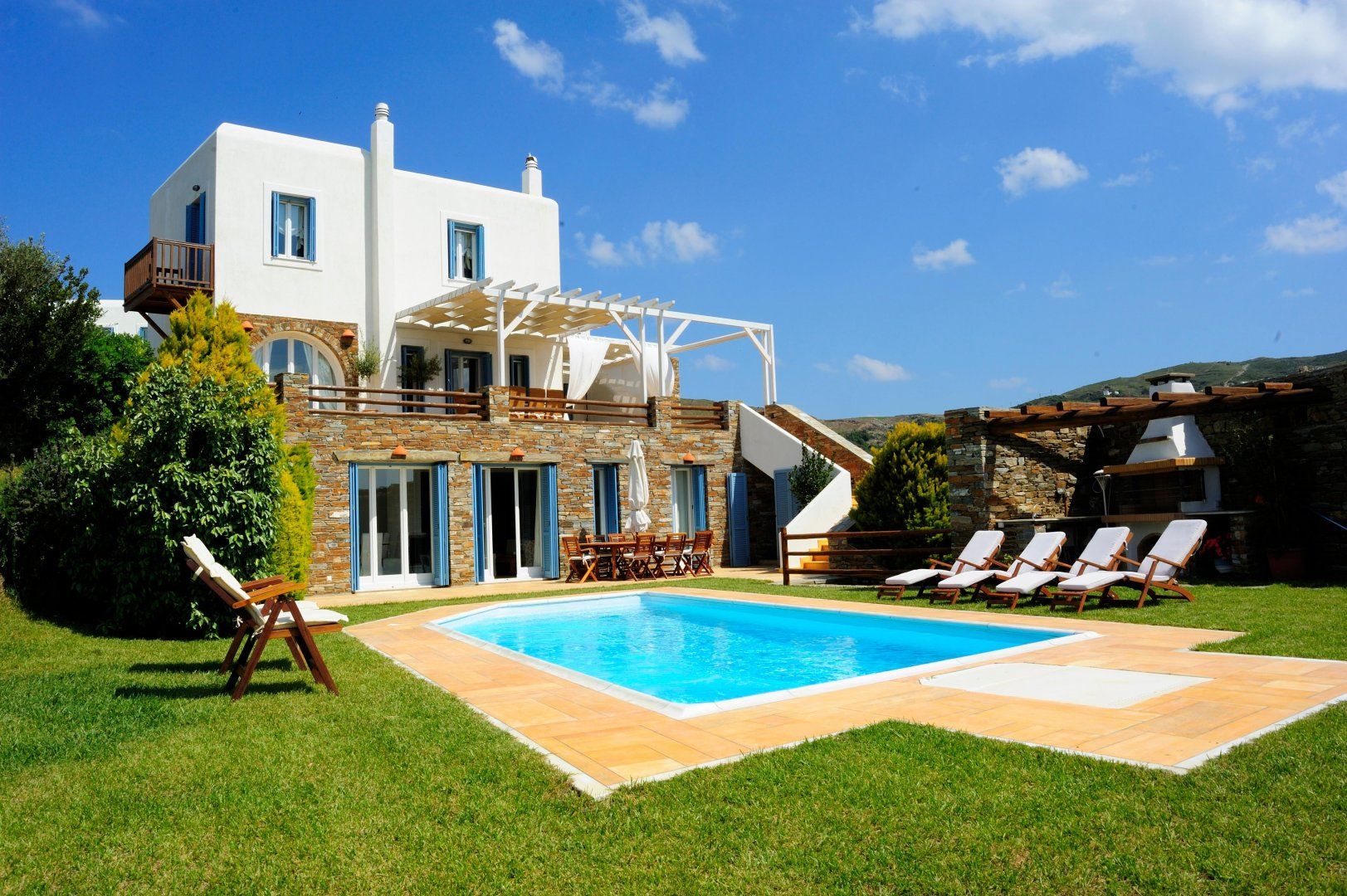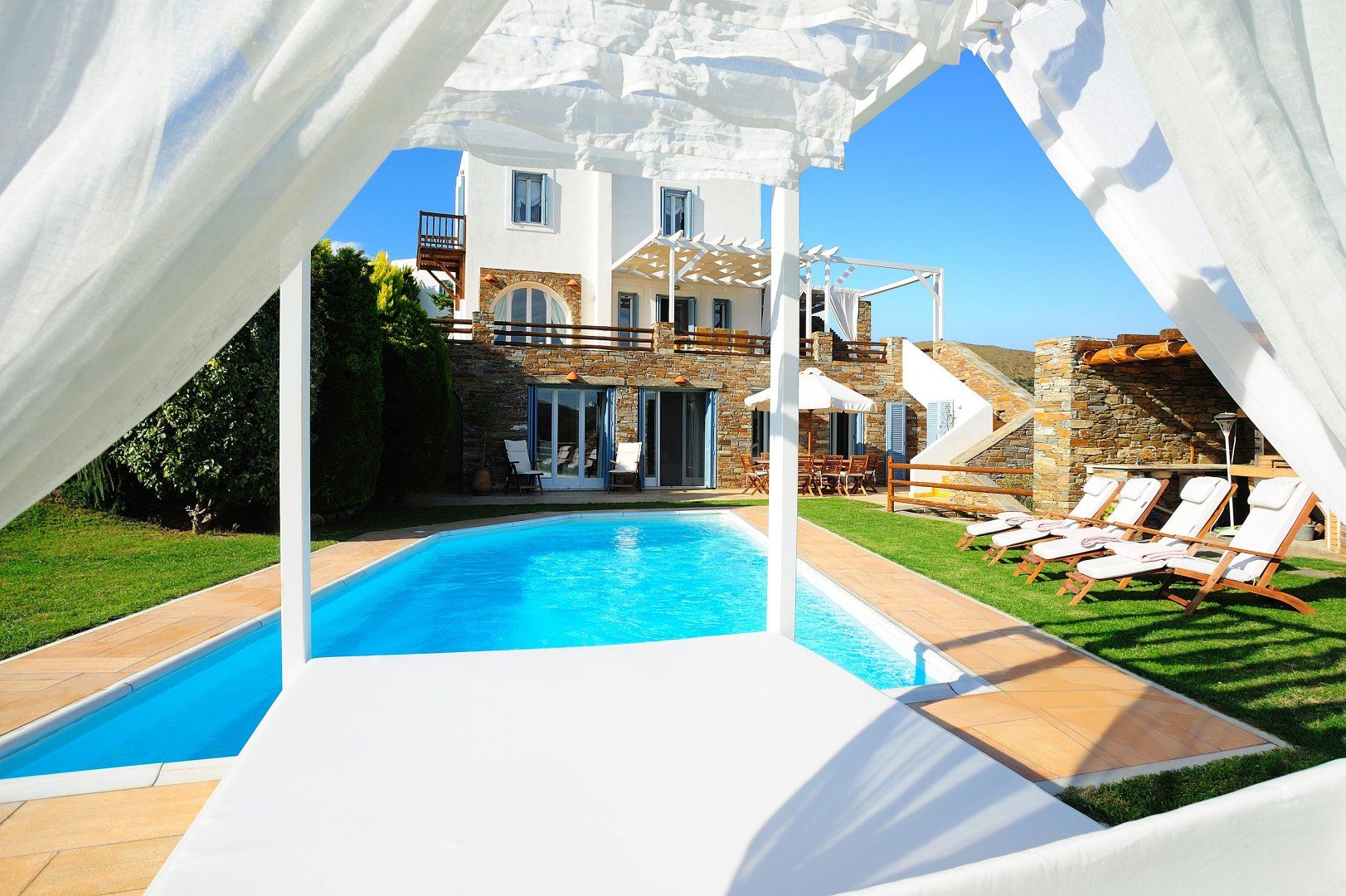 With sweeping views of rolling green hillsides and the glittering Fellos Bay, this Cycladic-style villa guarantees a dreamy stay on Andros’ southwest coast. The home is rustic and inviting – expect squashy sofas in the living space, a fully-equipped traditional kitchen and beamed ceilings that bring a warm richness to the interiors. Bedrooms guarantee a blissful sleep after night and the Jacuzzi tub in the en-suite is the perfect place to unwind at the end of an exciting day spent exploring the island.