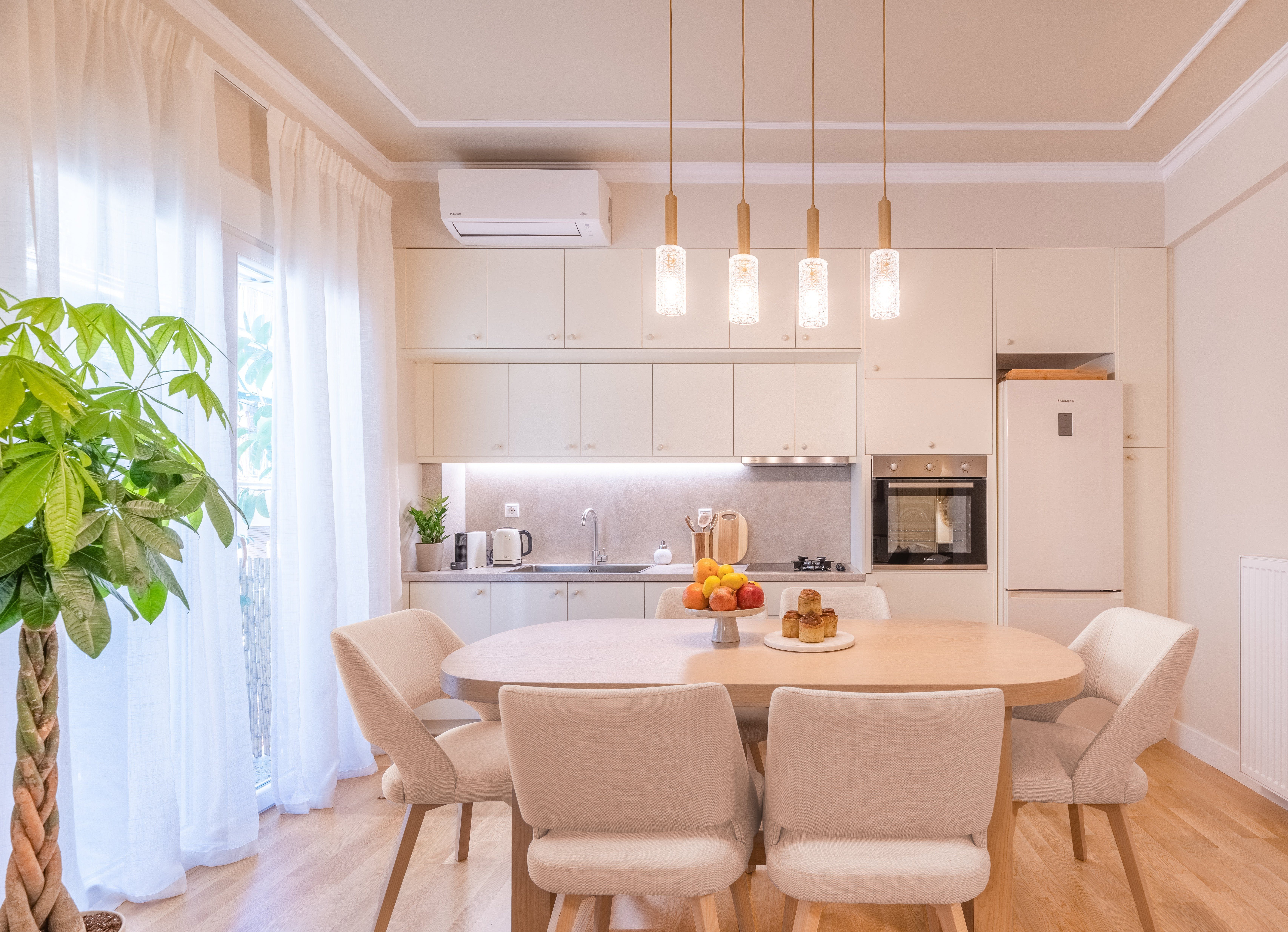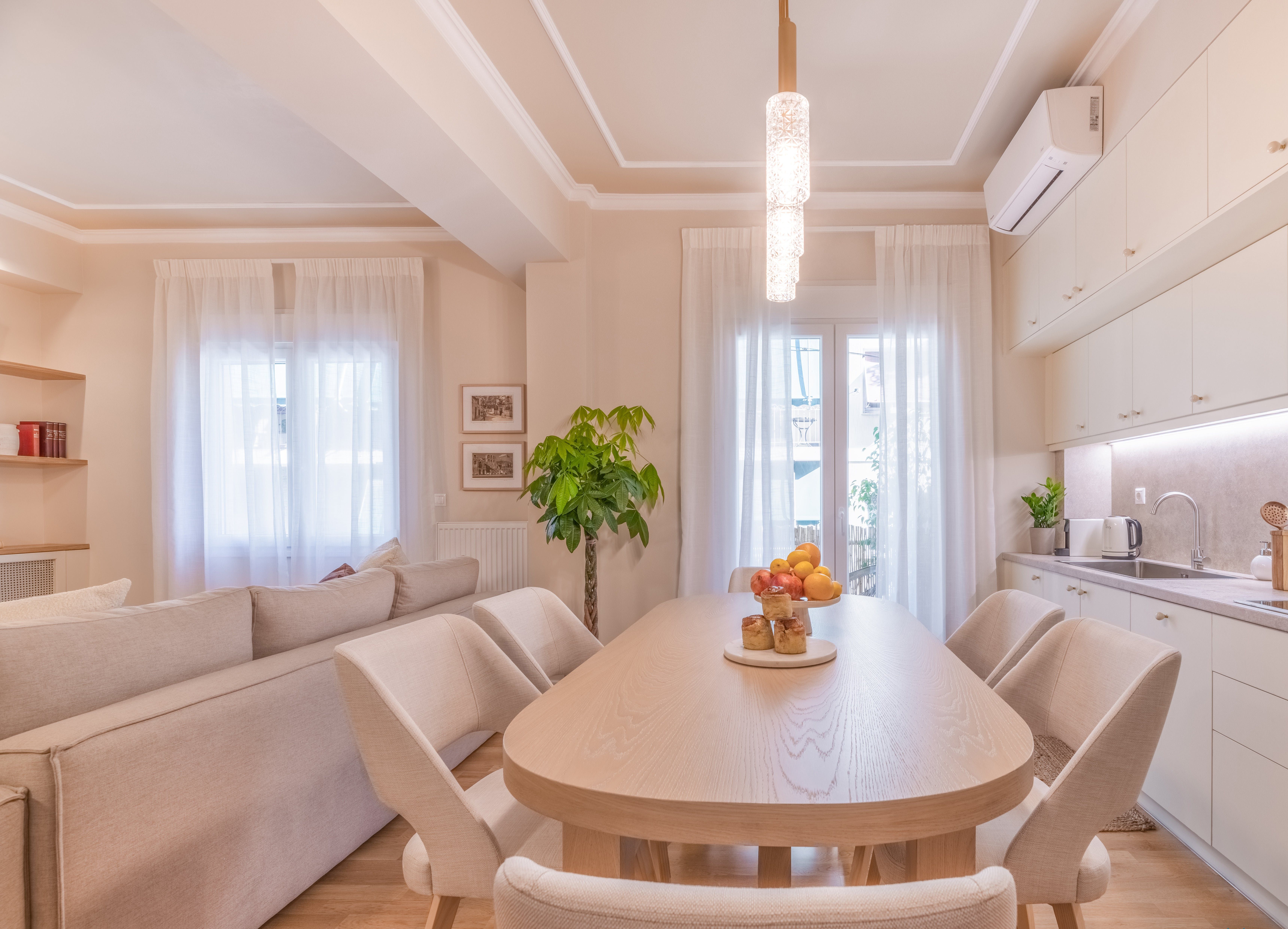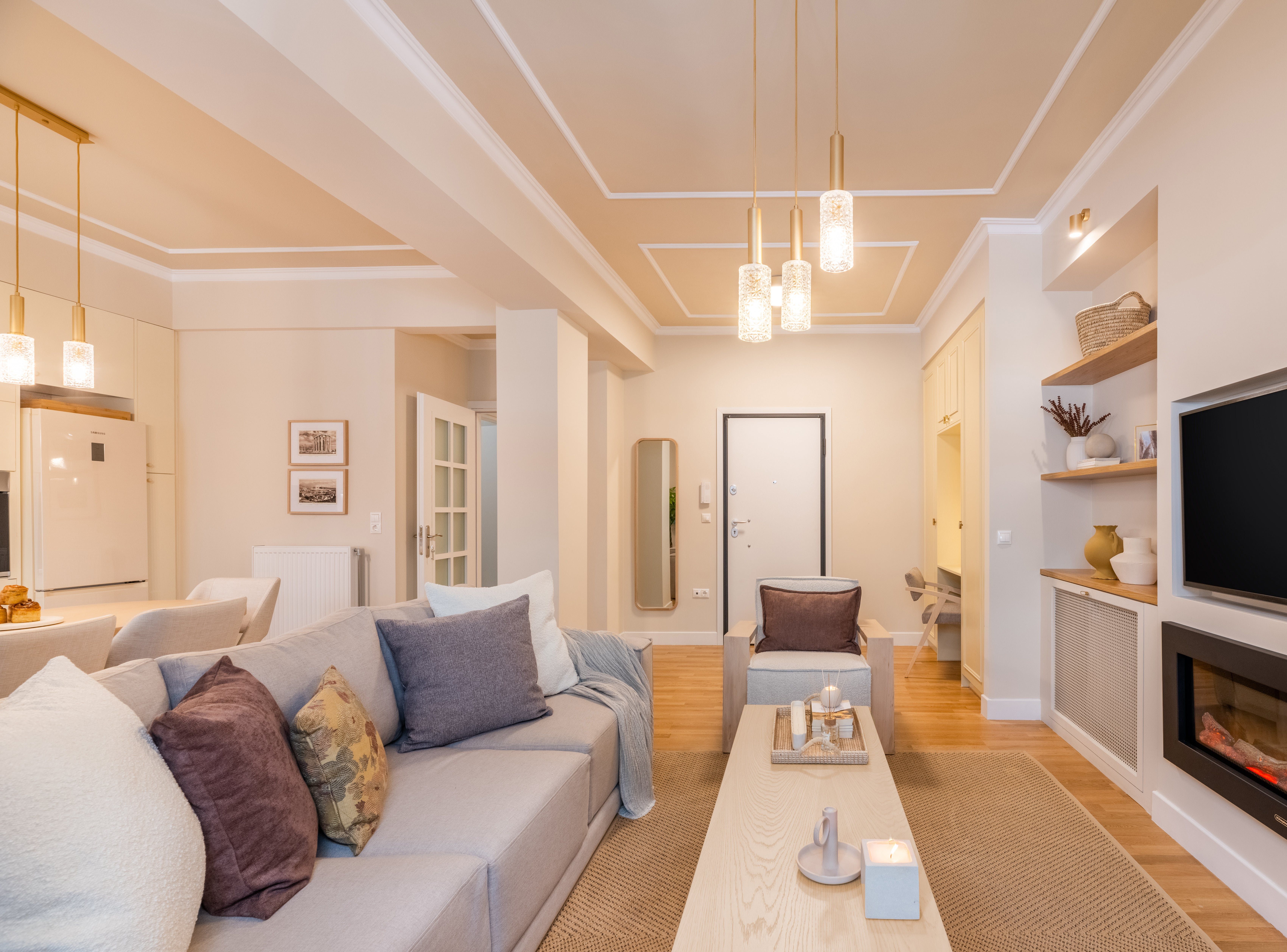 Make your trip to Athens magical by staying in a home fit for the gods. Nestled in the lively area of Koukaki, this upscale apartment invites you to experience the Greek capital in the best way possible. Freshly renovated and enlivened with luxury appeal, this place is illuminated by a medley of earthy tones, and softened by a selection of natural materials. It’s chic but cosy. Decor details like the cornice enhance that sense of refinement, while the snuggly throws and cushions make things extra homely.