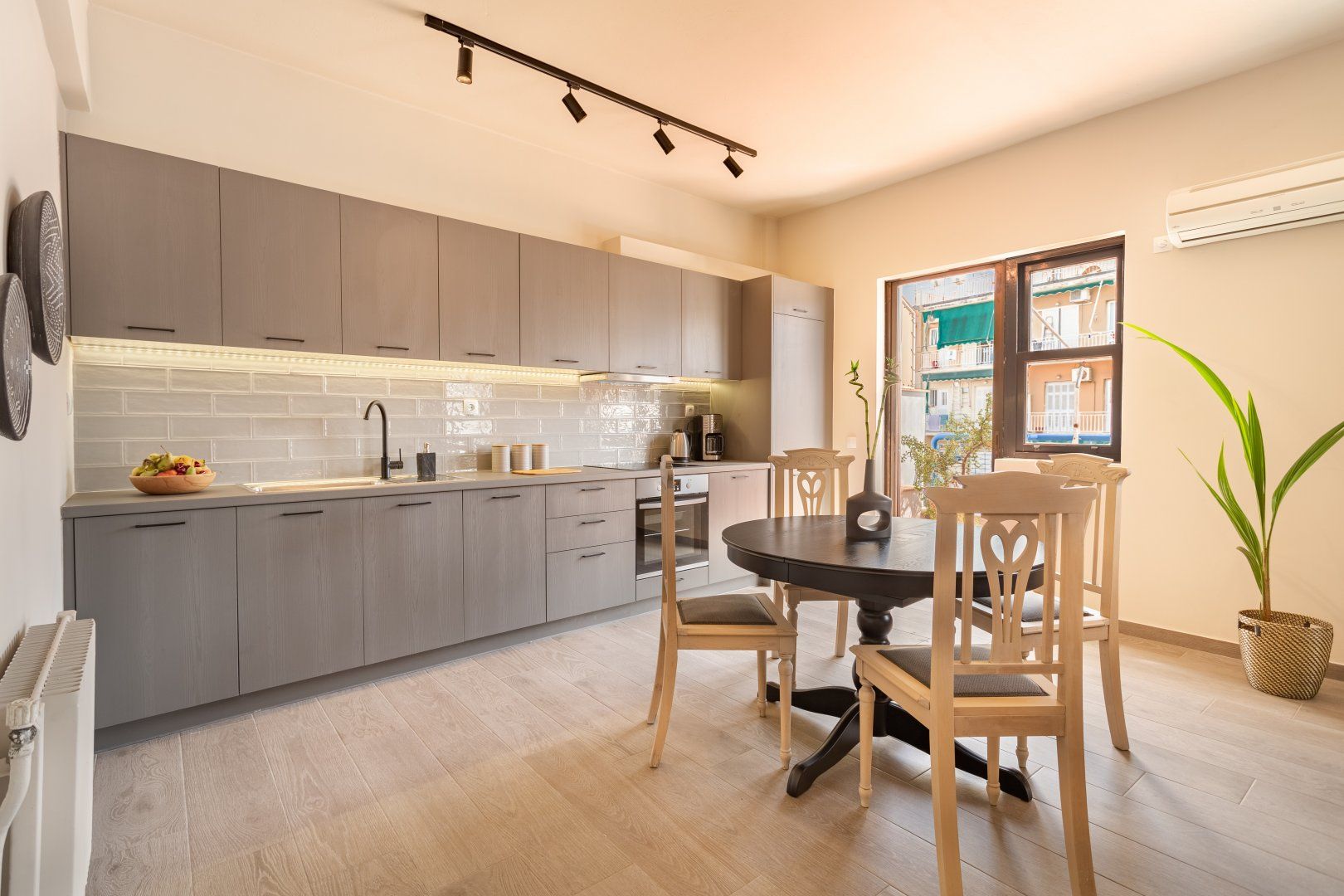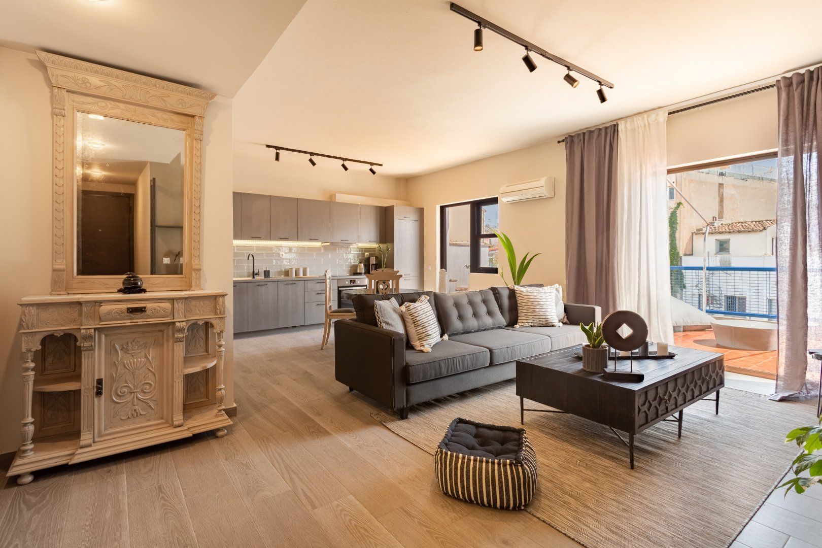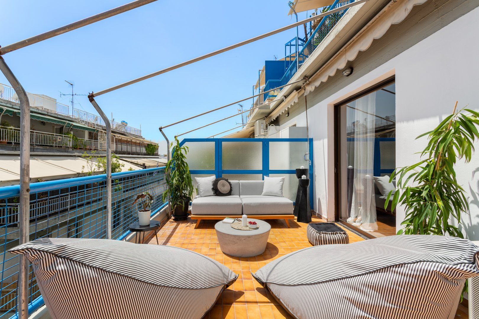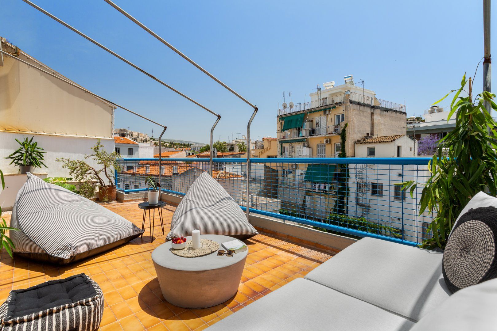 But when you're inside the apartment you wouldn't think you're in central Athens, with street noise being completely cut off from this third-floor home. So for the days when you want to relax in the lounge and enjoy the natural light flooding in from the oversized windows, you'll be pleased to know you'll have your own sanctuary in the heart of the city. But the real gem of this home is the private balcony, which feels like a slice of Middle Eastern paradise in Southern Europe. Whether you want to read a book and enjoy the Greek sunshine, or marvel at the lights of Acropolis and the Parthenon from your balcony at night, we guarantee you'll be spending a lot of time here.