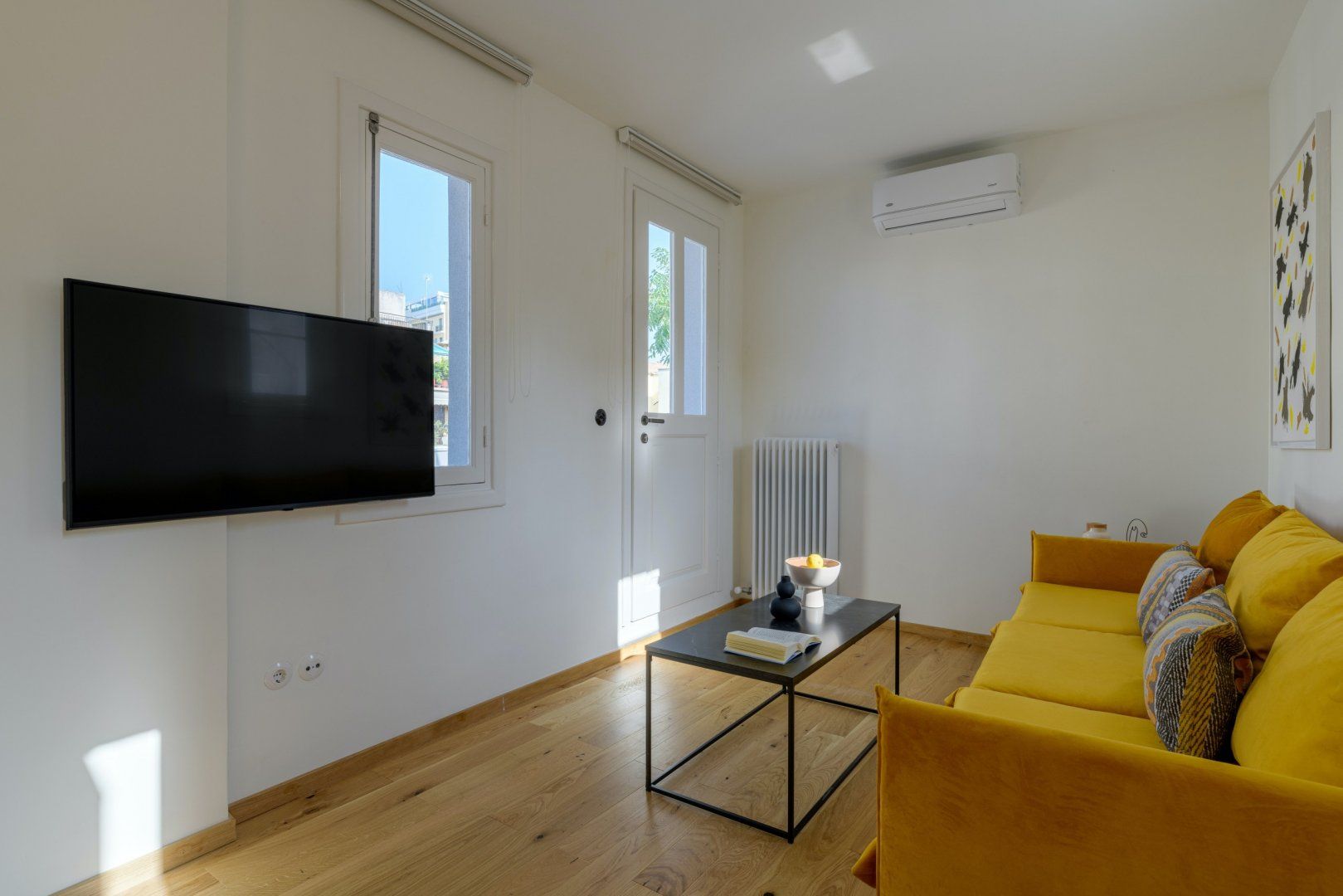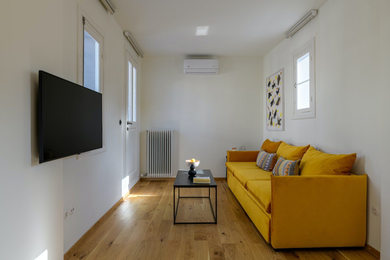 This freshly renovated apartment, housed in a beautiful 1930s building, is the ideal Greek retreat. Relax on the sunny yellow sofa or get some rest in the plush bedrooms with their velvet bed heads before getting ready in the luxurious marble-clad bathroom for an evening out in Athens.