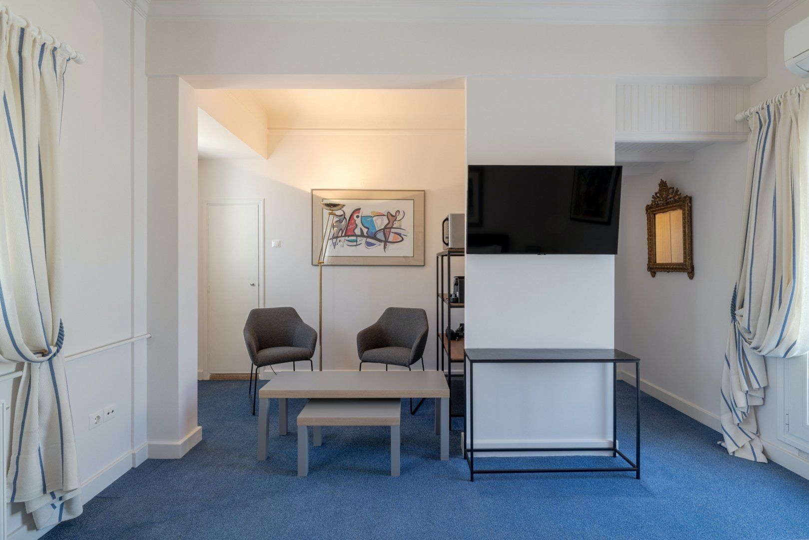 Inside your home, expect calming pops of blue and an open-concept layout that creates both functionality and flow. After treating yourself to an extra long snooze in the comfortable bed, knock up a quick breakfast at the kitchenette then enjoy on your private terrace in the glorious sunshine. While away the hours on a lounger with a good book in hand until a violet sky marks dusk over Greece’s atmospheric capital.