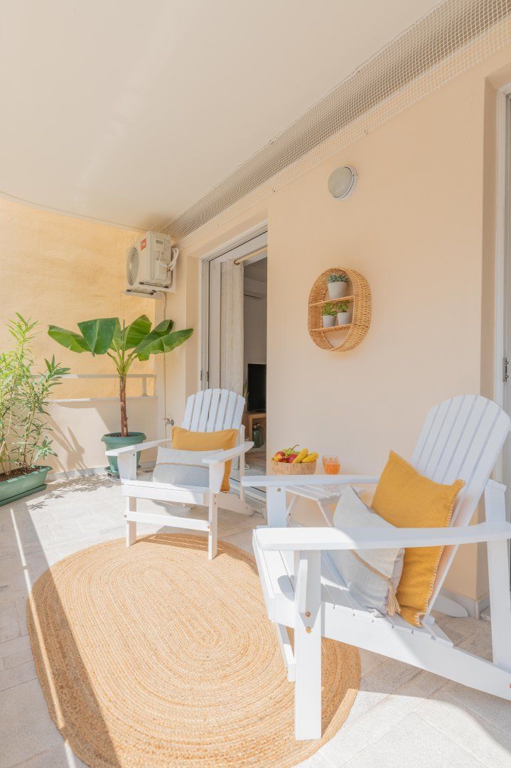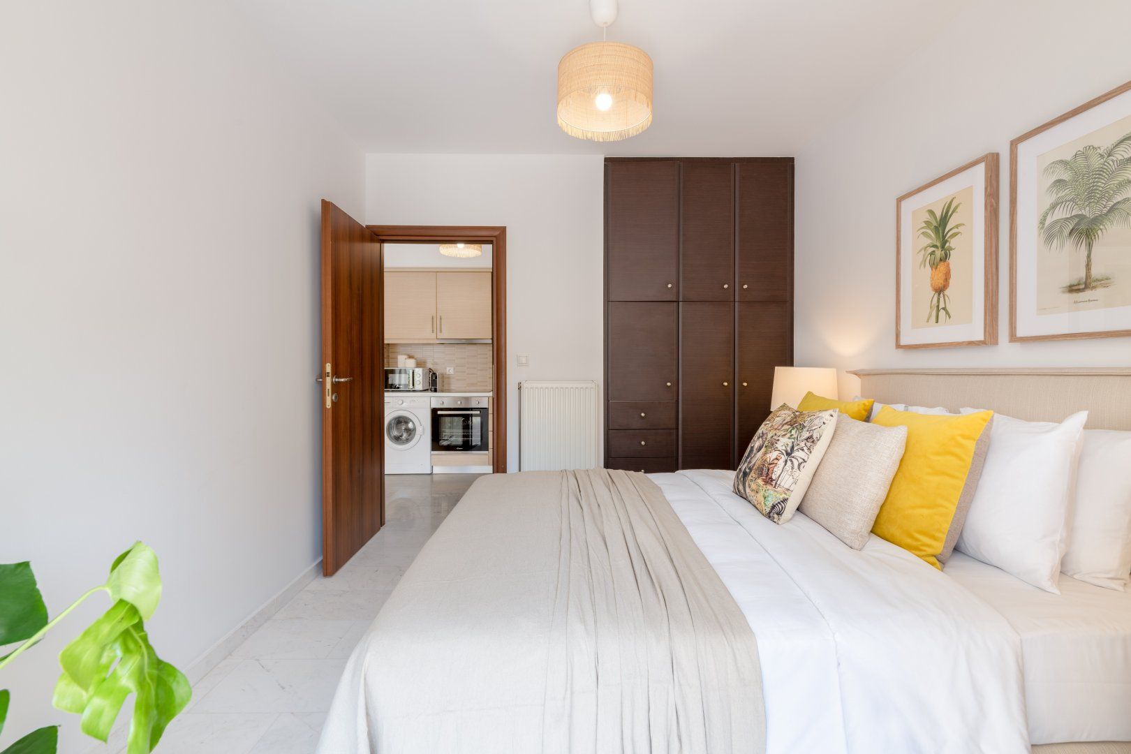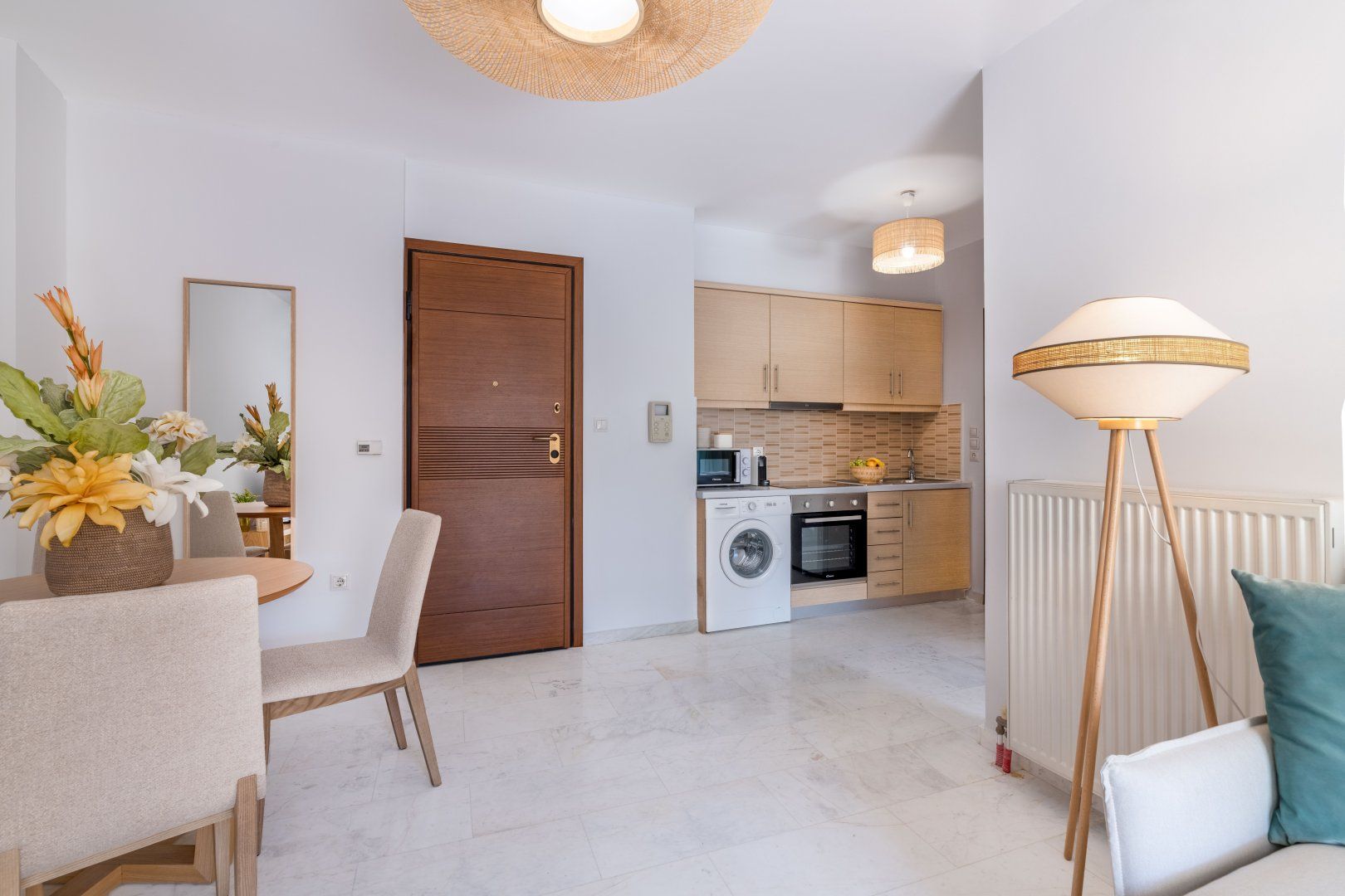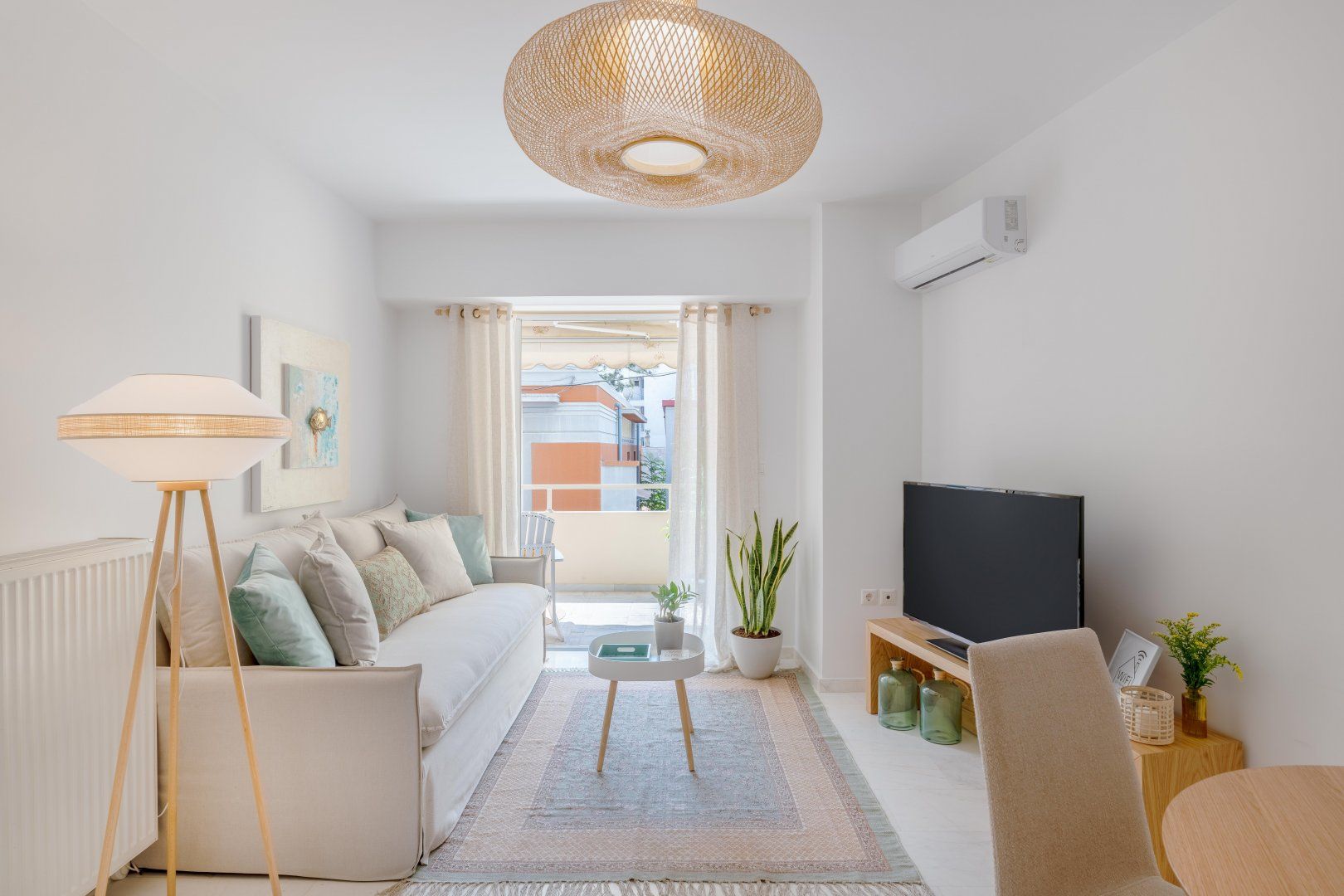 Step inside, and you'll be charmed by the soothing colour scheme and use of natural materials, which creates a truly tranquil ambiance. Refuel after your excursions with a delicious homemade meal, cooked in the sleek kitchen, and share your stories around the chic dining table. Afterwards, you can head out to the balcony and relax in the retro egg chair with a glass of Greek wine. Or, in the chillier months, get comfy on the sofa and catch up on your favourite Netflix shows.