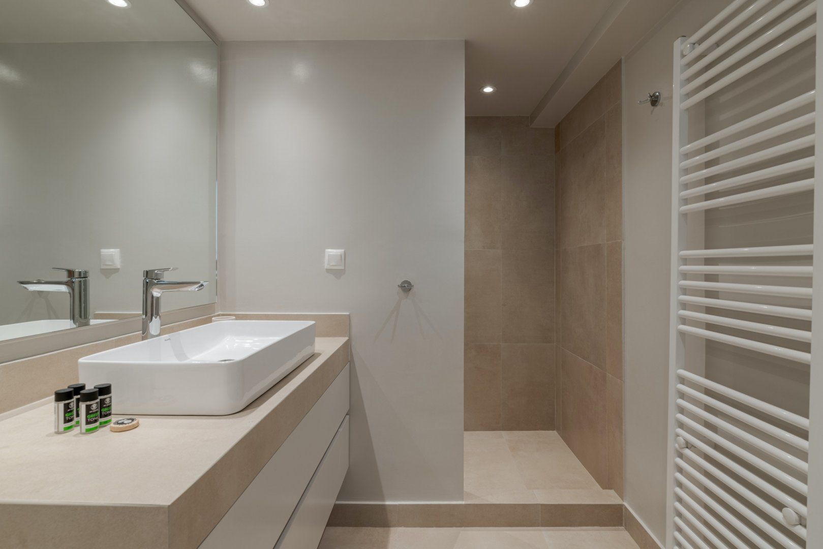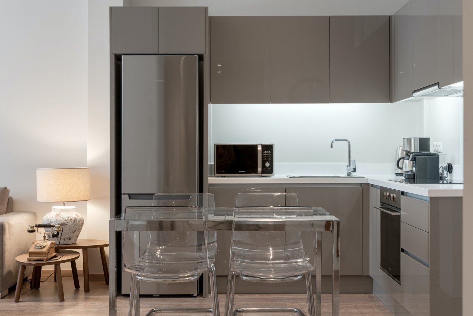 Inside the apartment, calm neutral colours set an inviting scene in the open-plan living area where a large sofa invites you to kick back and relax after a busy day of sightseeing. The sleek kitchen area is perfect for whipping up Greek snacks when you’re not out sampling the local restaurants, while the building’s communal terrace with its Acropolis views provides the ideal setting for a sunset drink.