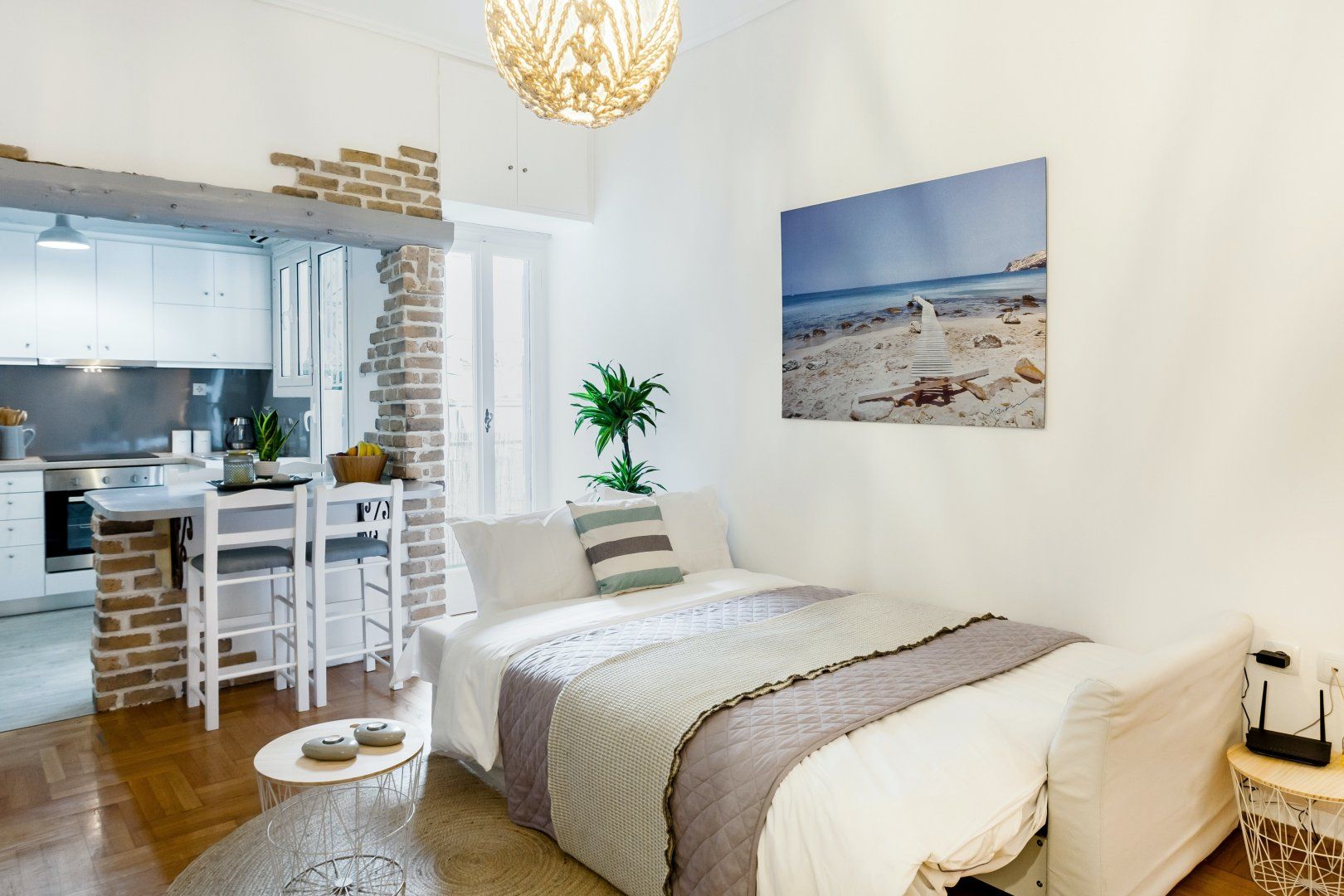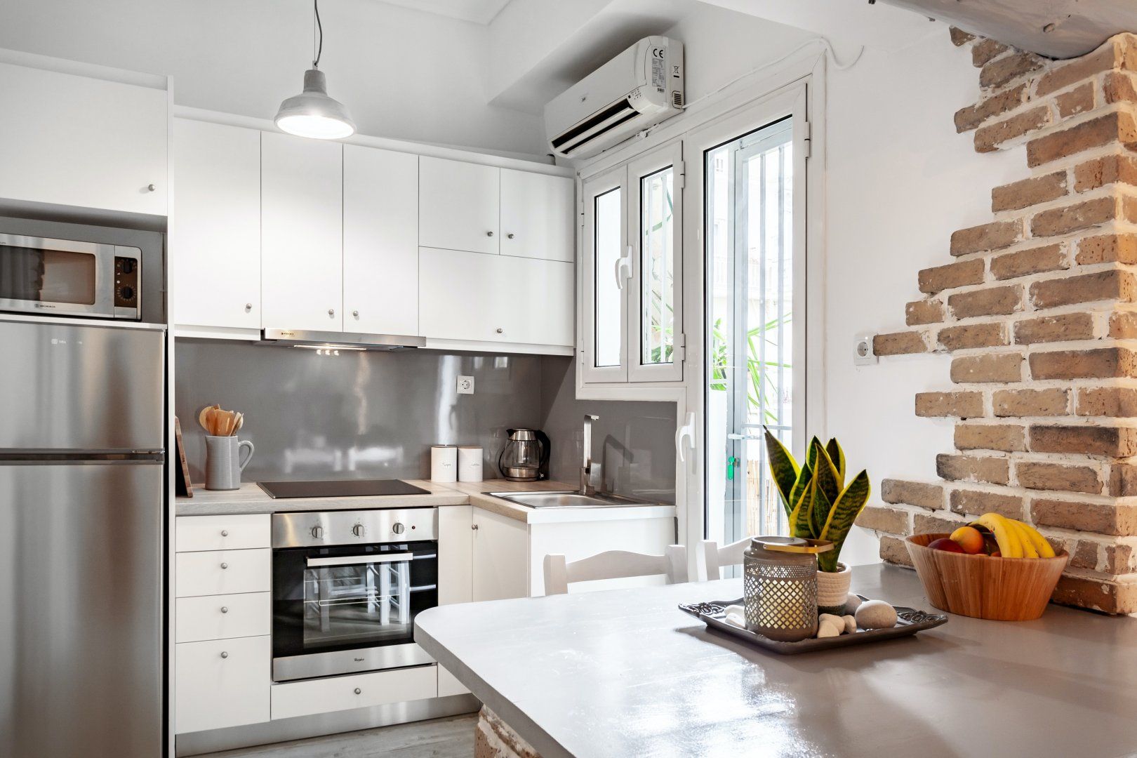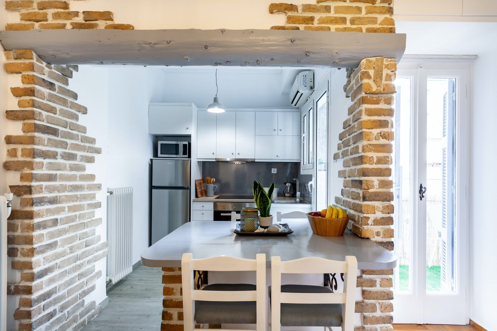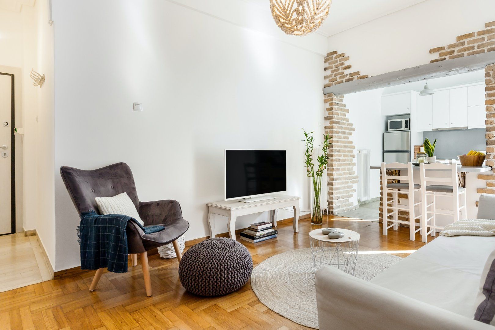 Parquet floors and exposed brick bring a cosy old-time feel to the home, while modernity is achieved through sleek Scandinavian-style furniture and a fresh colour palette. Enjoy quiet evenings curled up on the sofa as your favourite film streams on Netflix, then retire to the restful bedroom after a sip or two of ouzo.