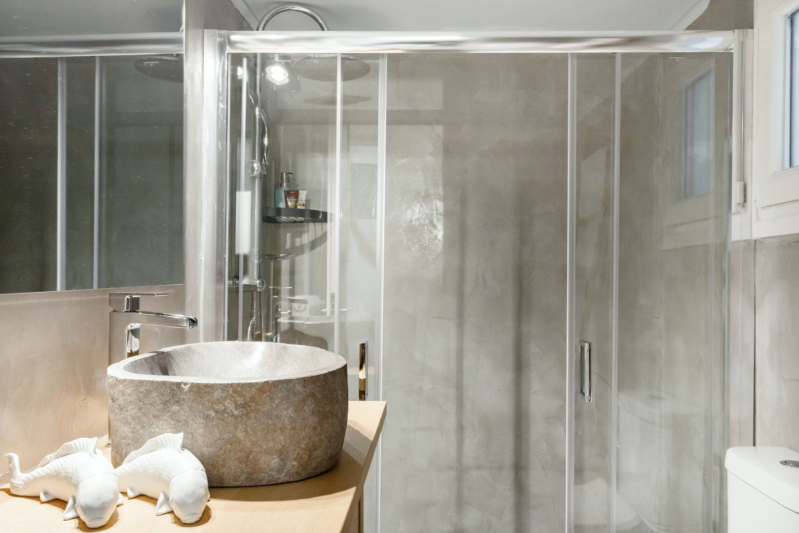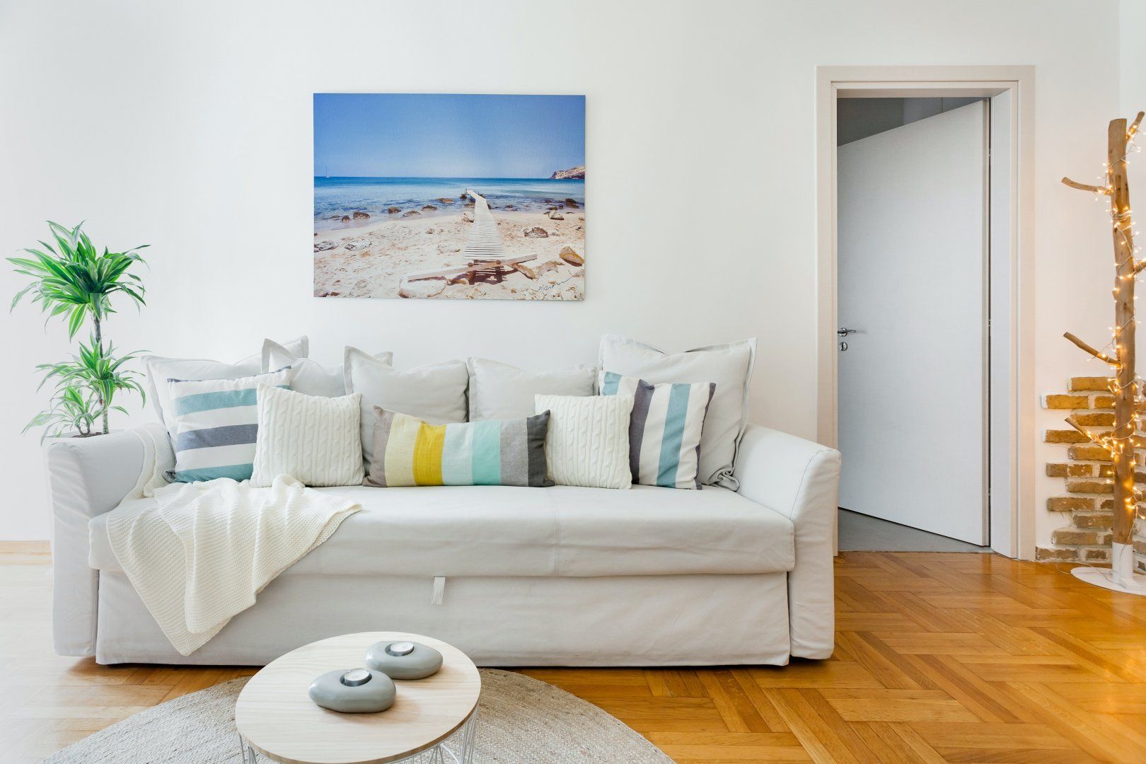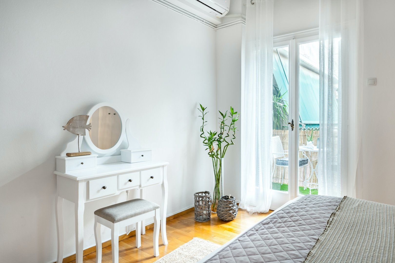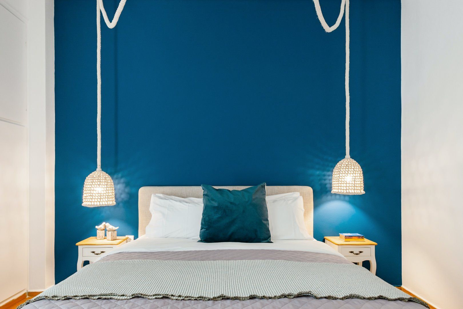 Parquet floors and exposed brick bring a cosy old-time feel to the home, while modernity is achieved through sleek Scandinavian-style furniture and a fresh colour palette. Enjoy quiet evenings curled up on the sofa as your favourite film streams on Netflix, then retire to the restful bedroom after a sip or two of ouzo.