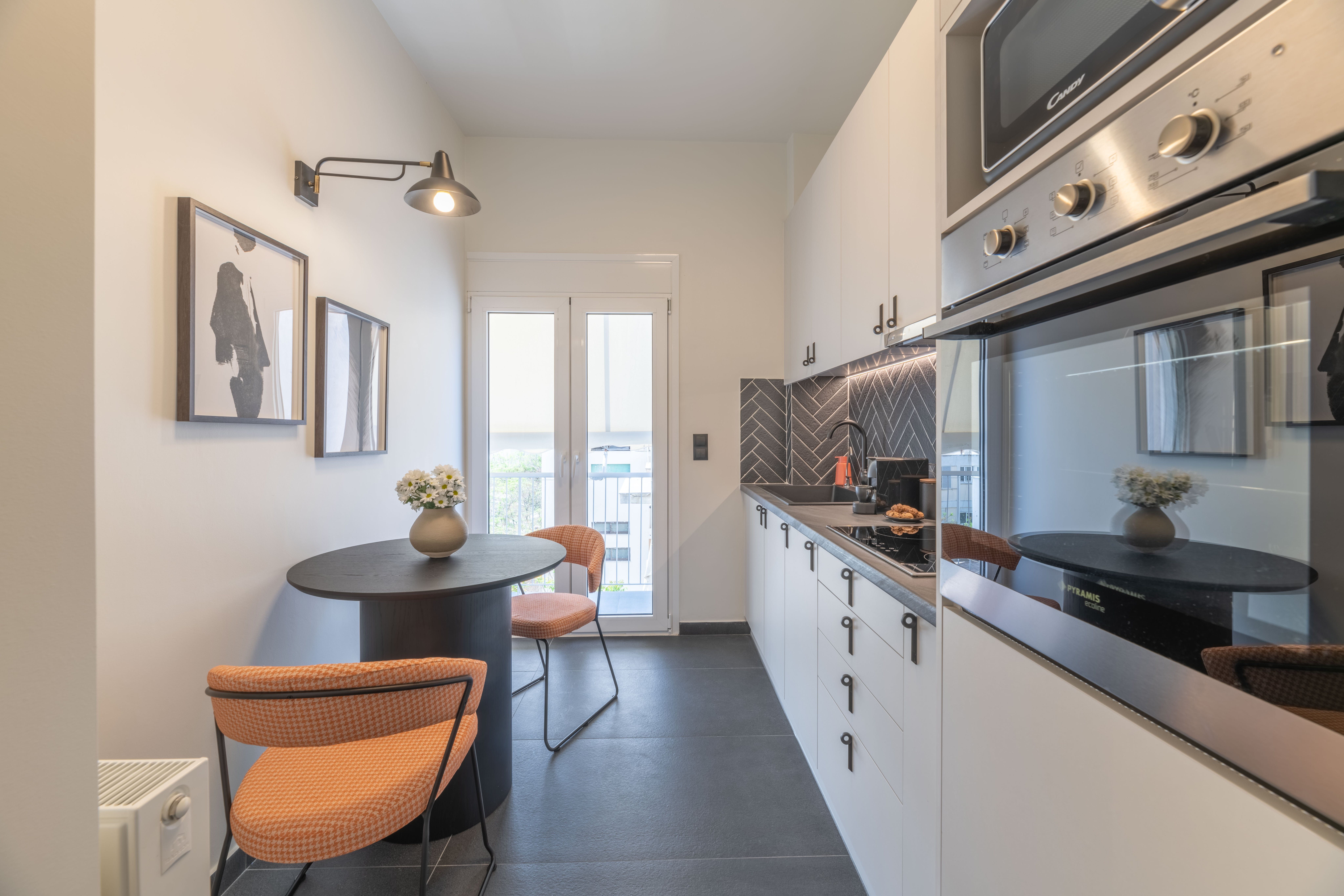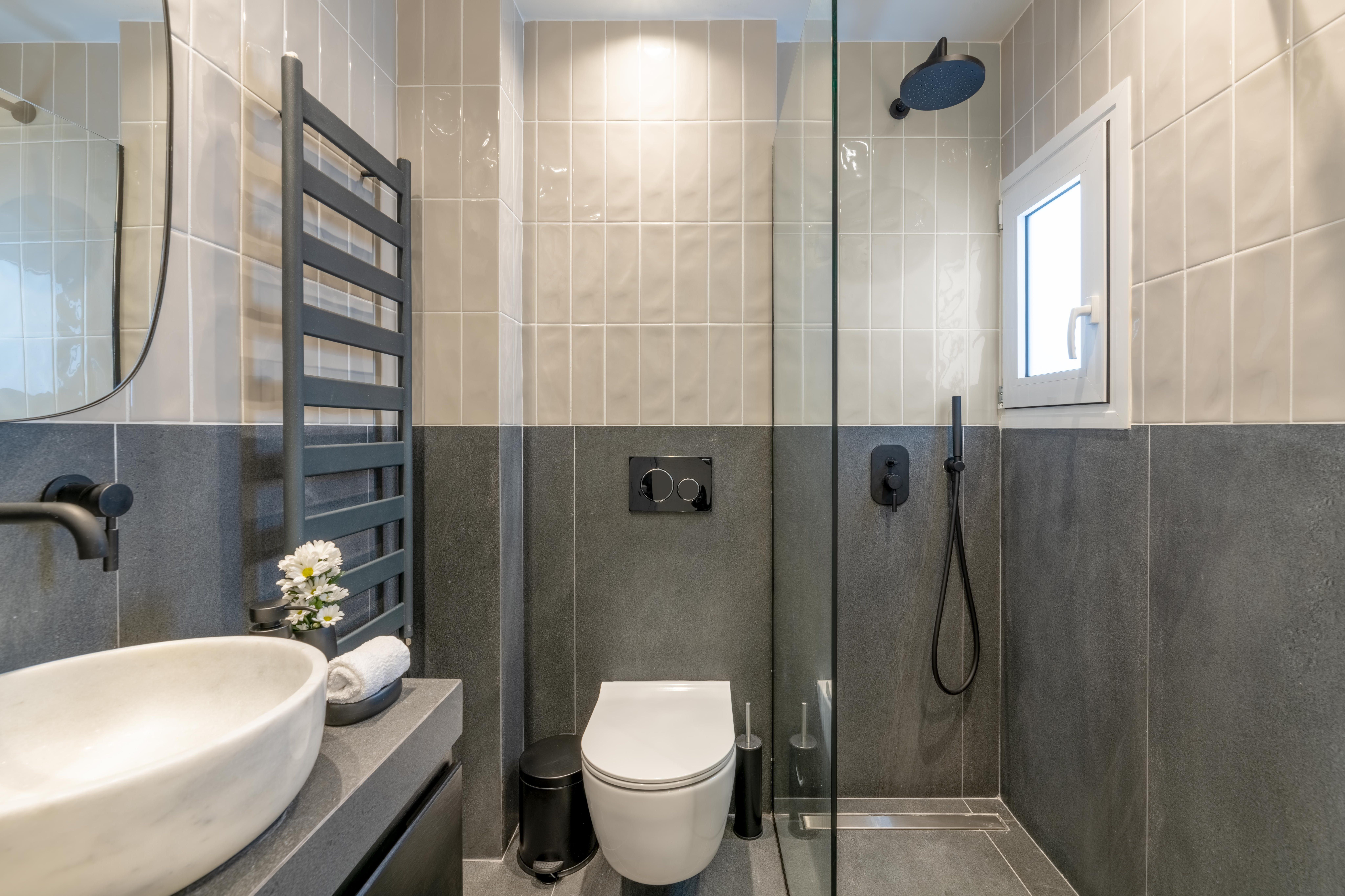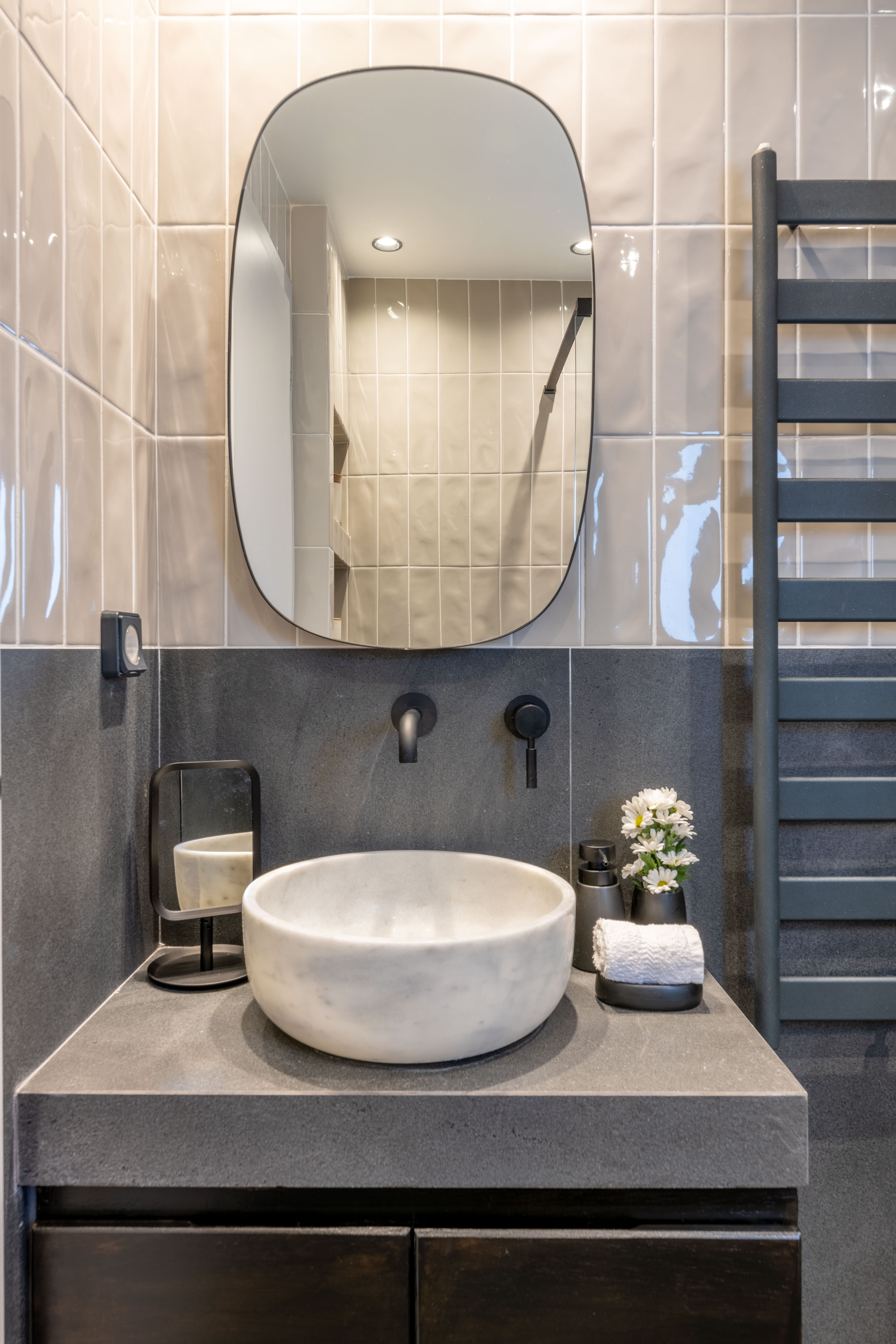 Rather impressively, the interior lives up to this impressive outdoor space. The design is fresh and contemporary, with white walls broken up by monochrome artwork and green house plants. The kitchen is both sleek and decently sized compared to other apartments of a similar size, while the grey bathroom wouldn't look out of place in some of the city's most coveted hotels.