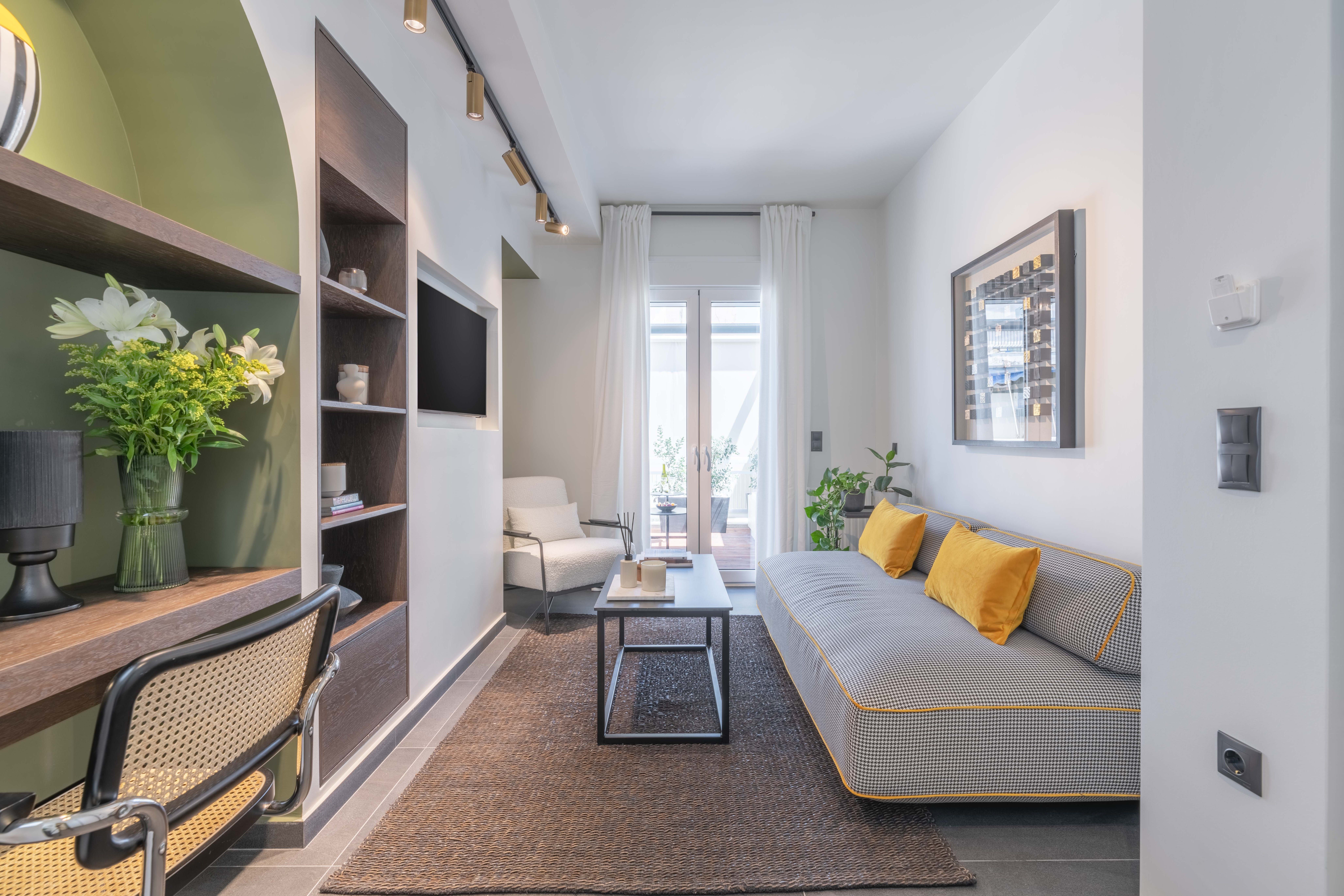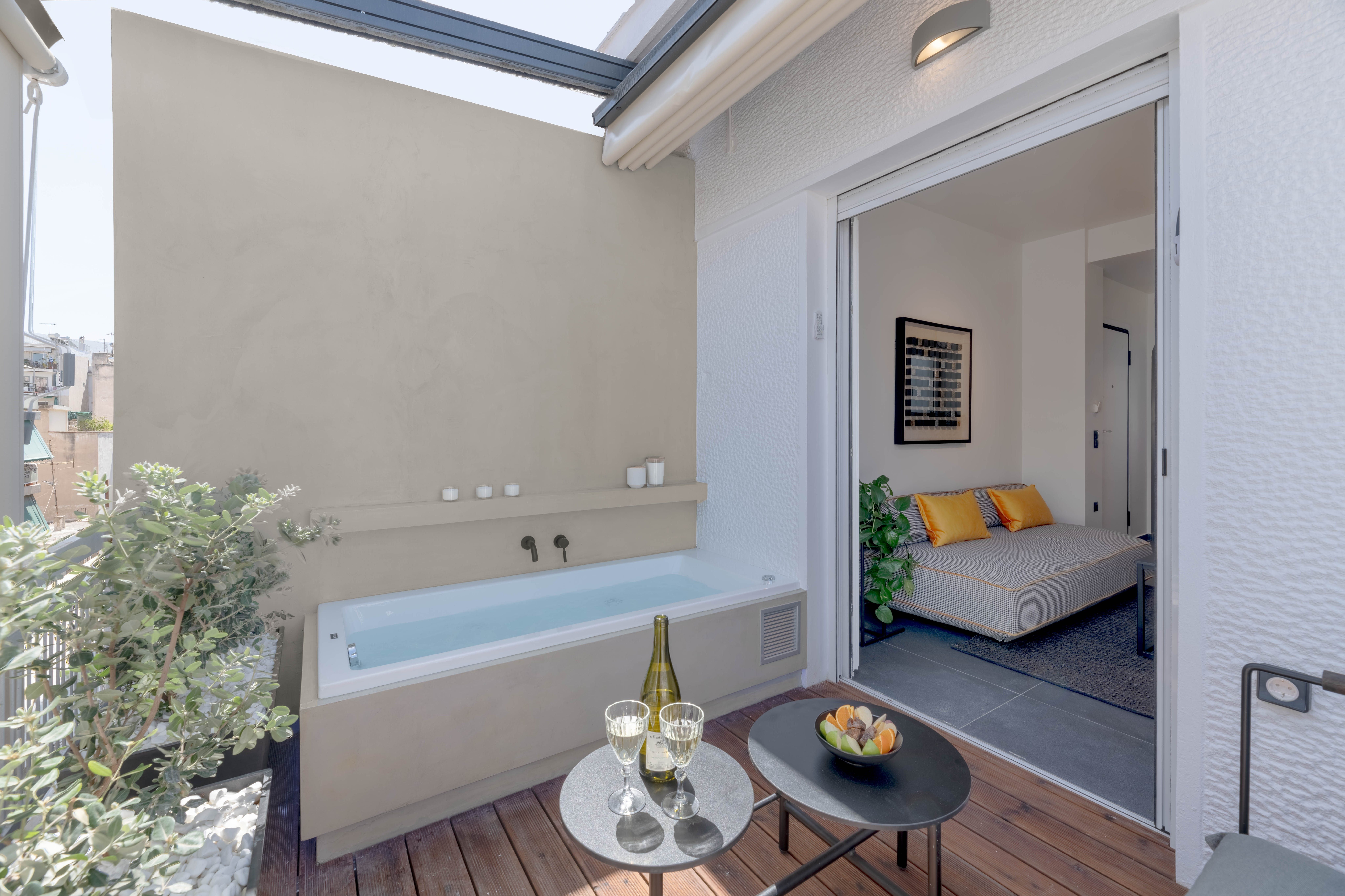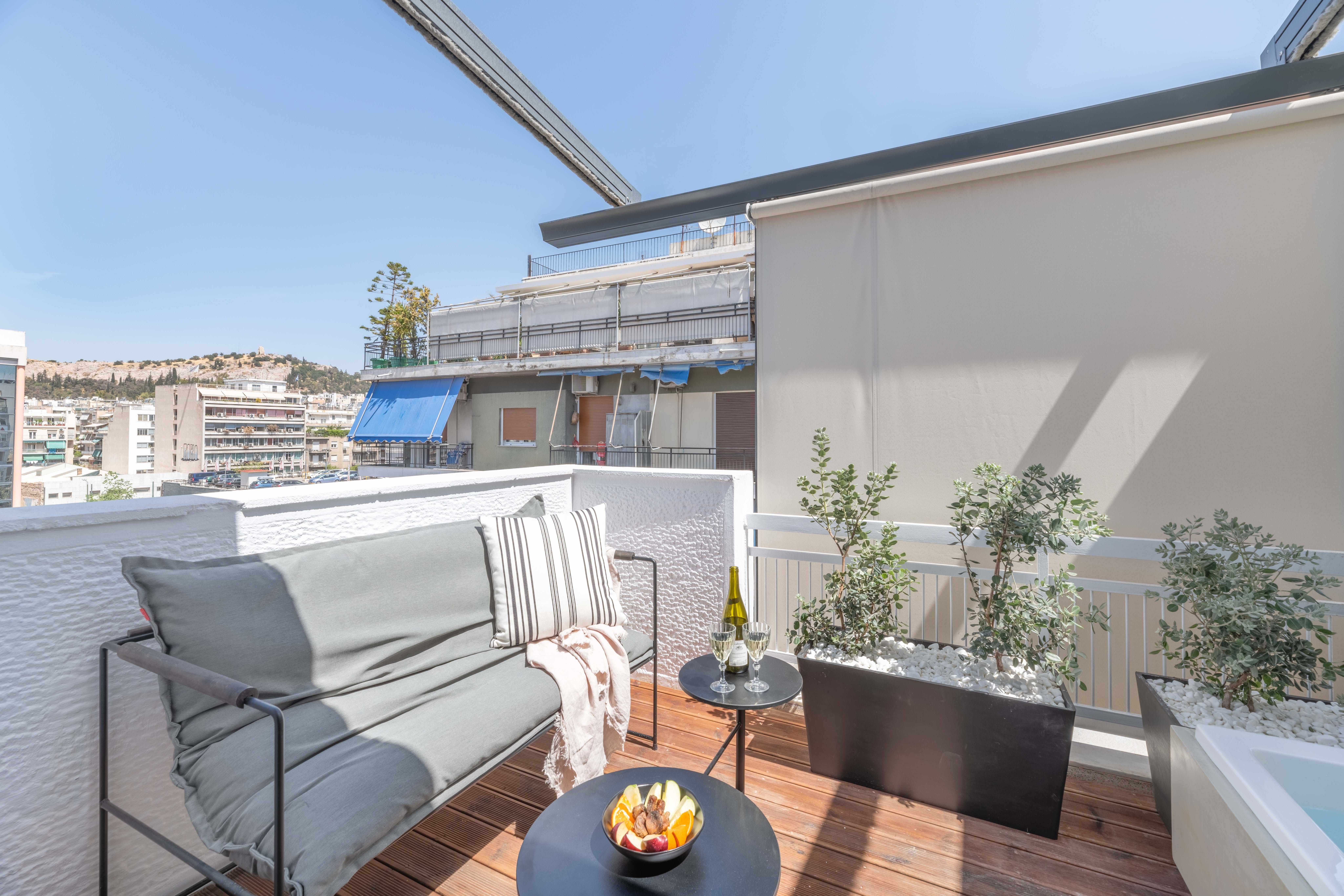 There's an awful lot riding in this apartment's favour. First, there's the fact that it's up on the top floor of the building and there are superb views of Filopapou Hill to be enjoyed from the balcony. What's more, there's plenty of seating in this space from which to admire the landscape, as well as a hot tub big enough for two.