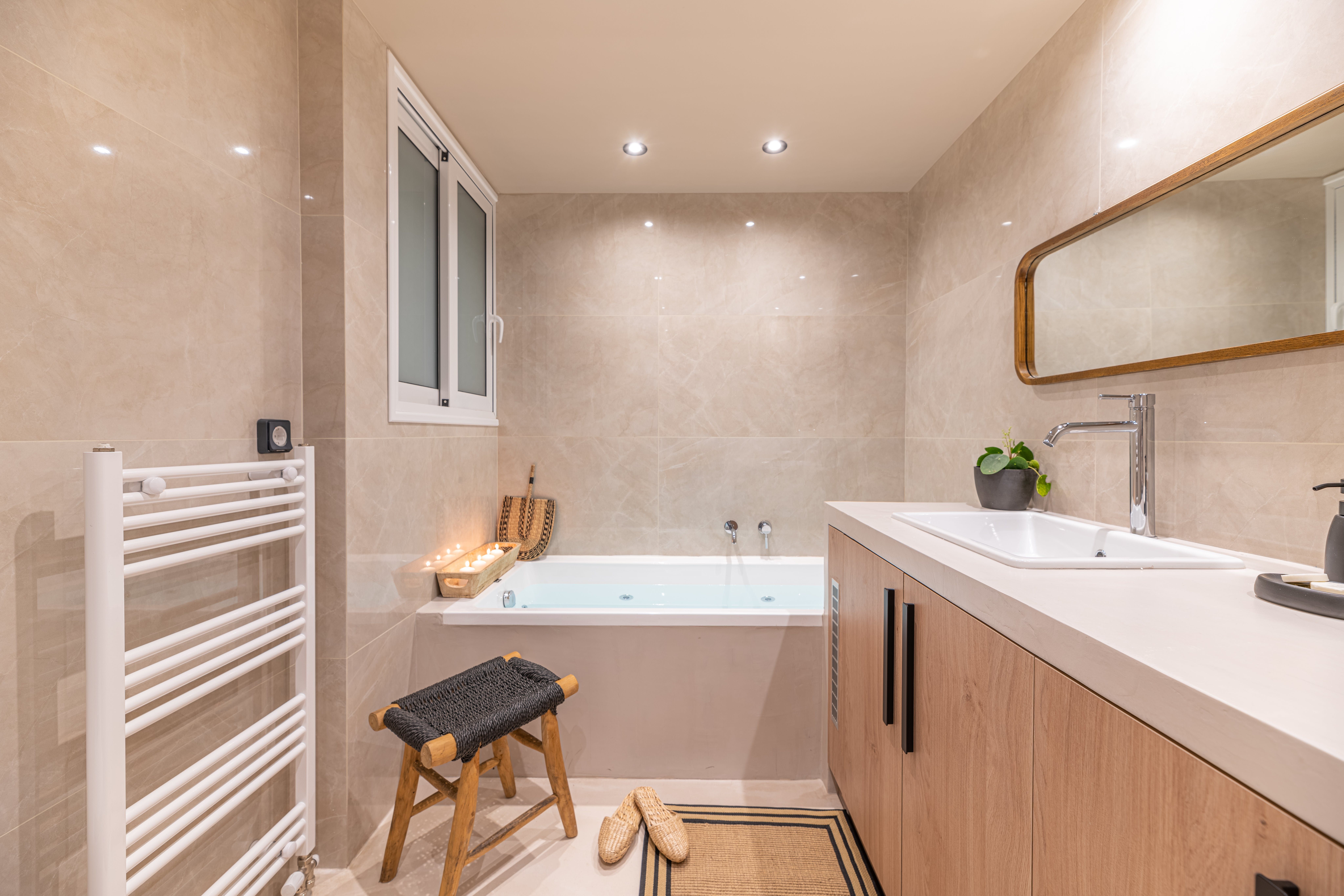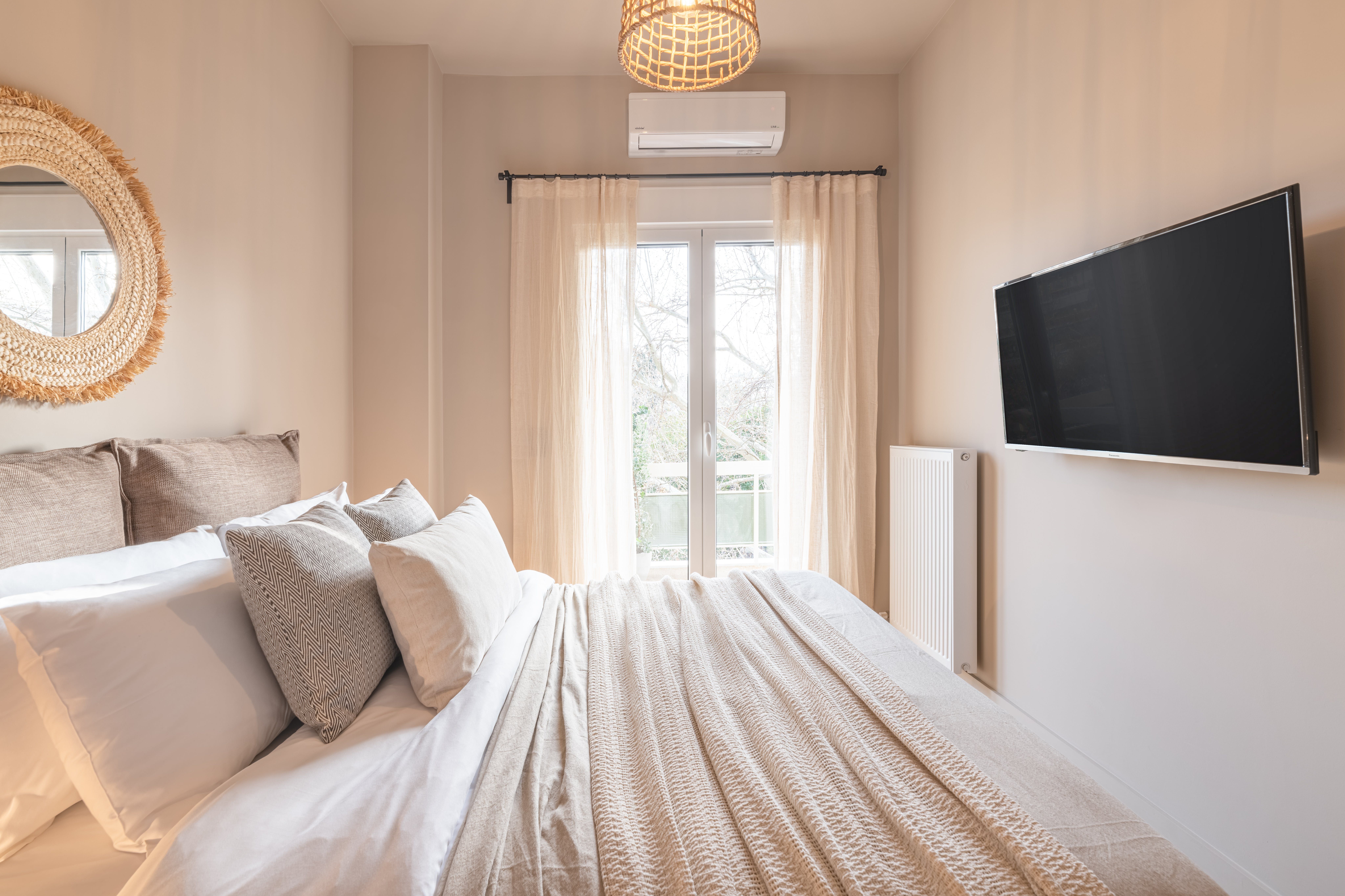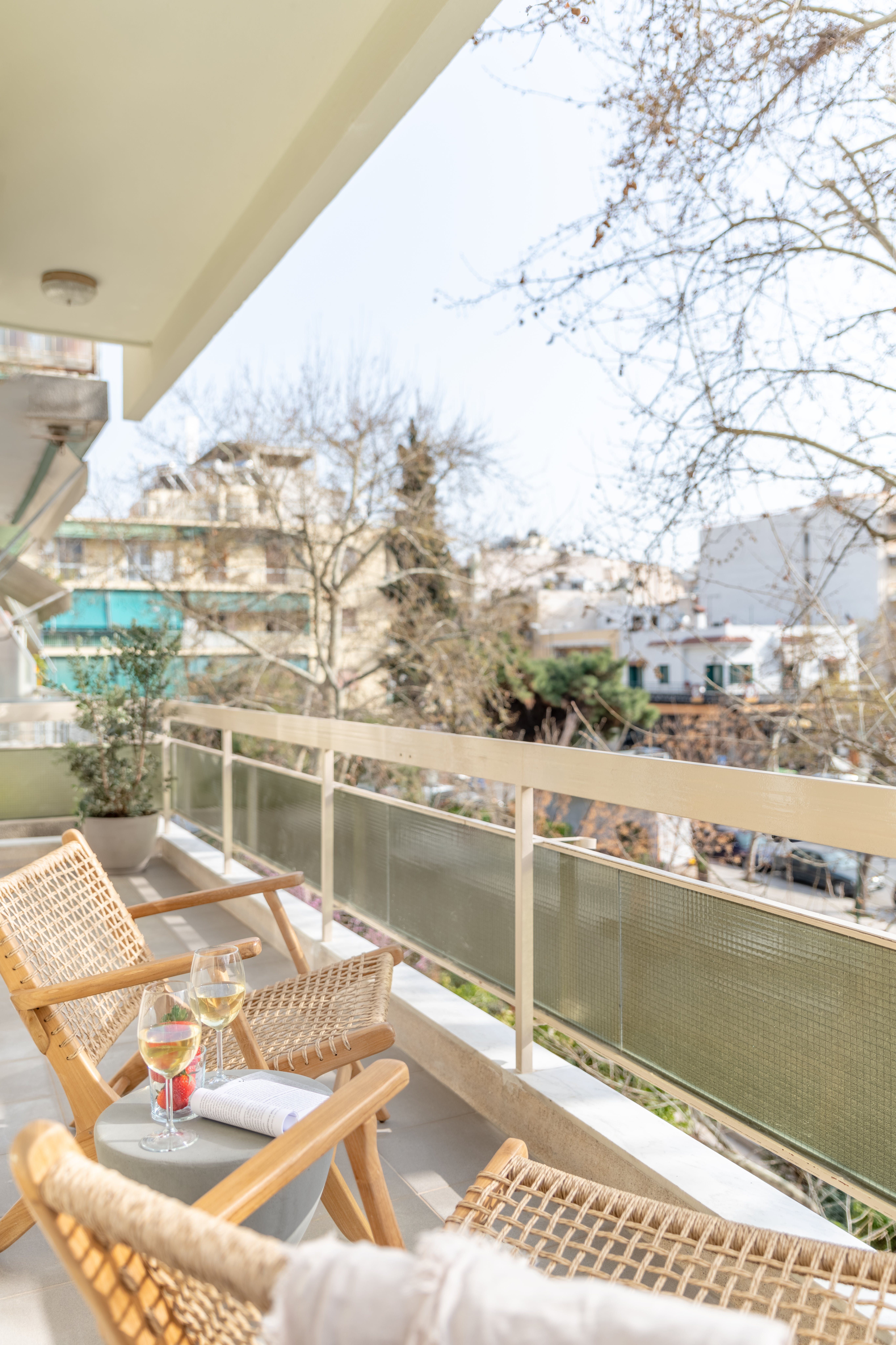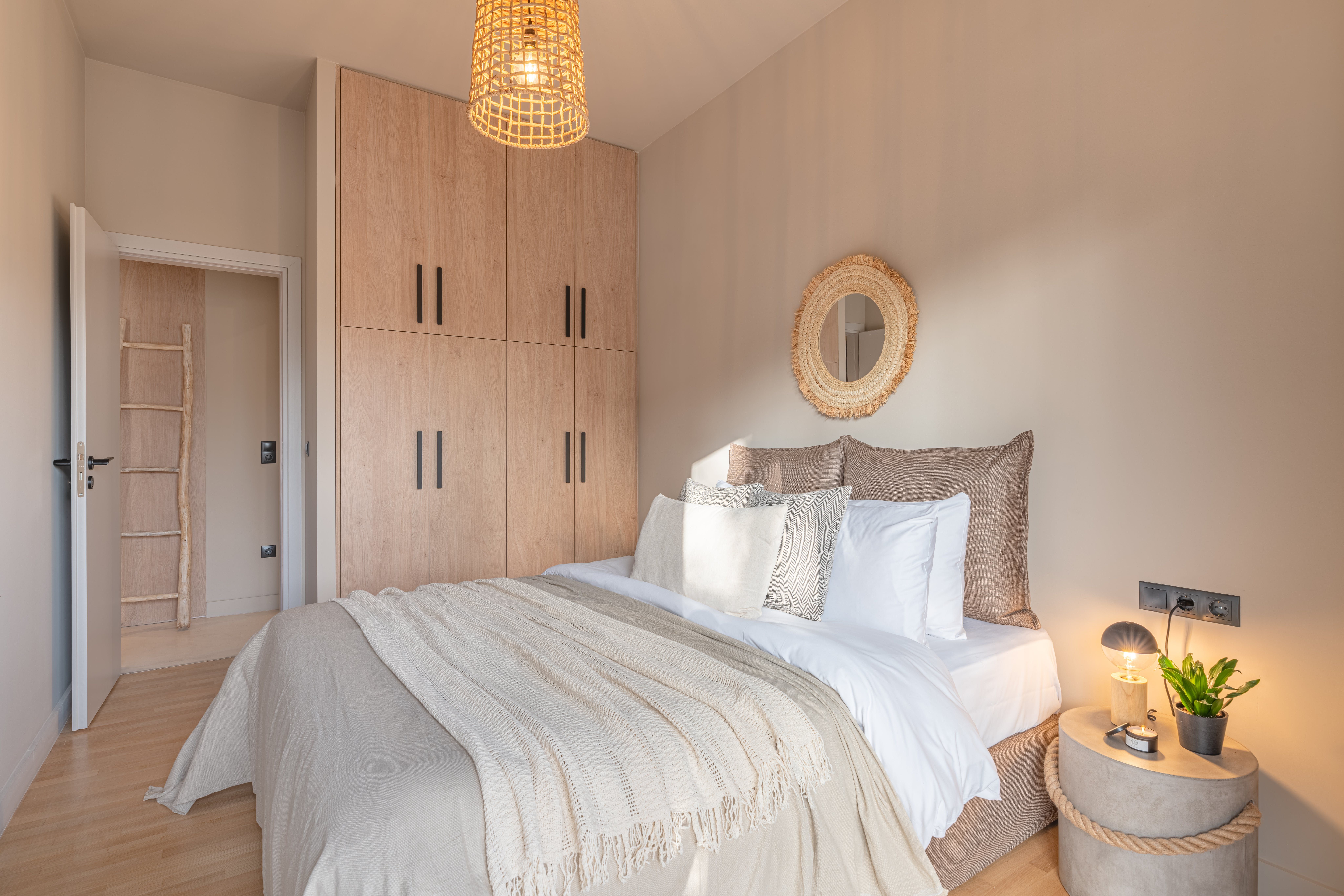 From its wood floors to its rattan rug and leafy houseplants, there’s a feeling of warmth to the home’s carefully curated decor that feels instantly welcoming. We love how much natural light fills the open-plan living area, thanks to the glass doors that lead out onto a private balcony. Sit here each morning with your cup of coffee while taking in views over the neighbourhood’s rooftops, or gather at sunset for an alfresco sundowner before enjoying a meal around the dining table for an at-home feast.