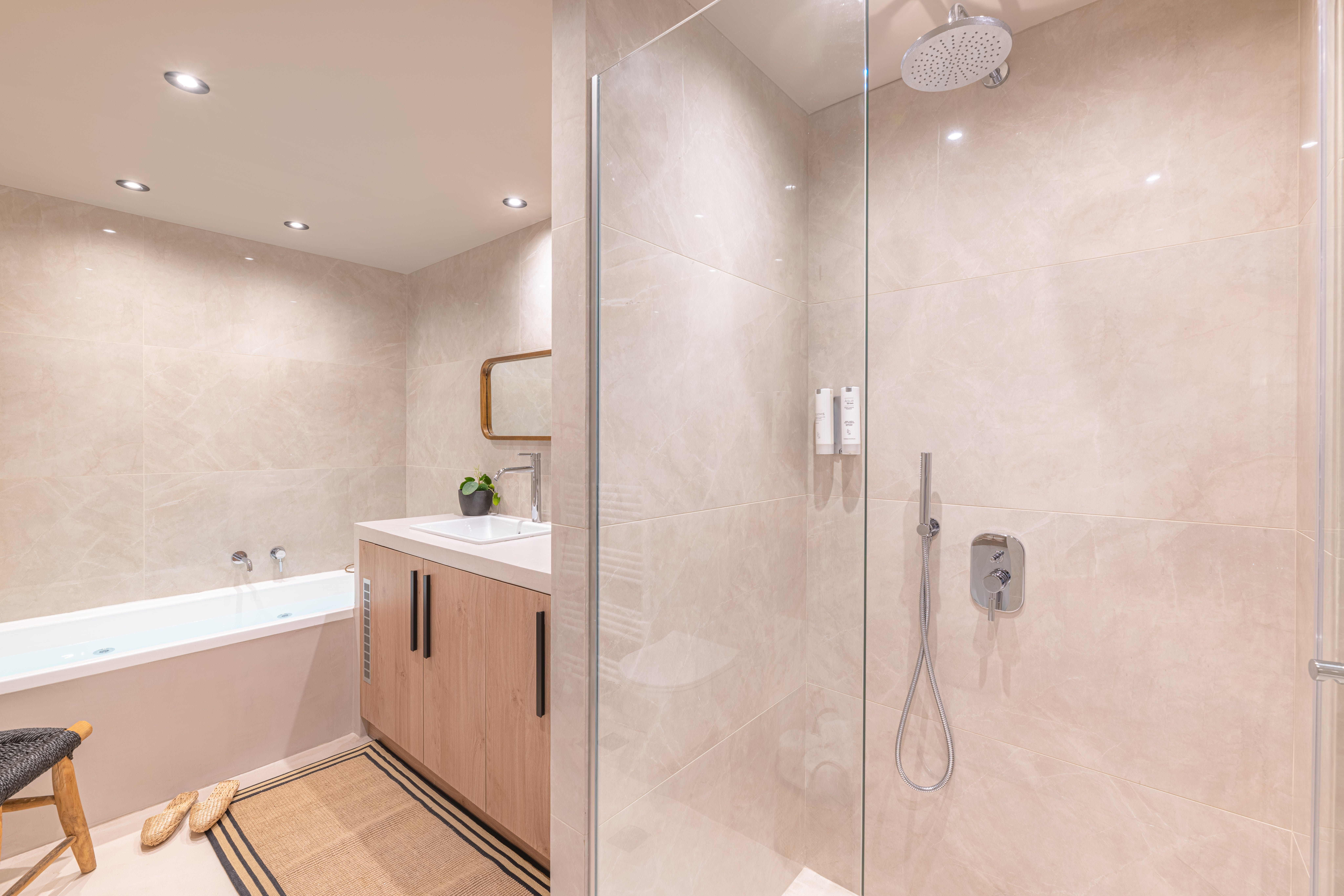 The two bedrooms, too, are just as chic with their luxuriously dressed beds and balcony access, while the bathroom’s rainfall shower and whirlpool tub offer the perfect relaxing bookends for any day.