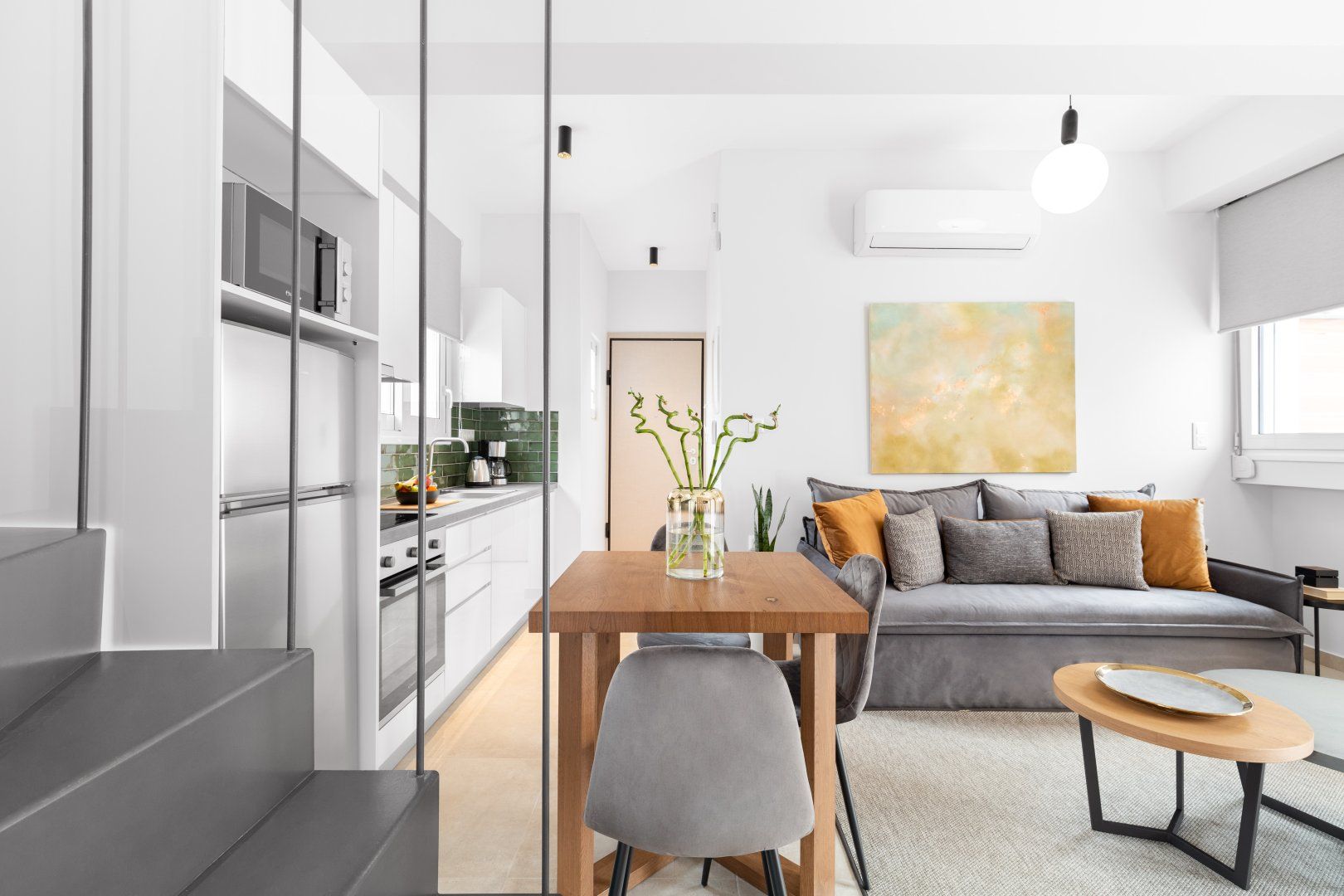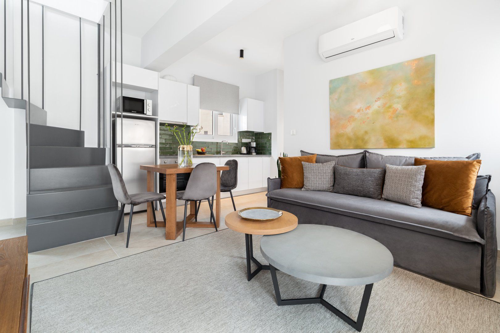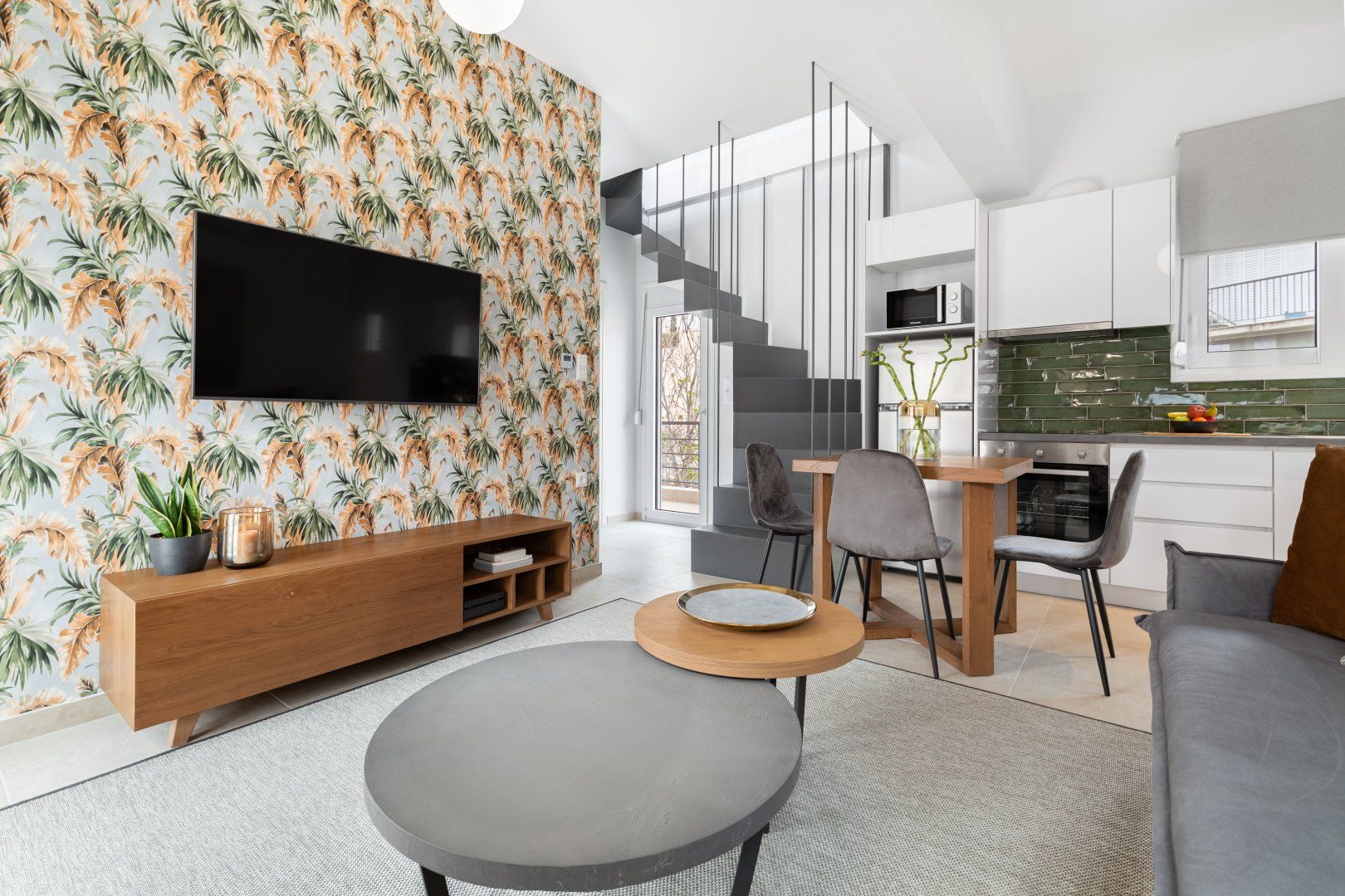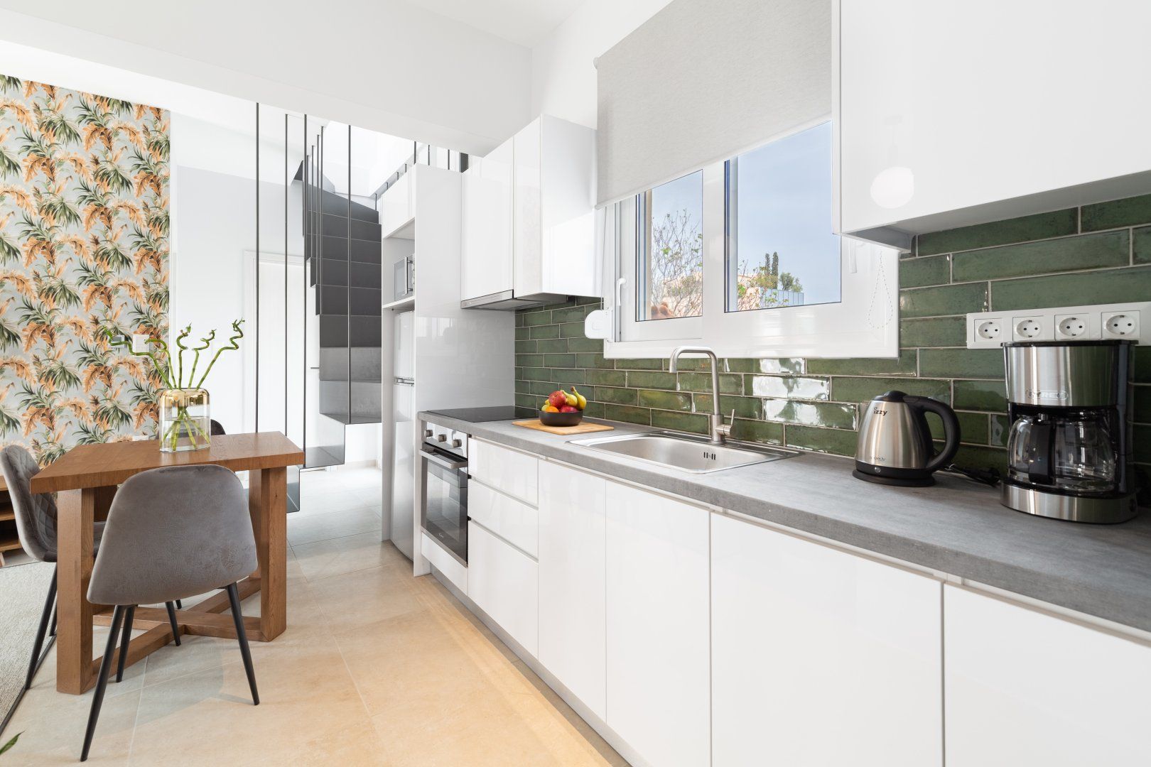 Inside, a soothing medley of crisp white and slate grey keeps things feeling modern and sunny. We love the tropical feature wall in the living room which adds a pop of colour and vibrance. The compact kitchen with pretty emerald tiles has all the essentials for self-catering and there’s a second outdoor space for dinners on the balcony. That’s if you’re not too busy exploring the meze restaurants of the Plaka, a five-minute walk away. But the real highlight of this apartment is how close it is to the Acropolis, just four minutes on foot to the entrance.