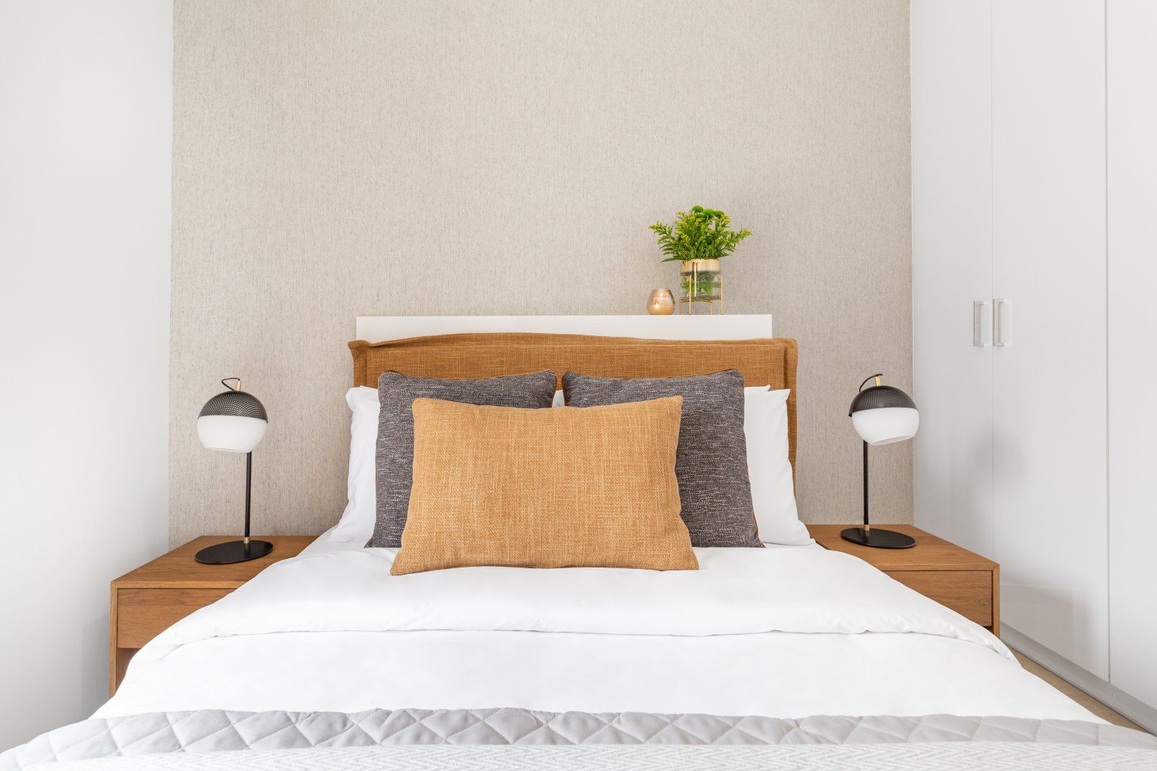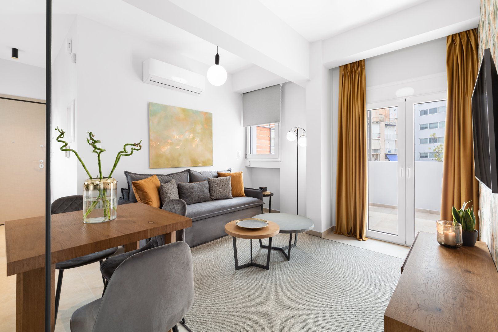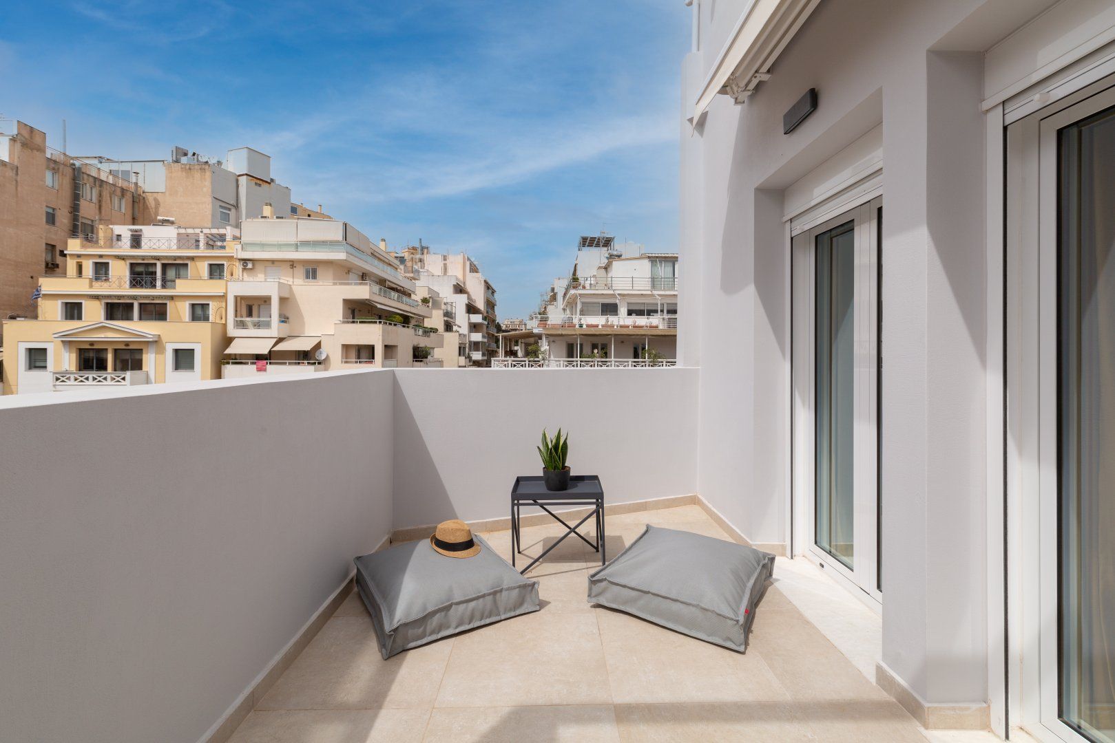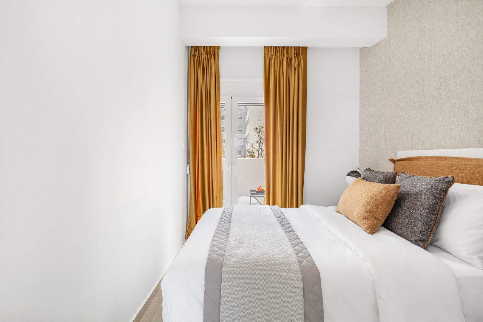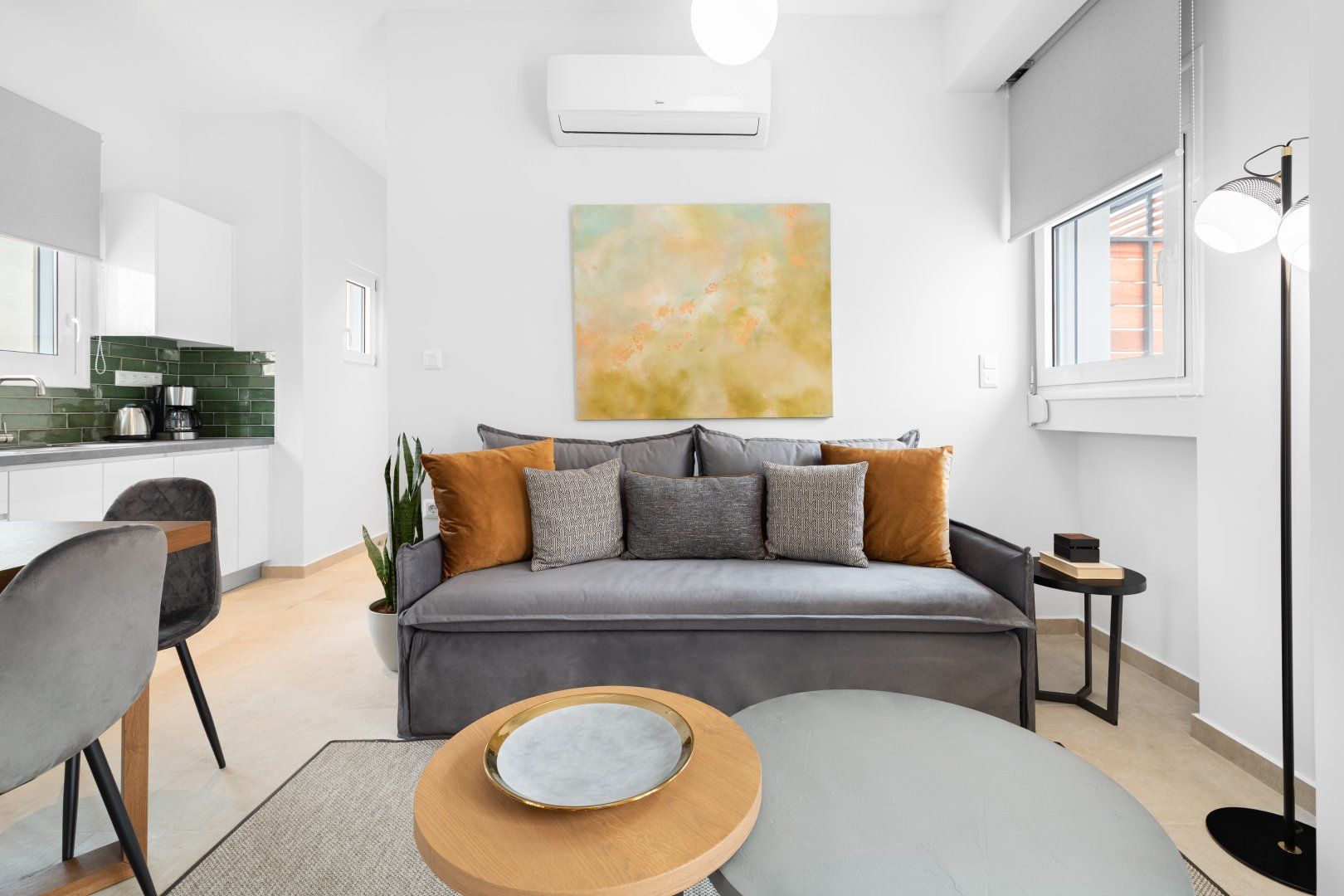 Inside, a soothing medley of crisp white and slate grey keeps things feeling modern and sunny. We love the tropical feature wall in the living room which adds a pop of colour and vibrance. The compact kitchen with pretty emerald tiles has all the essentials for self-catering and there’s a second outdoor space for dinners on the balcony. That’s if you’re not too busy exploring the meze restaurants of the Plaka, a five-minute walk away. But the real highlight of this apartment is how close it is to the Acropolis, just four minutes on foot to the entrance.