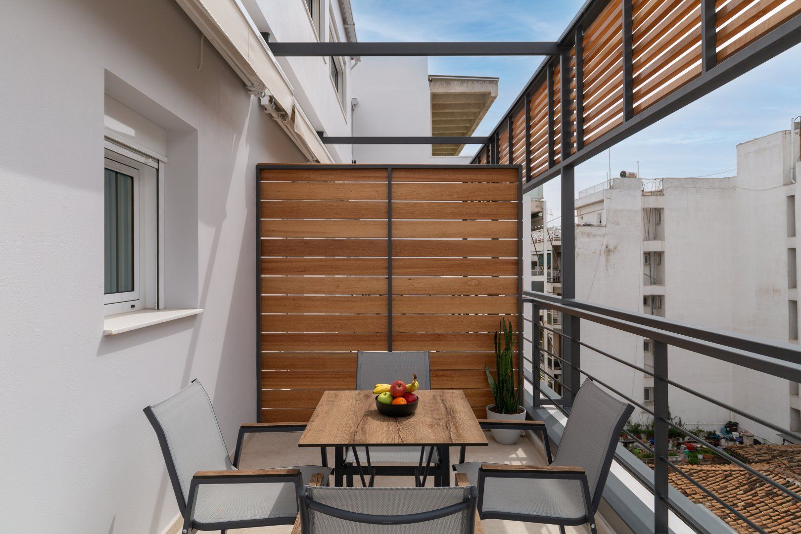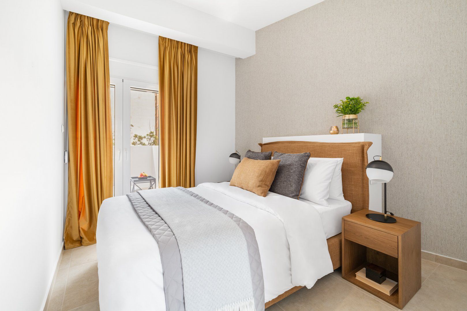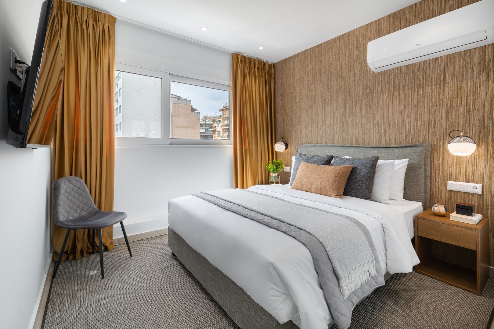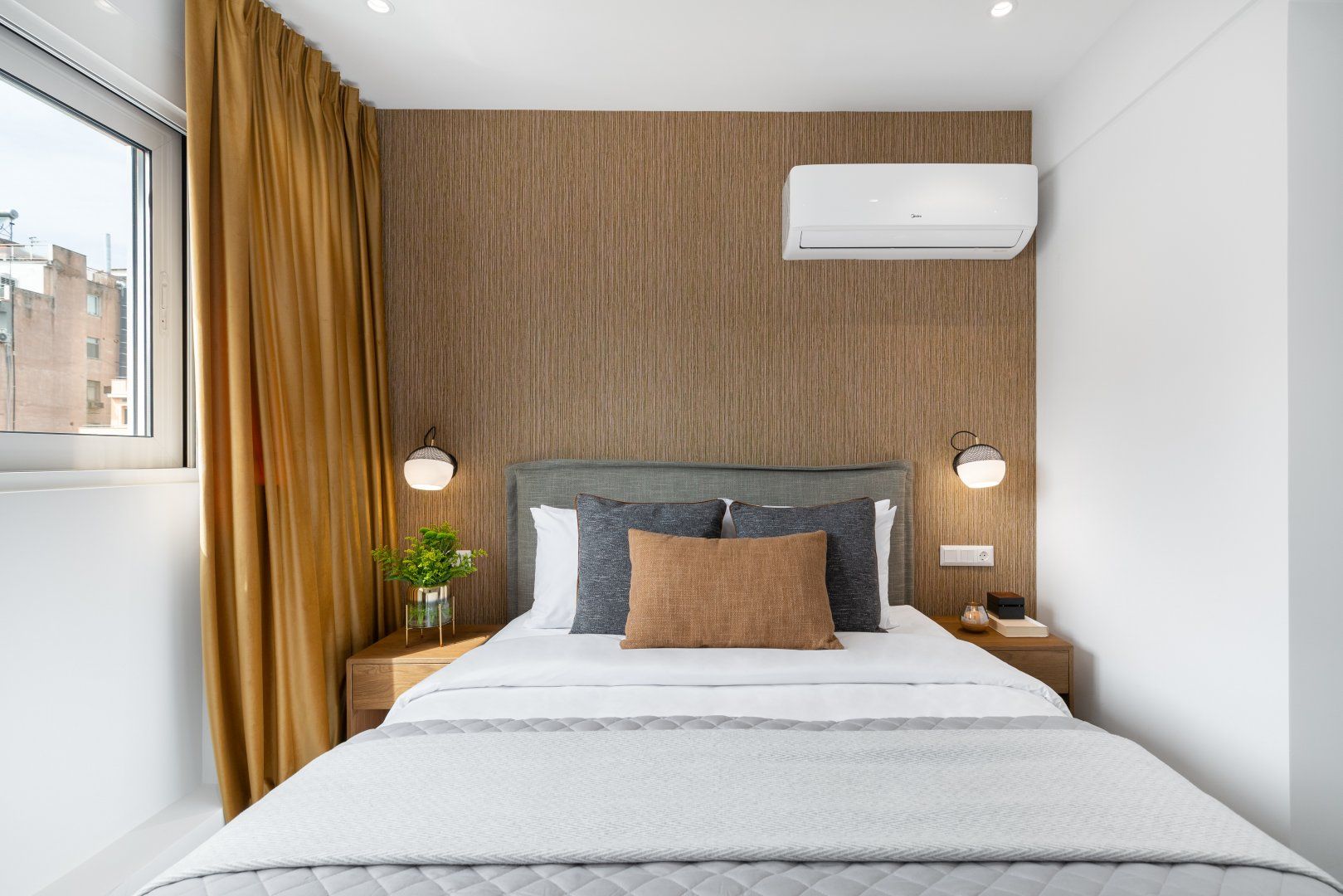 Inside, a soothing medley of crisp white and slate grey keeps things feeling modern and sunny. We love the tropical feature wall in the living room which adds a pop of colour and vibrance. The compact kitchen with pretty emerald tiles has all the essentials for self-catering and there’s a second outdoor space for dinners on the balcony. That’s if you’re not too busy exploring the meze restaurants of the Plaka, a five-minute walk away. But the real highlight of this apartment is how close it is to the Acropolis, just four minutes on foot to the entrance.