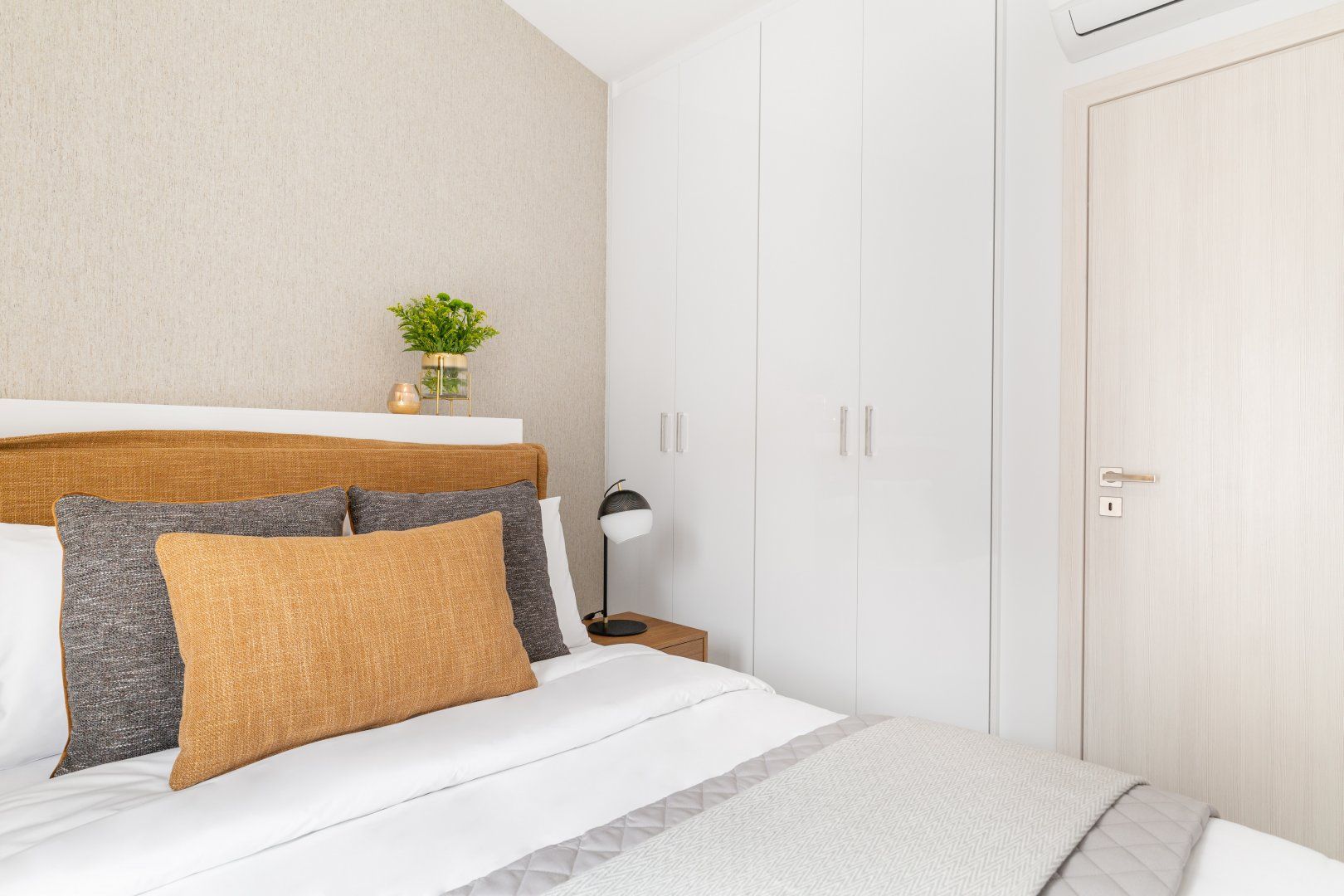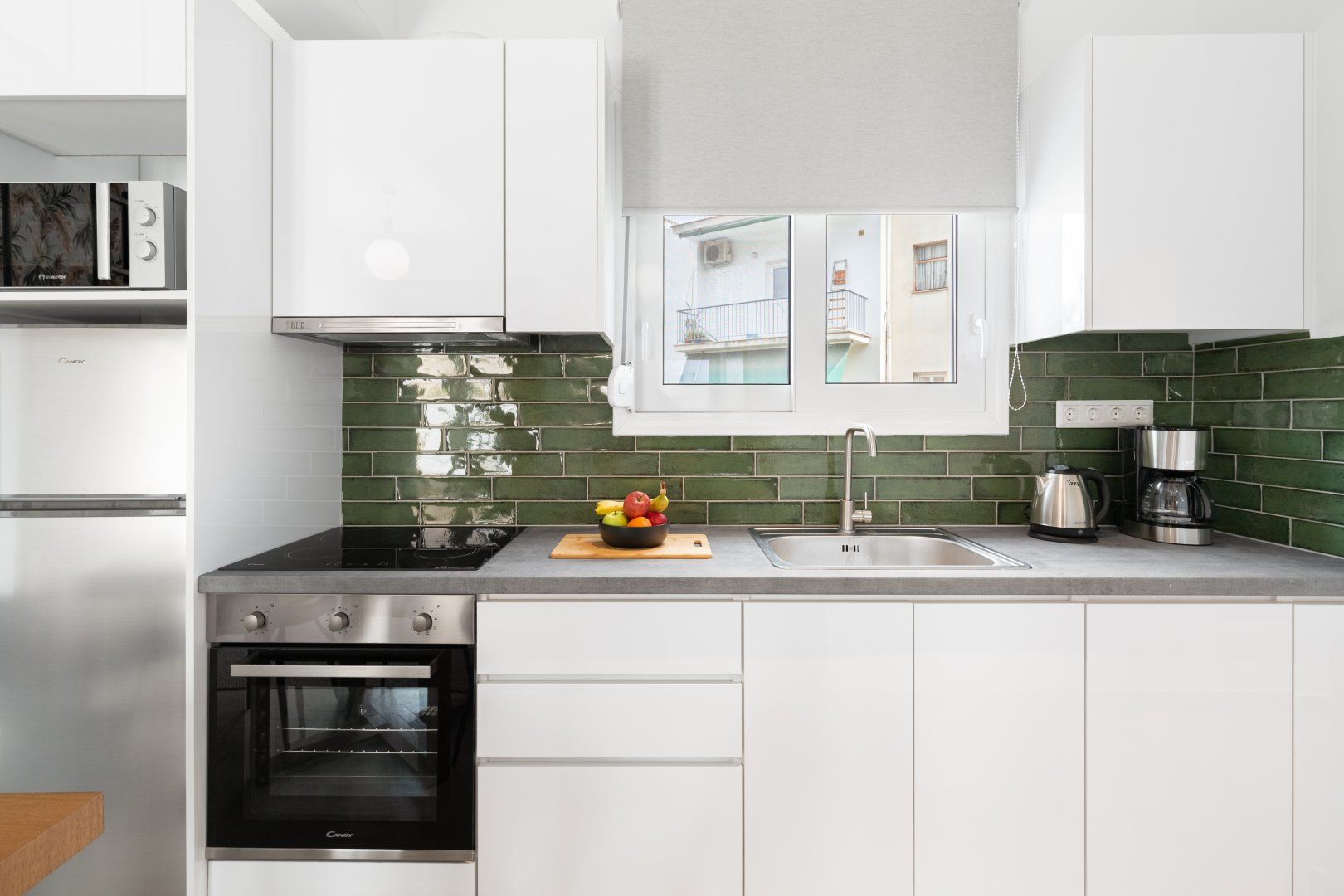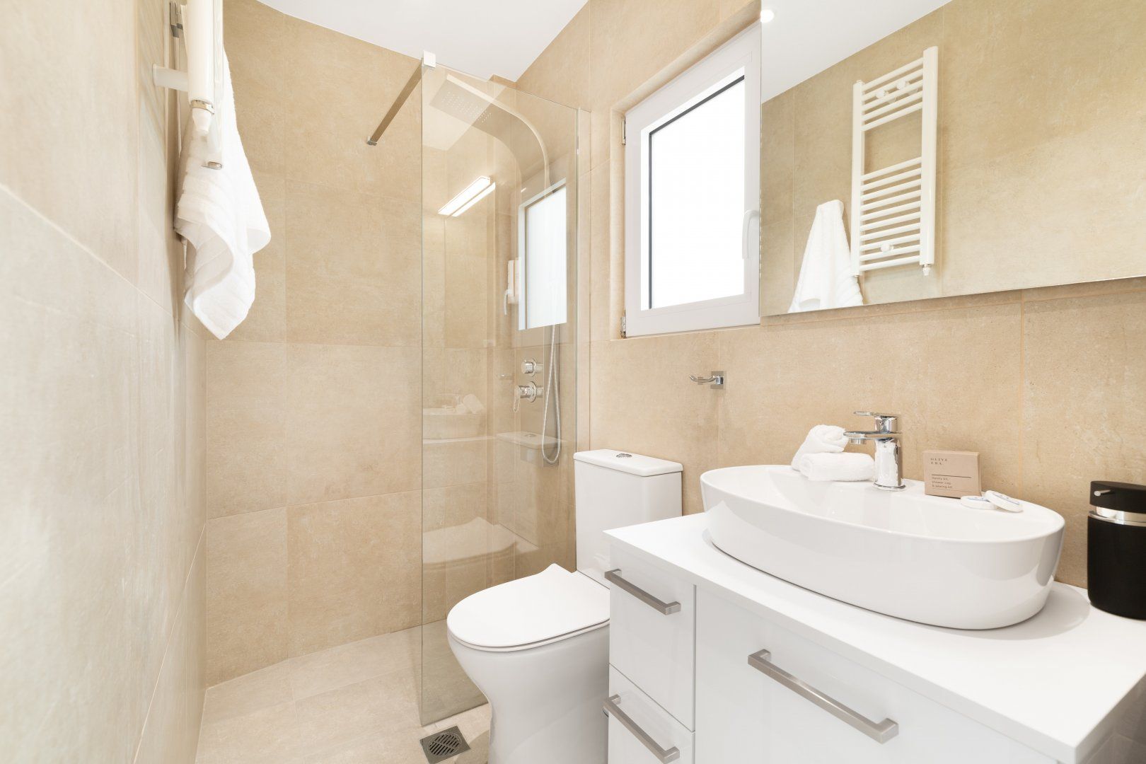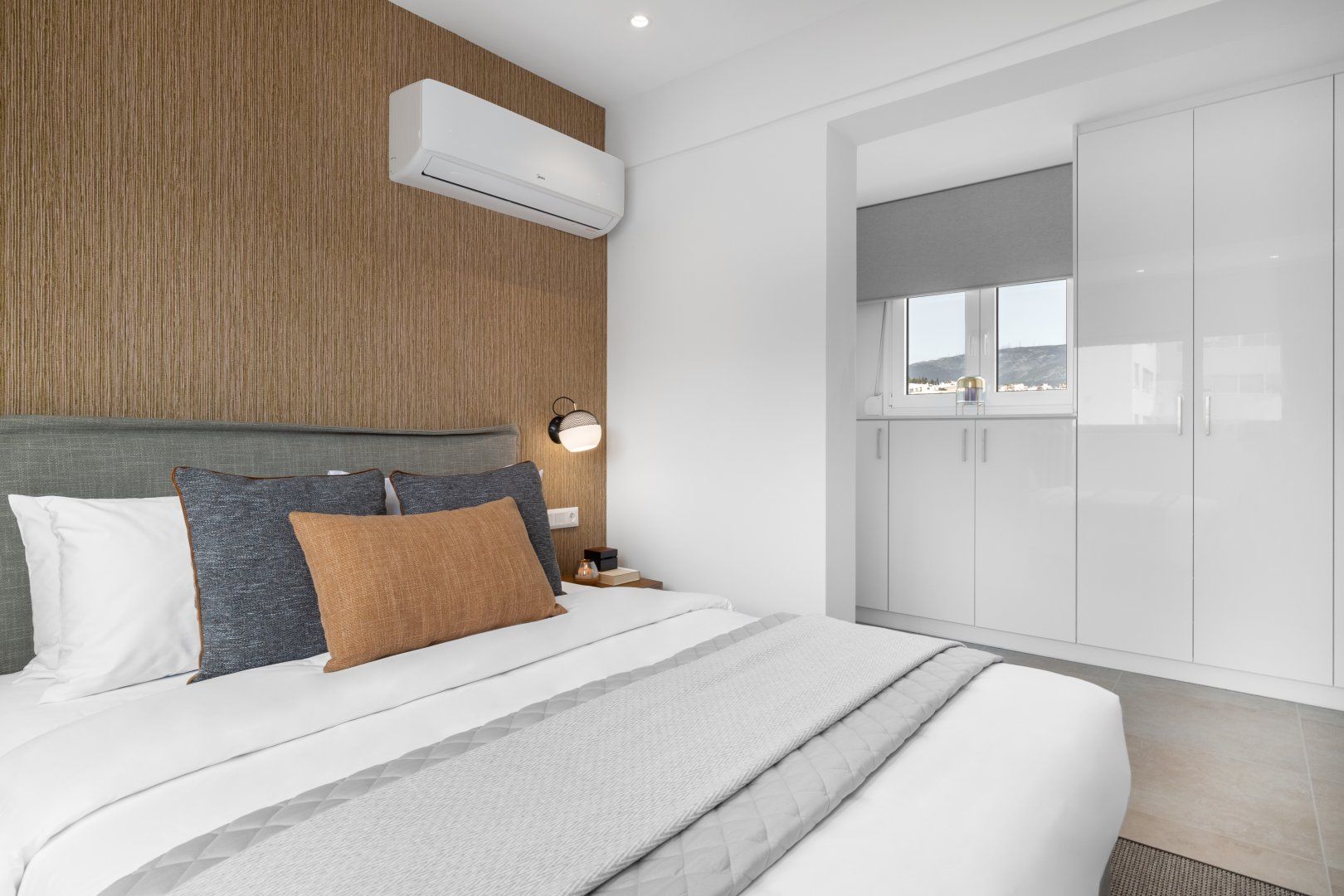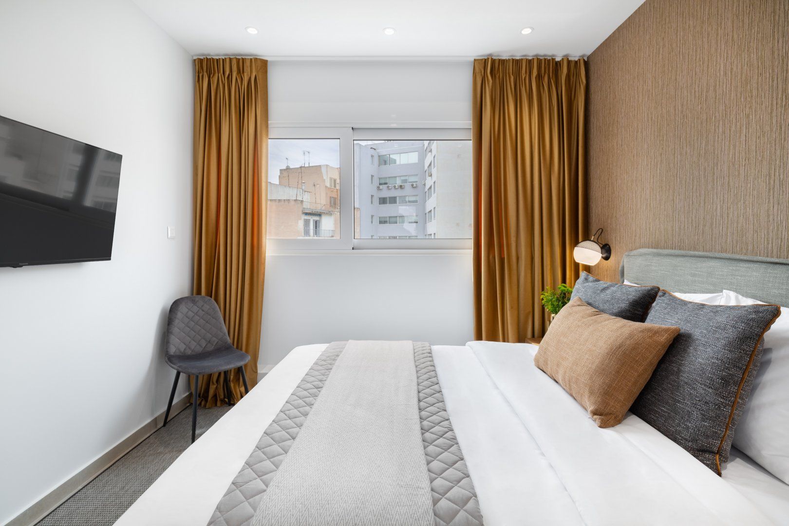 Inside, a soothing medley of crisp white and slate grey keeps things feeling modern and sunny. We love the tropical feature wall in the living room which adds a pop of colour and vibrance. The compact kitchen with pretty emerald tiles has all the essentials for self-catering and there’s a second outdoor space for dinners on the balcony. That’s if you’re not too busy exploring the meze restaurants of the Plaka, a five-minute walk away. But the real highlight of this apartment is how close it is to the Acropolis, just four minutes on foot to the entrance.