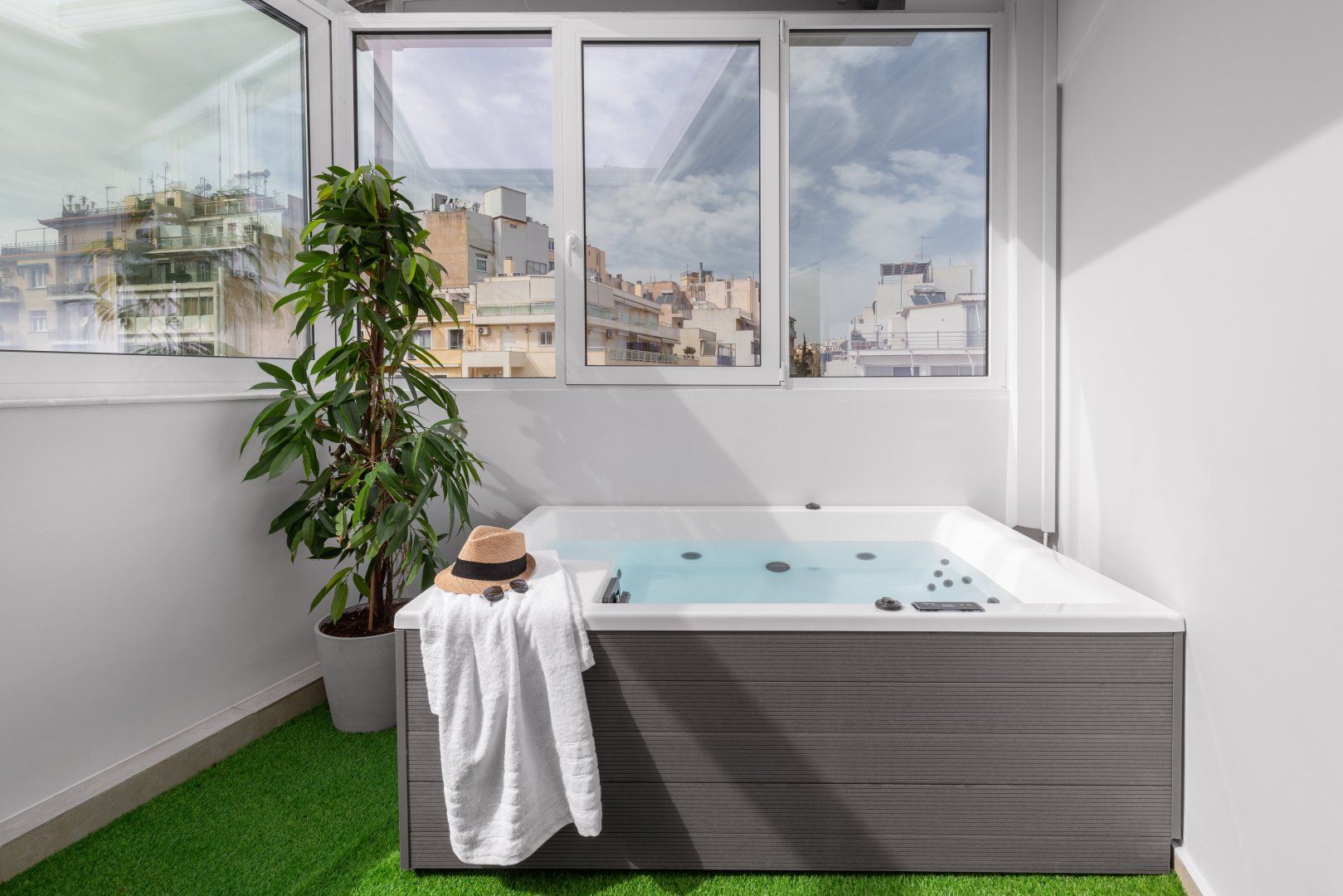 This sunny duplex apartment is a short walk from the Acropolis – you can even catch a glimpse of it from the fabulous rooftop terrace. Up here, you’ve got views out over the rooftops, best taken in from the warmth of the bubbling hot tub with a glass of something cold. There’s plenty of room for the group to spread out on bean-bag chairs too.