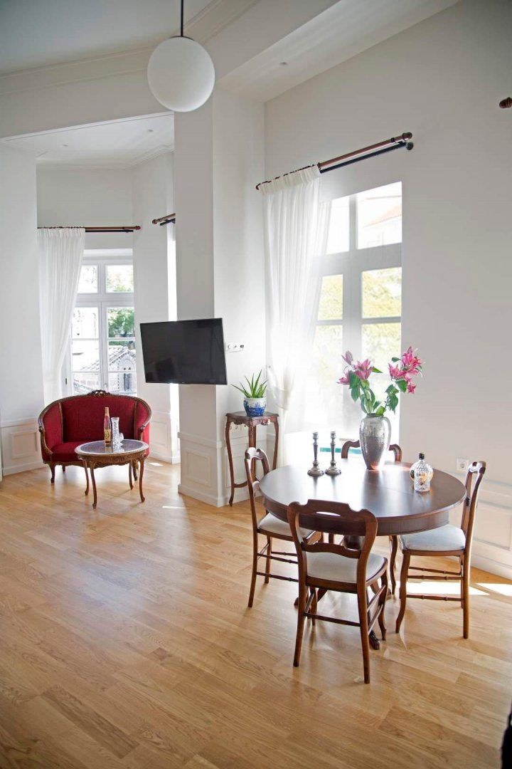 The interior is light and bright, thanks to large windows and French doors leading out onto charming little balconies where you can take in Athens' atmosphere without leaving the comfort of the apartment. A double-height ceiling in the kitchen/living room provides a real sense of space, while the pared-back decor keeps things feeling fresh and uncluttered. It's a feeling carried through the main en-suite bedroom, where a mirrored wall helps reflect all the available light around the room.