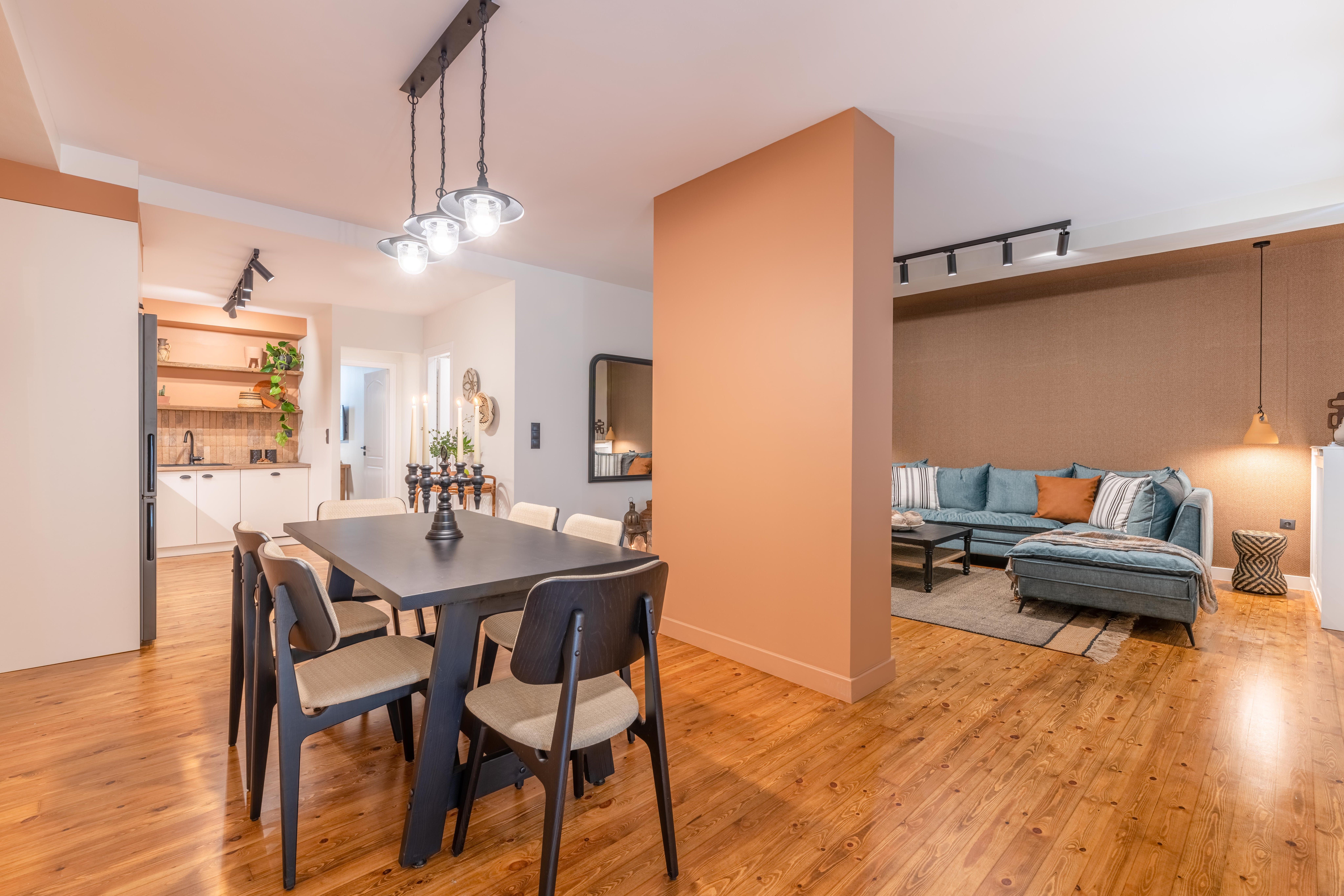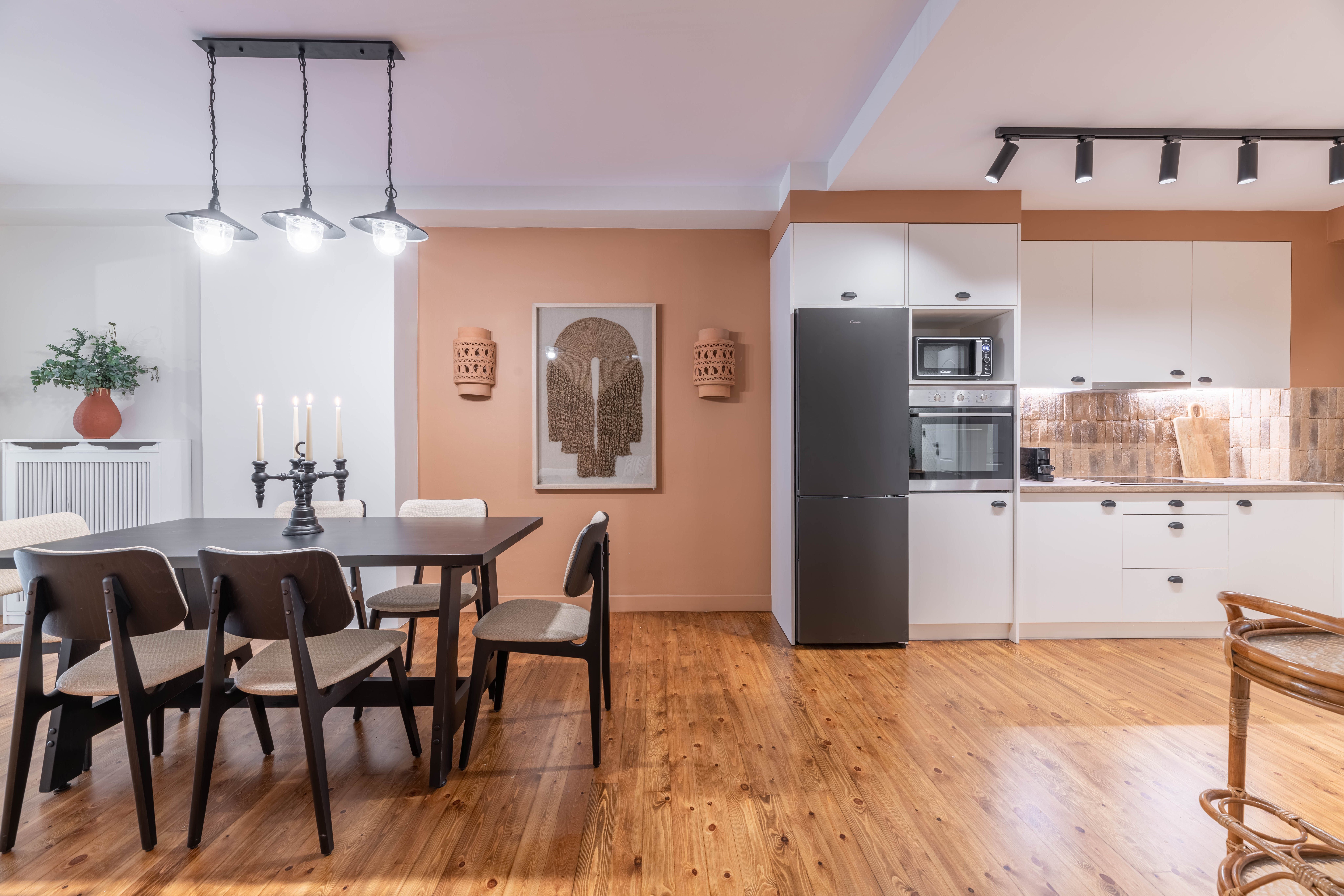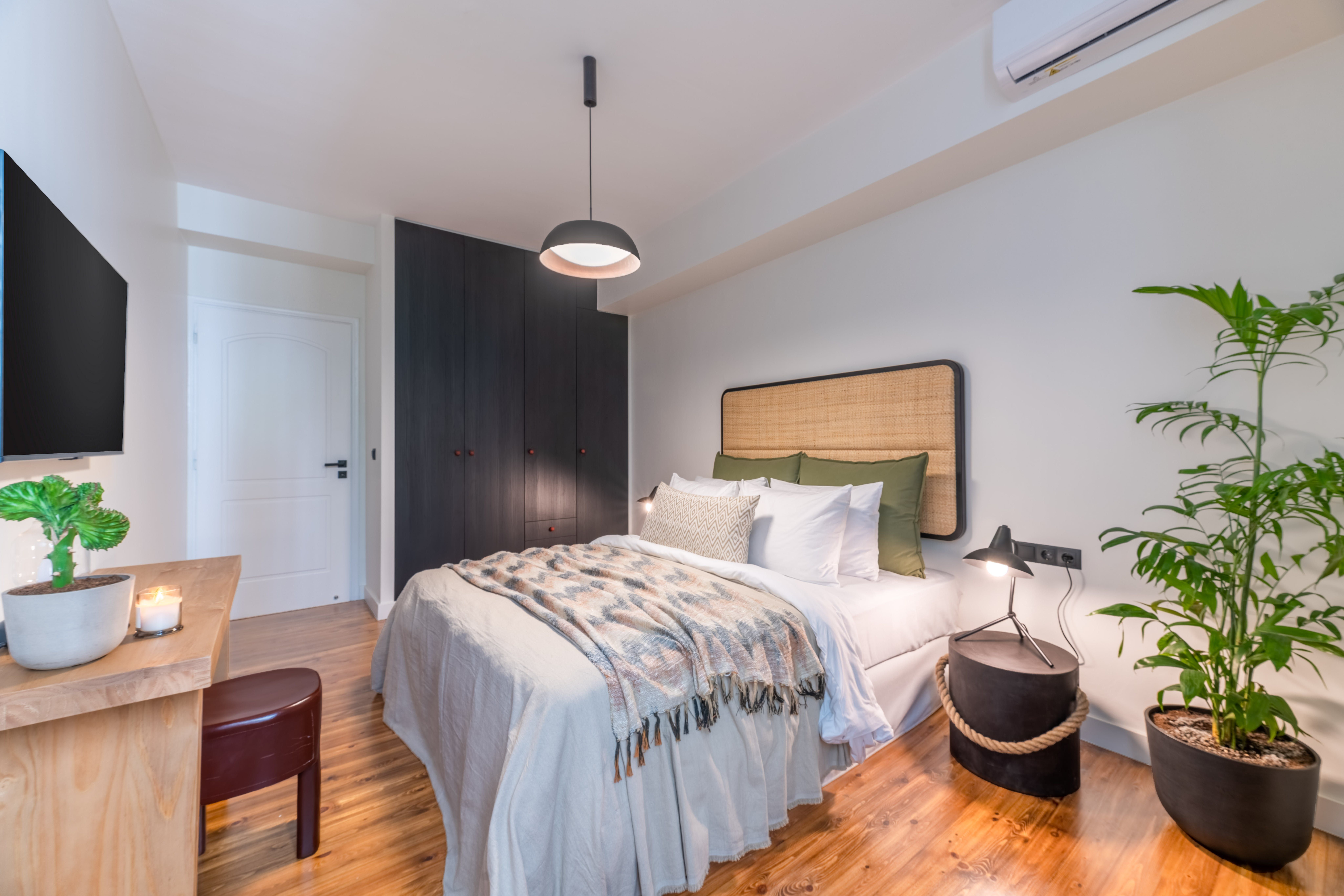 Back at this home, relax on the patio with a glass of wine. Inside, the palette of warm hues is welcoming, and plenty of cushions, throws and plants create a homely vibe. If the Athens air turns chilly, cosy up by the fire on the chaise sofa. When you prefer to eat in, whip up some tzatziki in the blender and enjoy it with some saganaki at your dining table. This home is ideal for two couples, a family or business professionals looking for a sought-after and well-connected address.