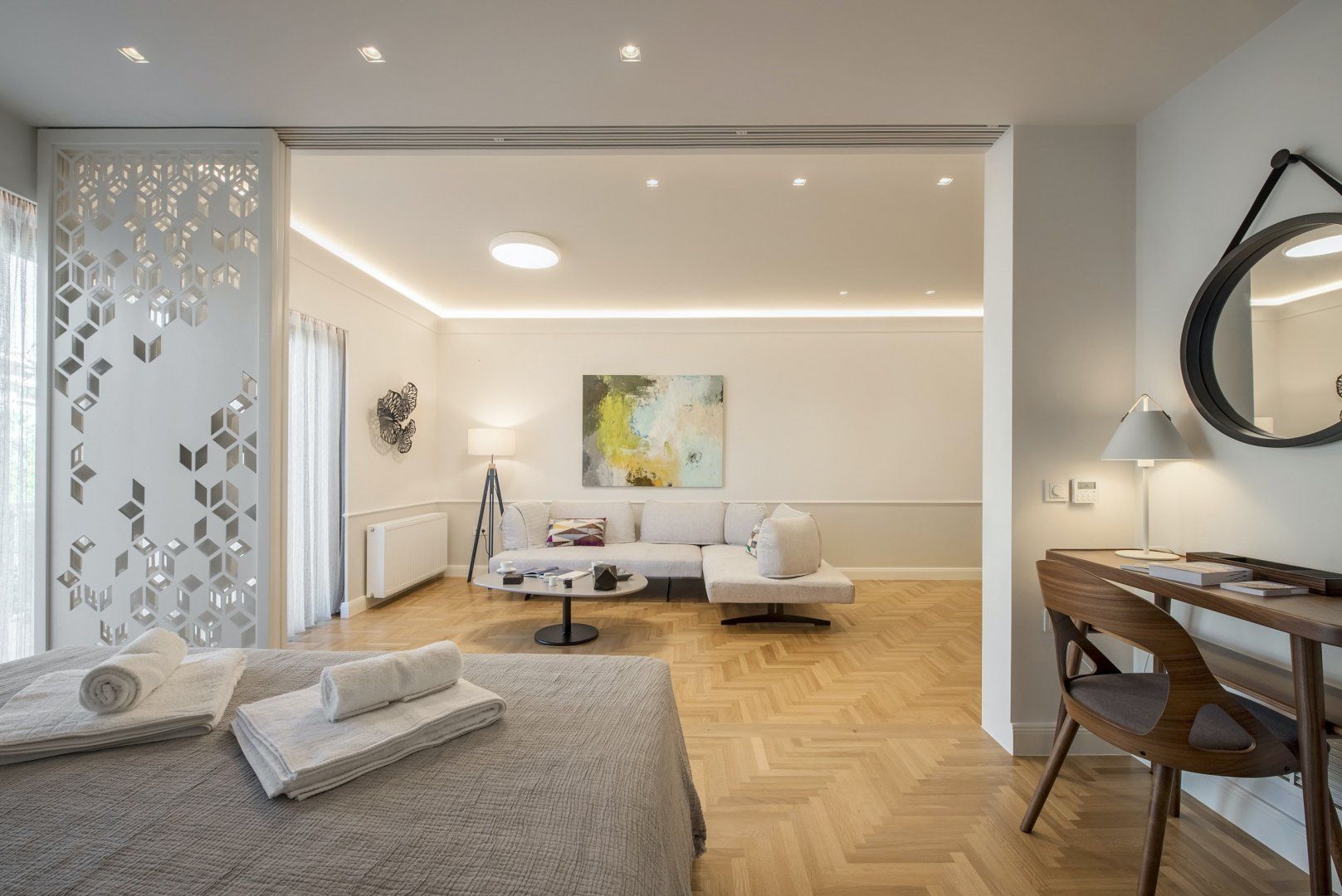 Located right on the edge of Athens’ National Park, this sleek studio-style apartment is an idyllic base for couples or solo travellers seeking a central spot to explore the city’s top sights. This spot will suit those visiting on business too – there’s a dedicated workspace in the cool grey bedroom, as well as a large balcony – perfect for morning coffees and evening glasses of Athiri. The luxury touches, abstract artworks and statement sliding door adorned with a laser-cut honeycomb design all make this space feel sumptuously modern – so, when you feel like a quieter night in, you’ll feel just as pampered as you would by the vibrant energy outside your door.