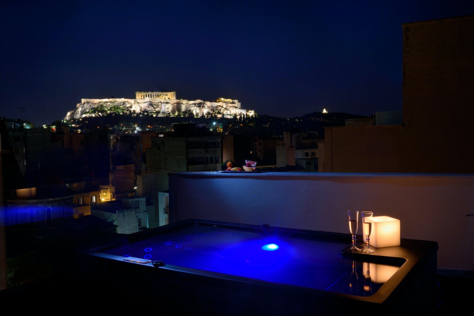Serve up olives, bread, and Greek wine on the table before slipping into the bubbling waters with a glass of champagne in hand. The city twinkles for miles ahead of you, and the brightly-lit Acropolis of Athens stands out in this incredible, panoramic scene right on your doorstep.