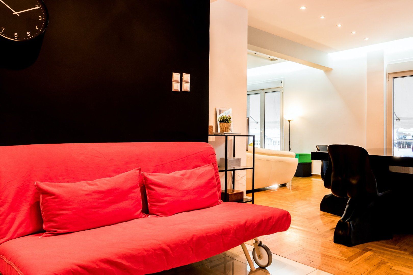 Inside, wood floors, striking pops of colour and an abundance of natural light create an instantly inviting welcome in the open-plan living area. Step out outside onto your private balcony – the ideal place to begin mornings with a cup of coffee or to end the night with a glass of Greek wine. We love the fiery red walls in the sleek kitchen, as well as the funky black dining table that beckons sociable soirées when you’re not out sampling the local tavernas. With a pair of comfy bedrooms as well as two bathrooms – one of which has a Jacuzzi bathtub – there’s no end to the relaxation in store.