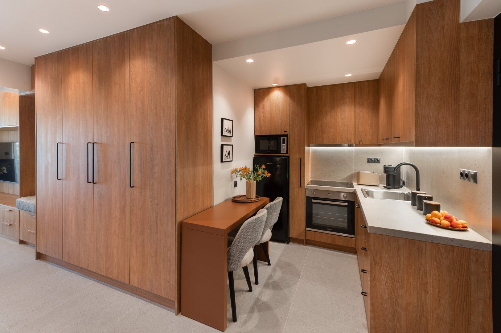 We love the interiors here, with muted, neutral colours, concrete floors and lots of built-in storage. But by far its biggest selling point, for us, is its spacious balcony, overlooking the tree-lined street and complete with an awning for shade.