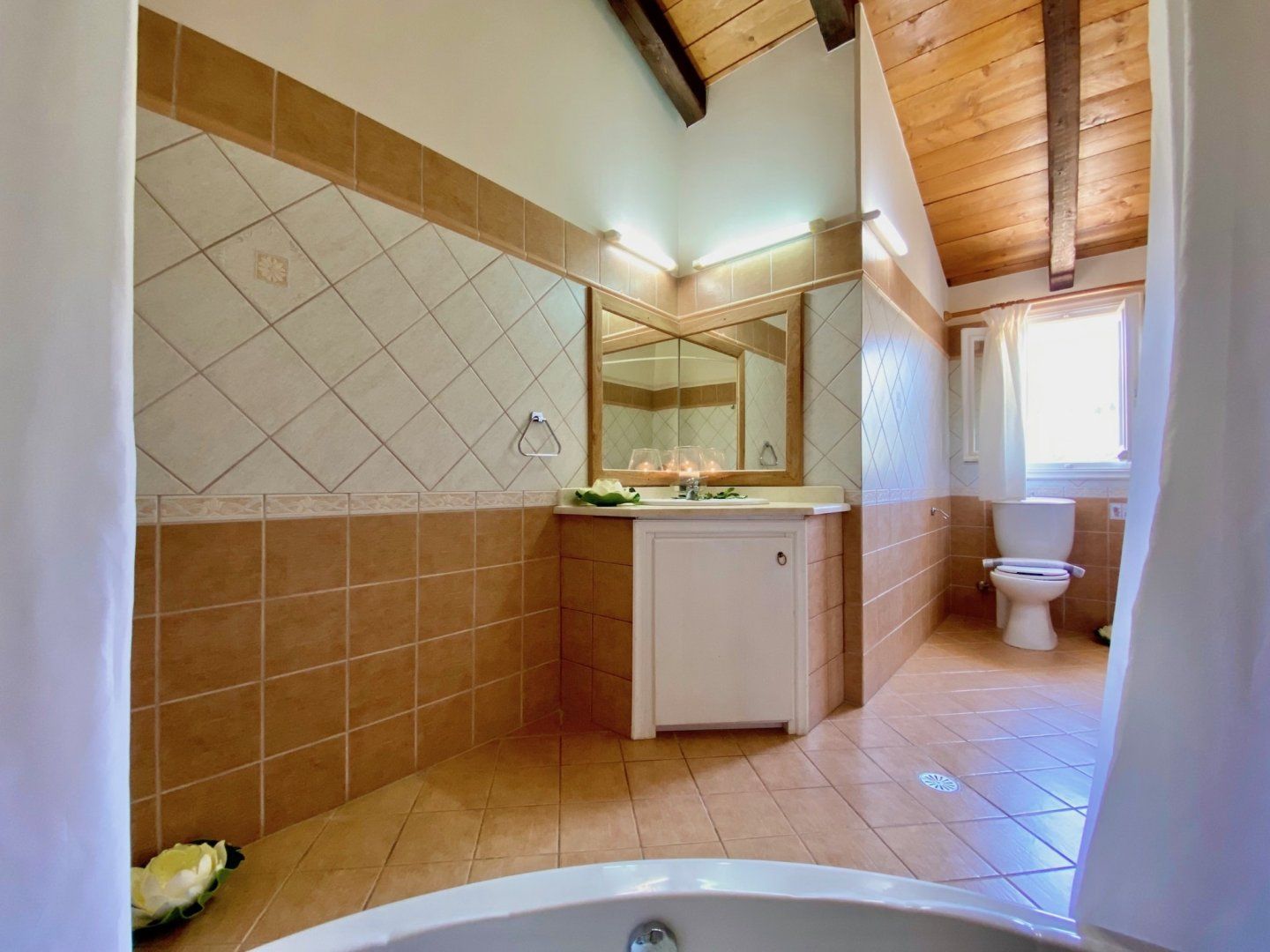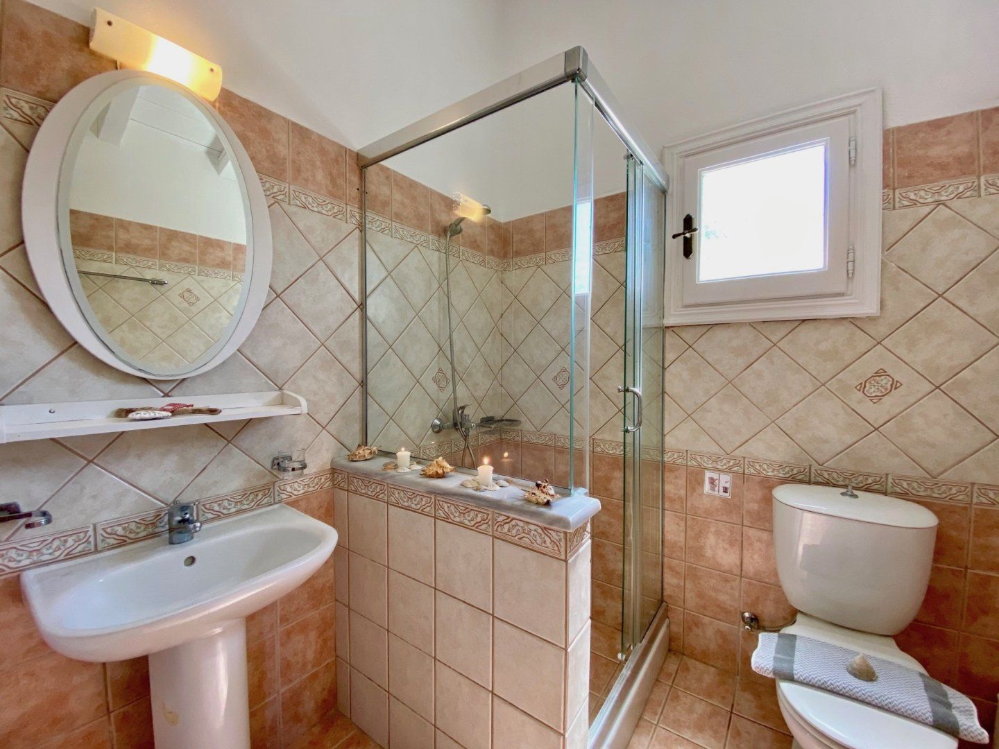 Behind the villa's peach-covered walls, the living quarters are simple in style with the colour palette rarely veering from bright whites and neutrals, and the furnishings and finishes are decidedly understated, too. However, we don't see this as a problem, especially as the basics are nailed so well – just look at the kitchen and smartly tiled bathrooms to see what we mean.