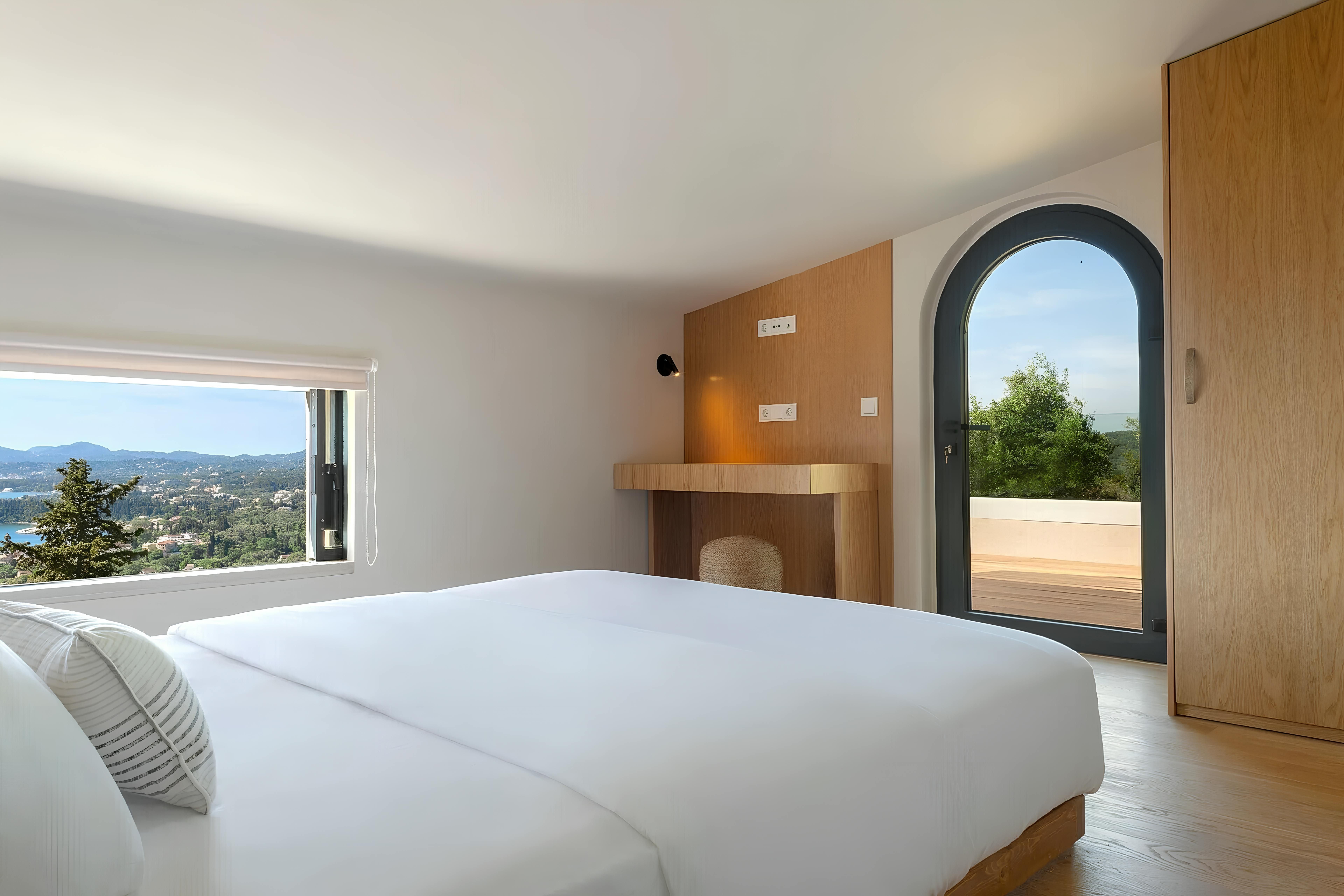 Golden hours await at this hillside sanctuary overlooking Ipsos. Set within an old olive grove, this is the perfect spot to disconnect and enjoy slow days by the private pool. There are beautiful views from the terrace and you’ll have a barbecue for dining alfresco. We imagine you’ll be spending most of your time outdoors, but the rooms are just as inviting with three serene bedrooms – all of which feature en-suite bathrooms for privacy. Location wise, it’s the perfect base for exploring Eastern Corfu with the nearest beach and local restaurants just a twenty-minute walk away.