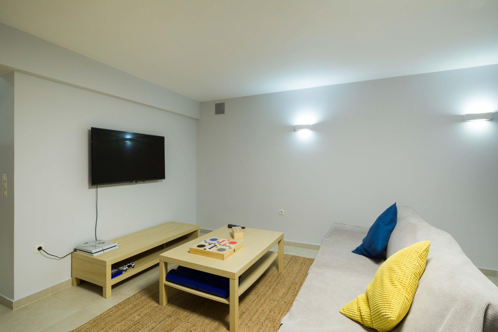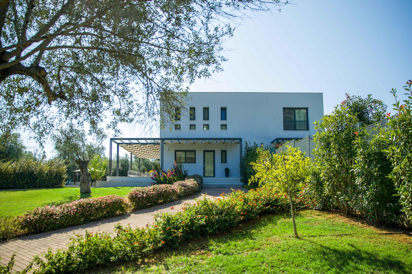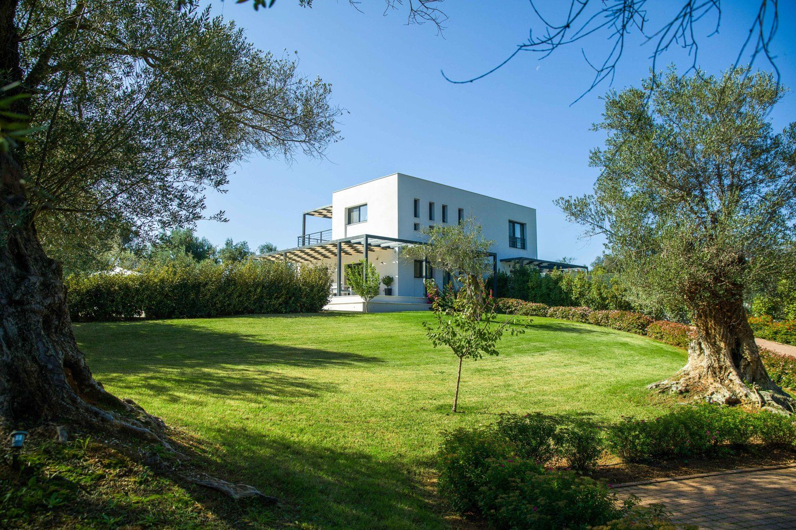 Surrounded by olive groves, vineyards and citrus trees, and situated only 150 metres from the peaceful Kanouli Beach, this sprawling villa commands outdoor living. The terrace brings with it the sounds of Mediterranean summers: loved ones splashing in the pool, the clattering of plates at the alfresco dining table, drinks poured over ice and the sizzle of the barbecue.