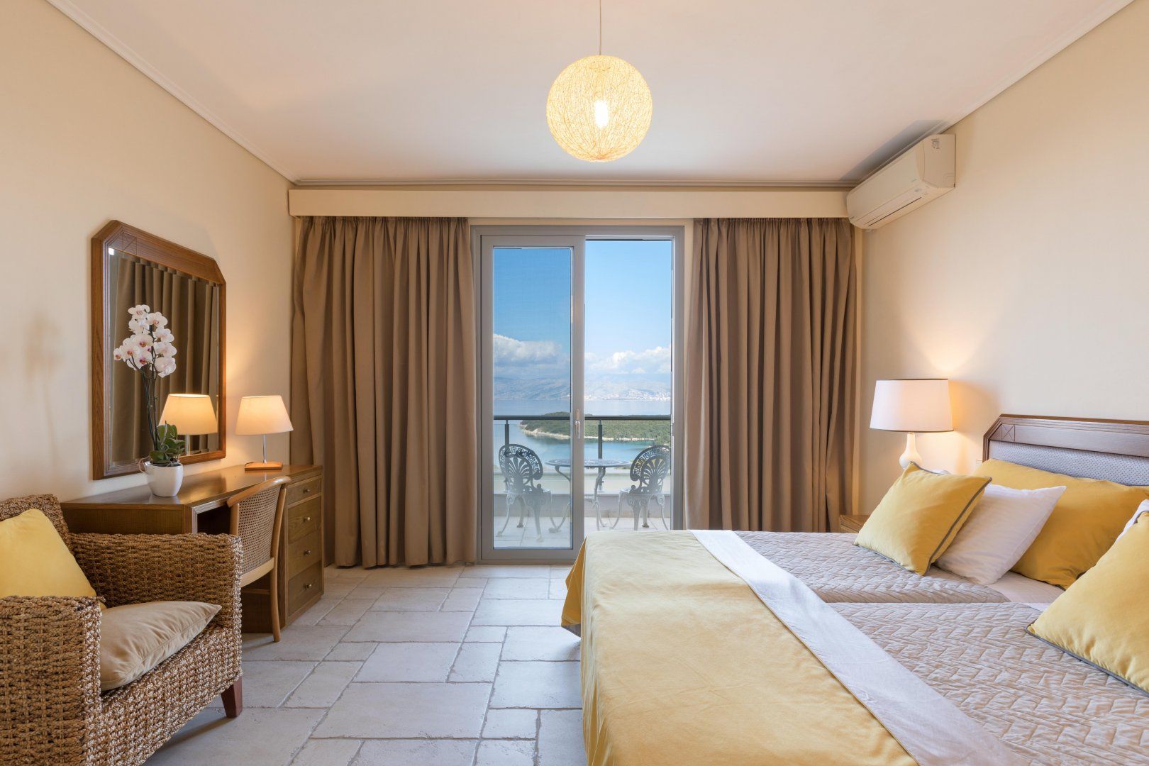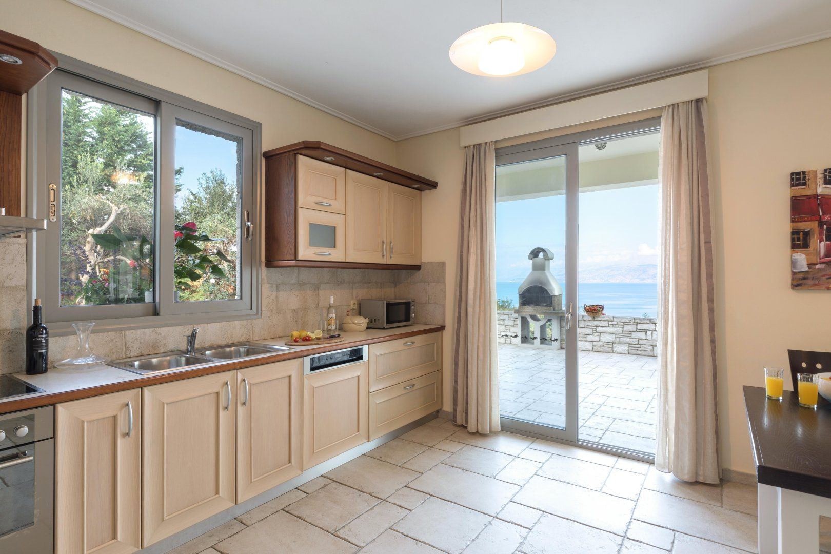 The villa’s location is ideal for those looking to explore the island. Corfu Town is 35km away, but there are beaches, tavernas and charming Greek towns galore on your doorstep. The unspoiled shingle of Aflaki Bay is just a five-minute drive down the hill, while the more vibrant Kassiopi is 2km away. You’re only 600m from the beach, where you can hire a boat, go sailing or even try your hand at horse-riding.