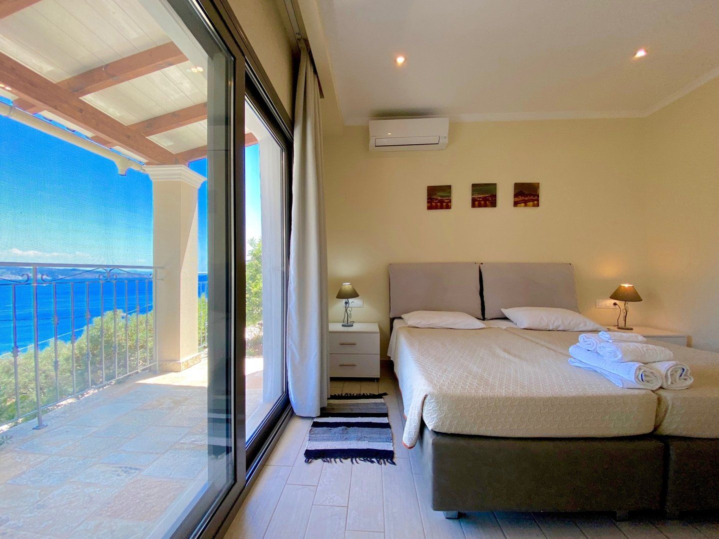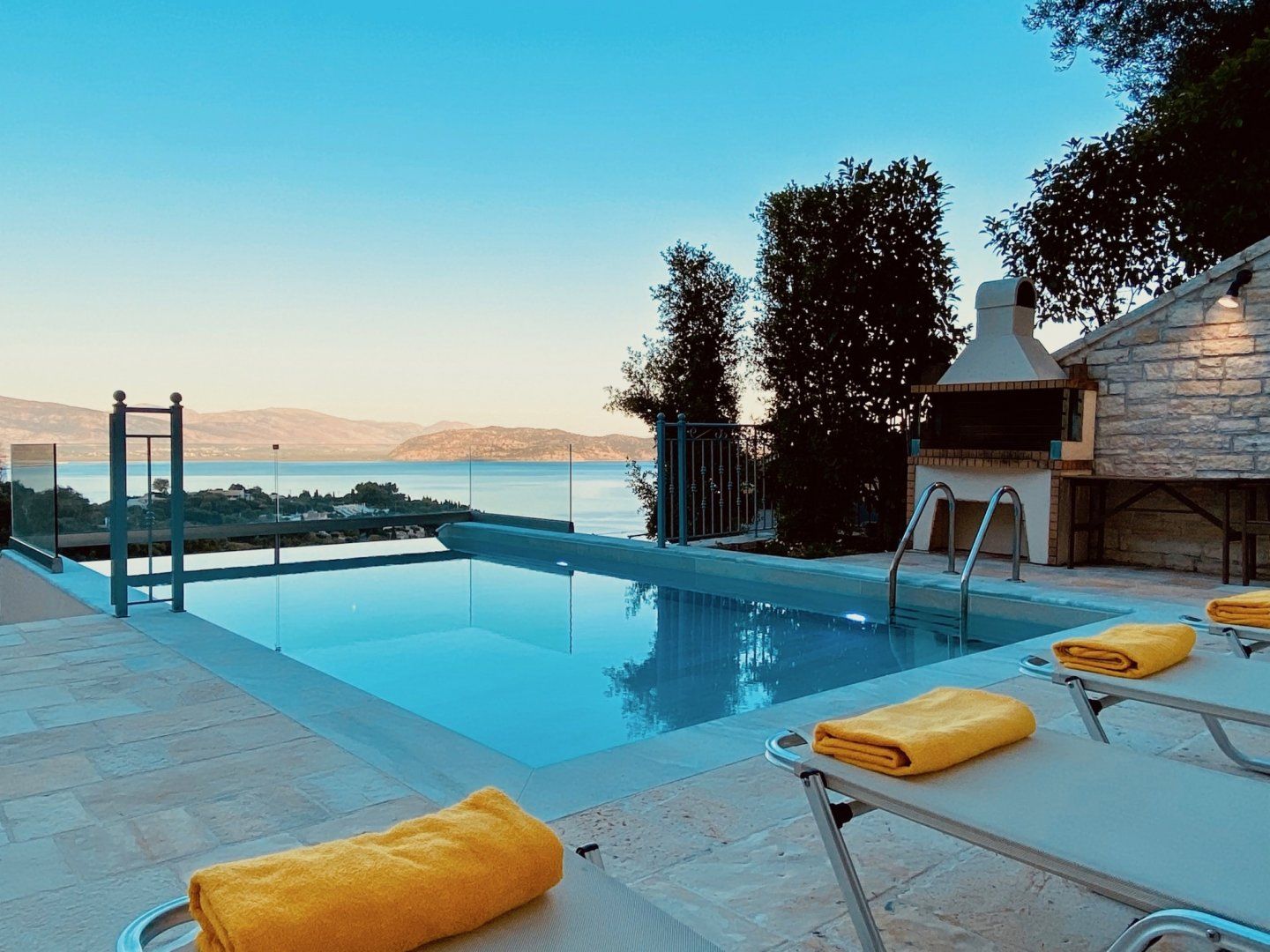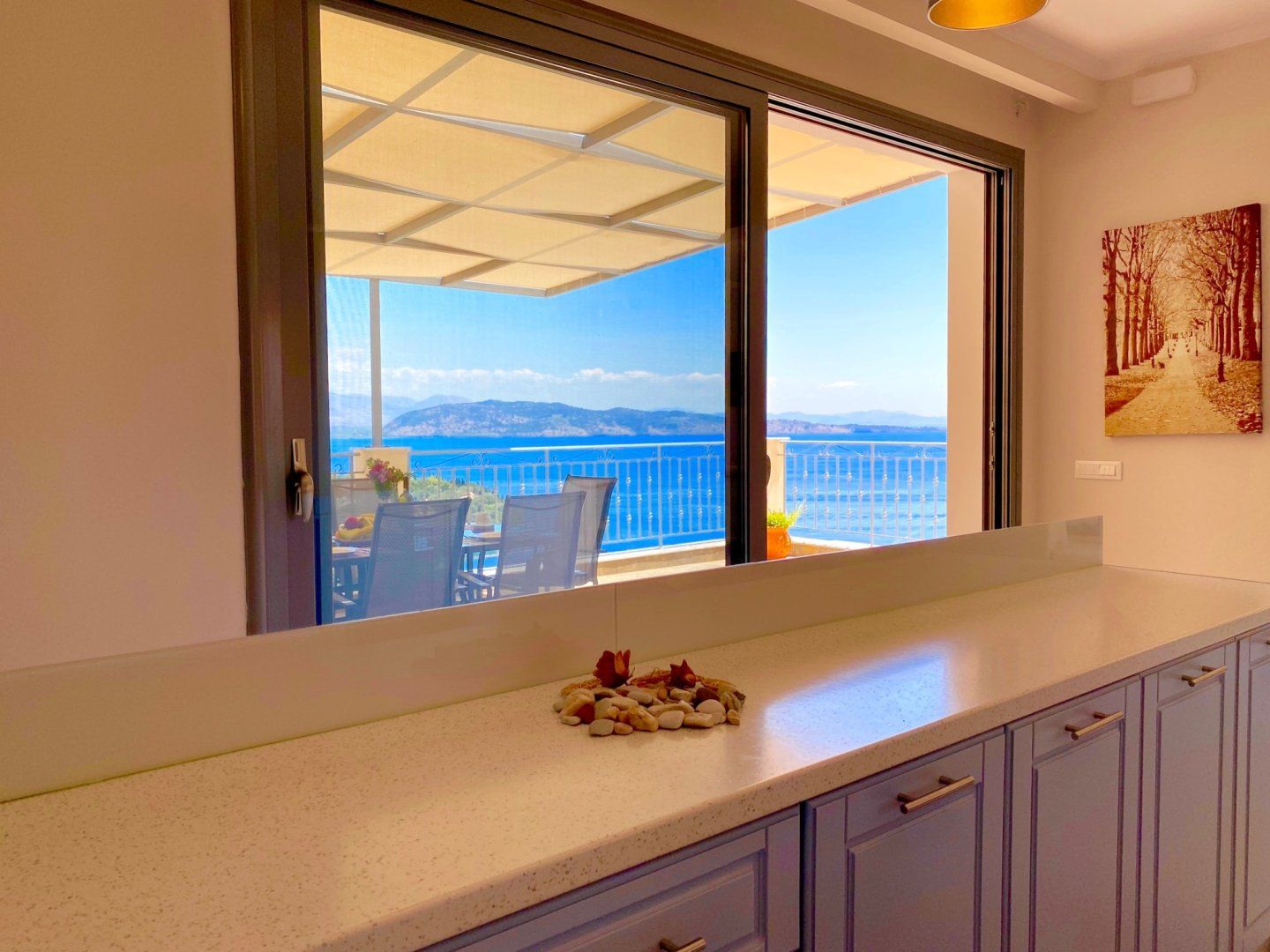 Enter a calming space, complete with a neutral colour palette and an open-plan layout that makes reconnecting with your loved ones effortless. There's no denying that these sliding doors and picture-box windows invite you to enjoy the outdoors at every hour of the day. We imagine that you'll be spending your downtime snoozing under the parasols and soaking up that spectacular vista from your private infinity pool. What's more, this stony patio is the perfect place to dine alfresco and plan your trips, be it over continental breakfasts or Greek-style barbecues.