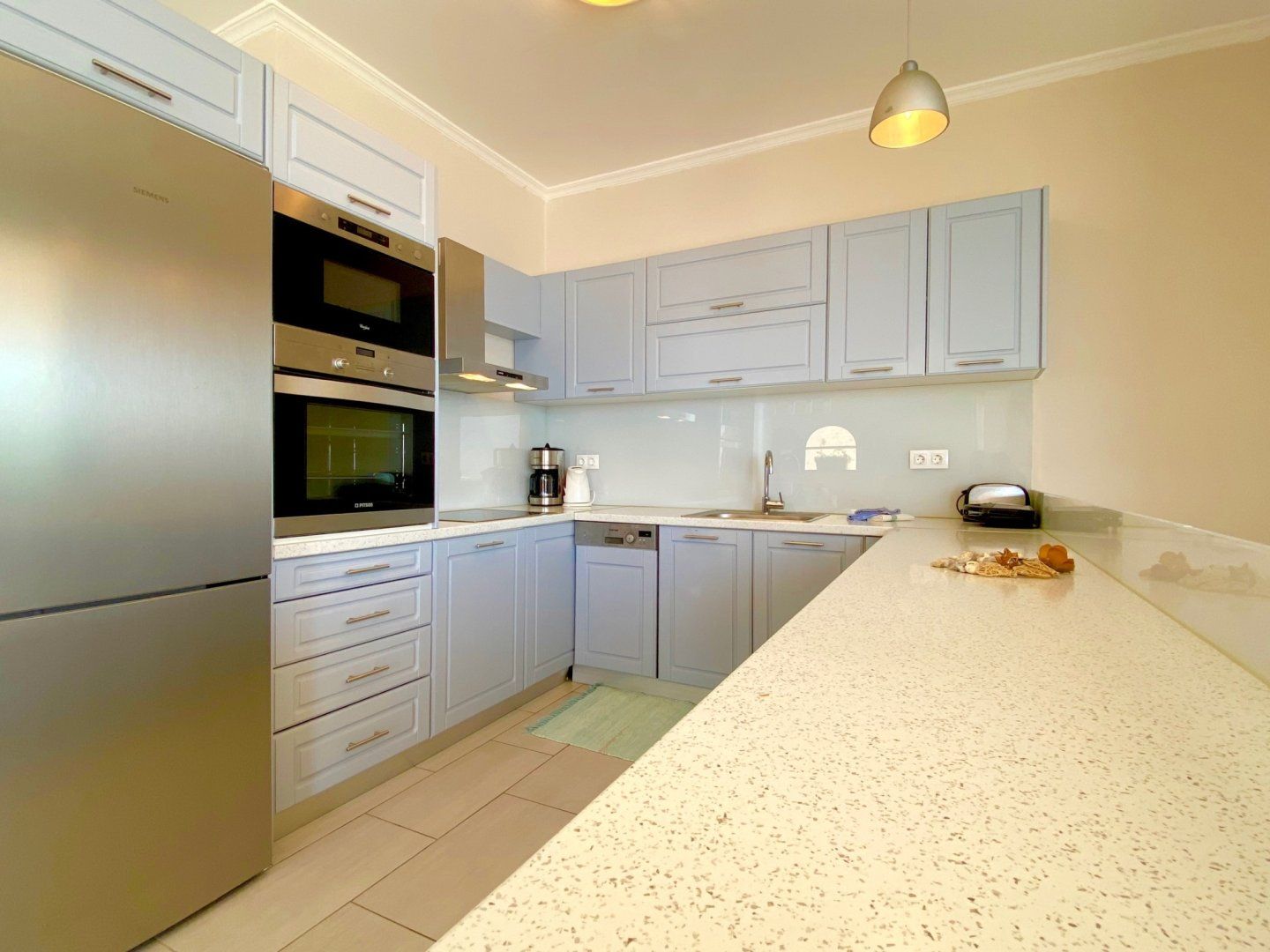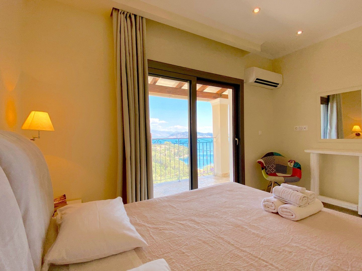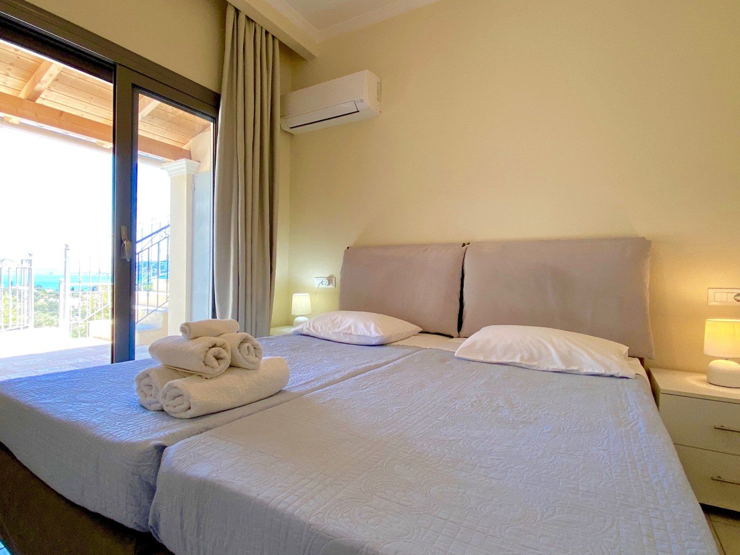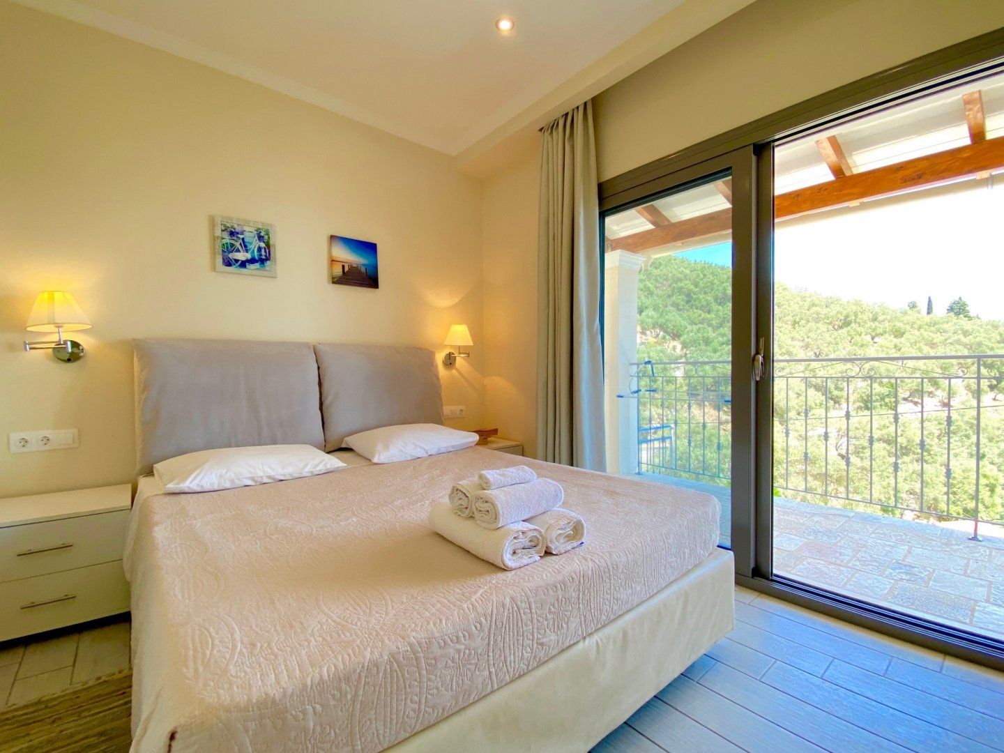 Enter a calming space, complete with a neutral colour palette and an open-plan layout that makes reconnecting with your loved ones effortless. There's no denying that these sliding doors and picture-box windows invite you to enjoy the outdoors at every hour of the day. We imagine that you'll be spending your downtime snoozing under the parasols and soaking up that spectacular vista from your private infinity pool. What's more, this stony patio is the perfect place to dine alfresco and plan your trips, be it over continental breakfasts or Greek-style barbecues.