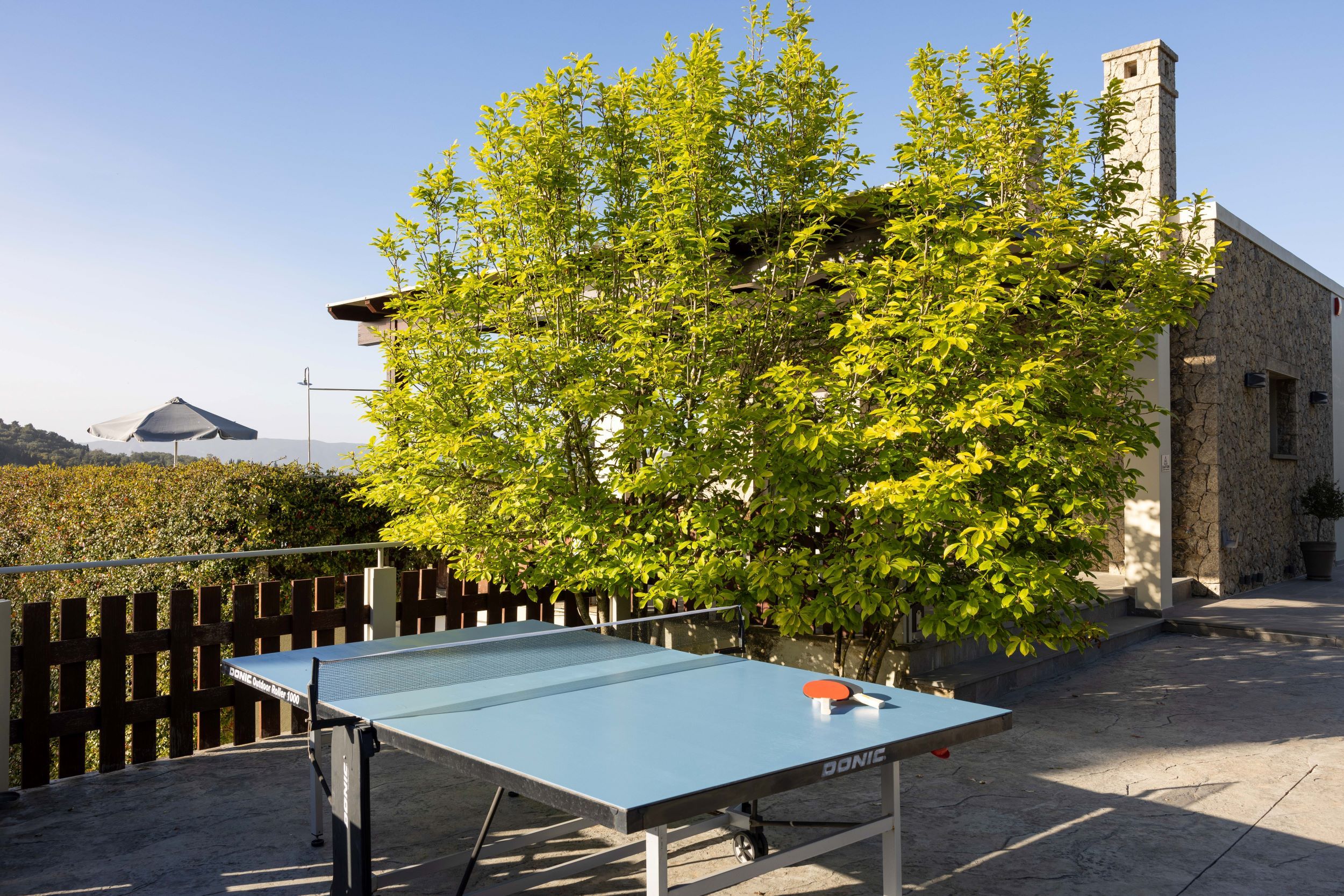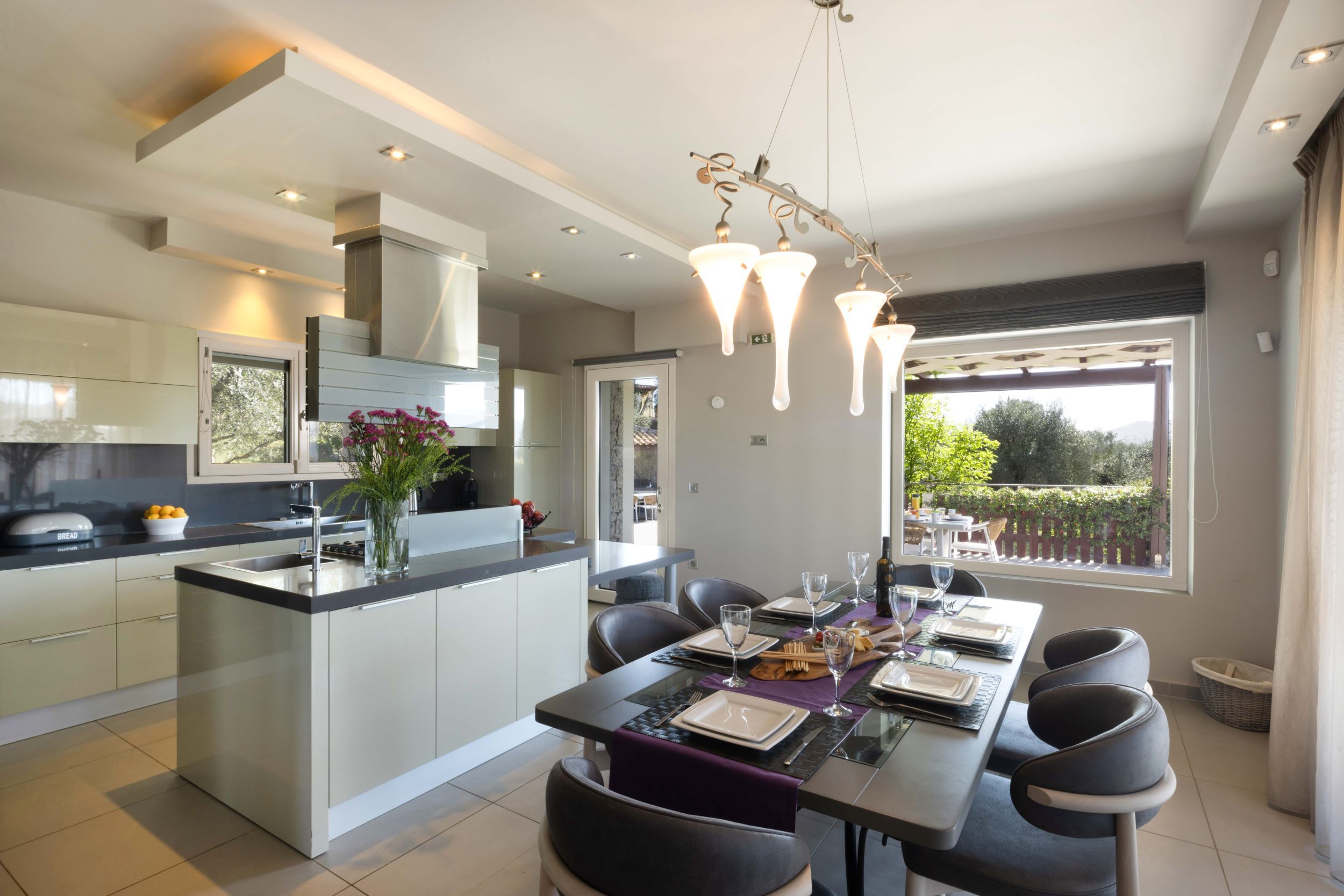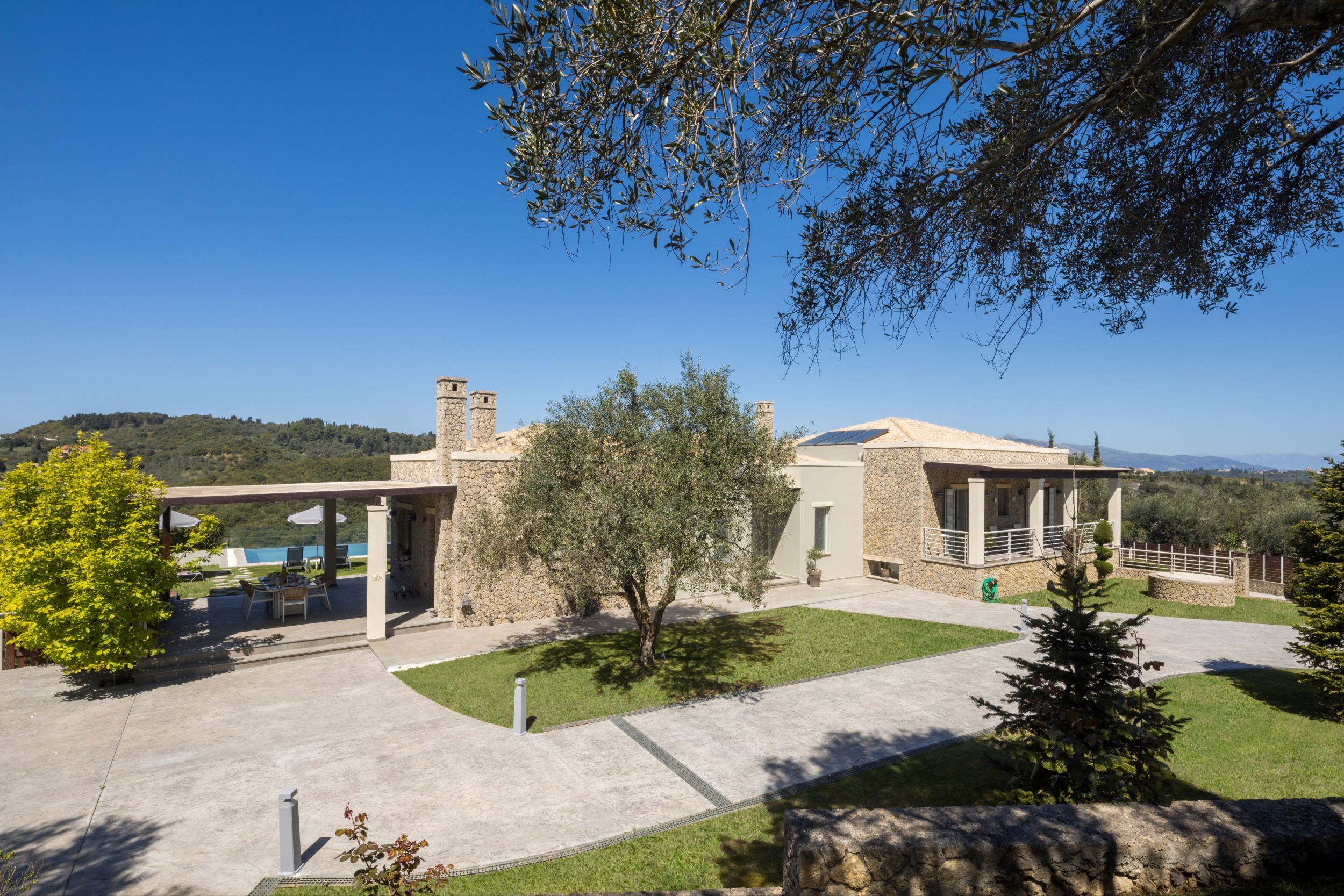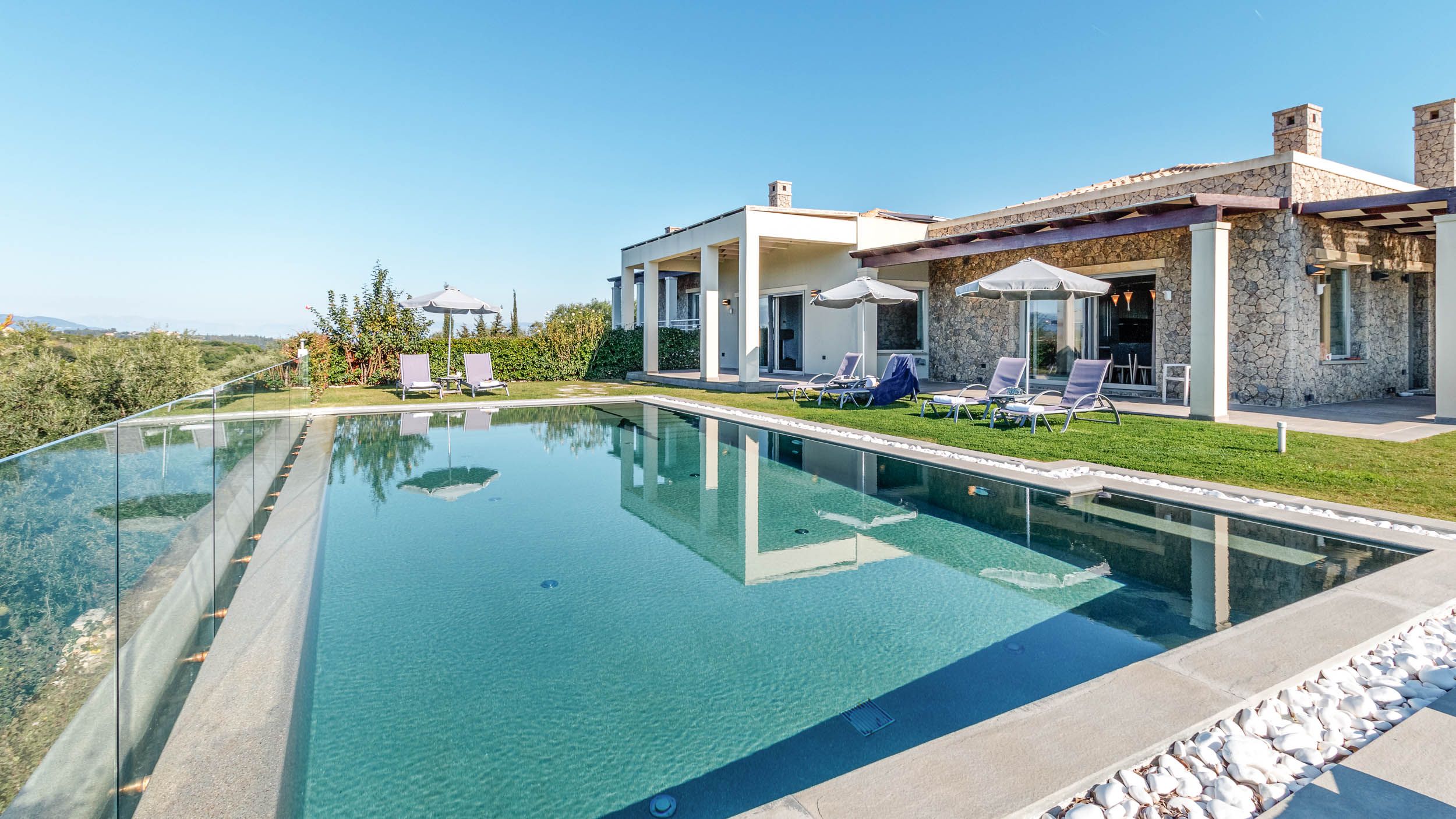 Sleek and stylish, this villa is a splendid base for a relaxing break in Corfu. It’s located on a small hilltop just off the central road to Corfu Town, eight minutes from a fabulous golf course, with plenty of beaches nearby. Tranquil Ermones beach is only ten minutes away. The villa is modern and attractive, with a beautiful infinity pool facing delightful views, and an alfresco dining space. Inside, there’s plenty of room for everyone to spend time together in the living room, the well-equipped kitchen, and the games room.