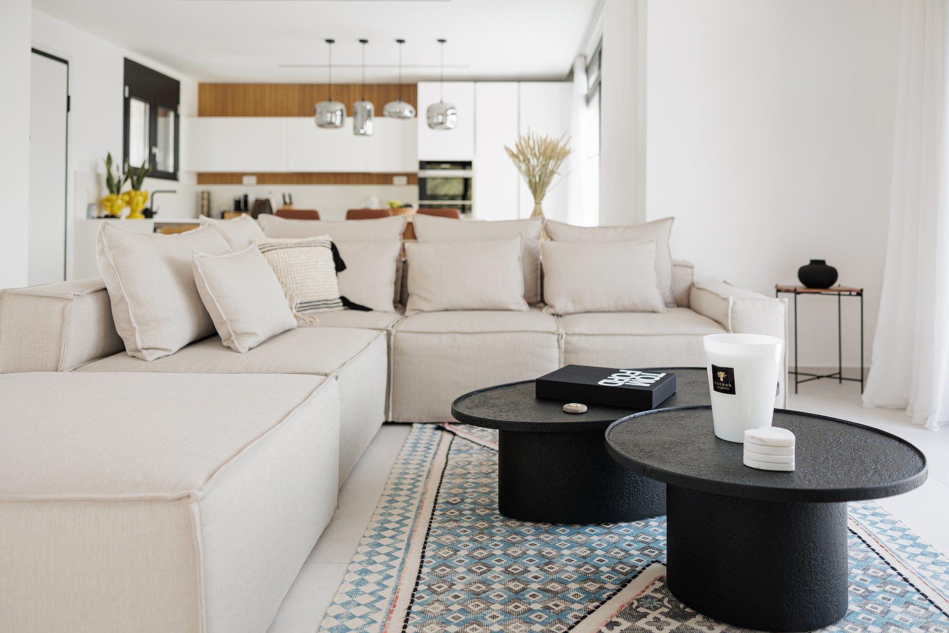 The home's upside-down layout makes the most of its beachfront location, ensuring you can socialise in the first-floor spaces with uninterrupted views rolling out before you. In addition to the open layout of the kitchen and living room, vast sliding doors reveal a scenic outdoor dining area that sits on a wrap-around balcony.