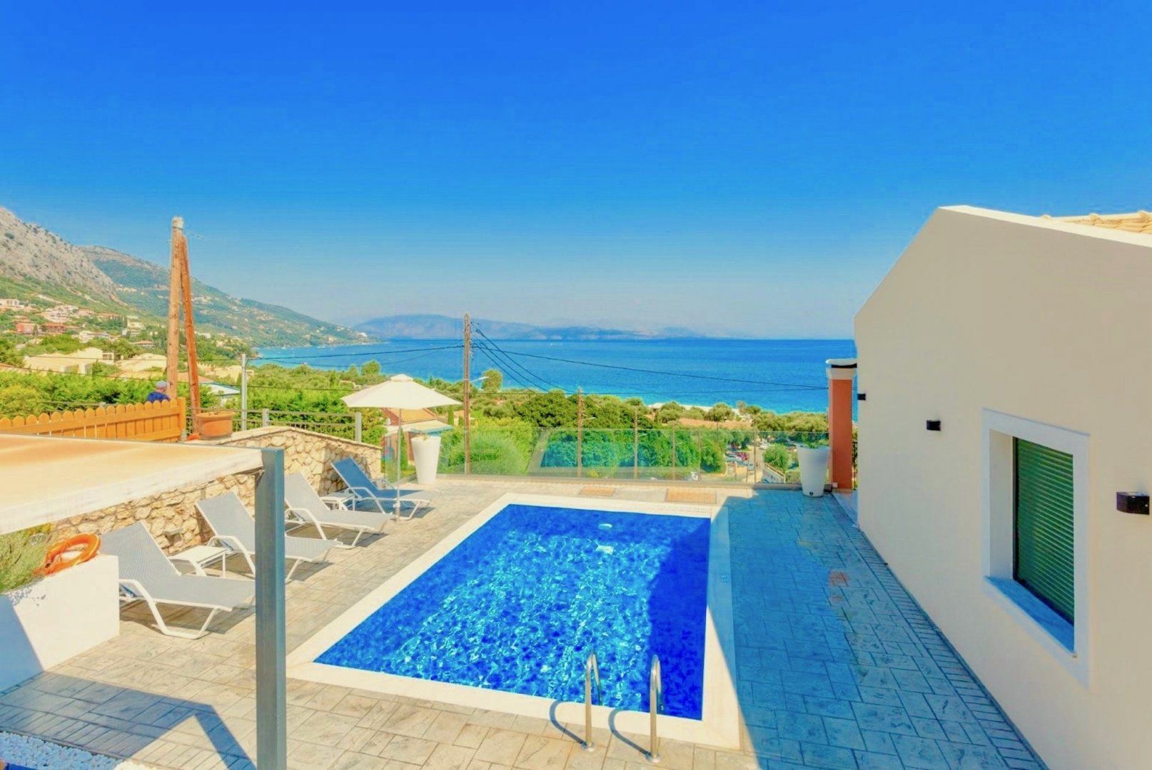When you get home, unwinding for the evening is easy – slide open the patio doors to reveal a spacious pool deck. Take a refreshing dip to cool off and re-energise before dinner, or simply sit on a sun lounger and get lost in a good book for a while. Speaking of dinner, you'll have your own barbecue here, complete with a comfy seating area that's covered by a pergola. Throw some fresh seafood on the grill and then tuck in alfresco for a delicious and chilled-out meal. Make sure you don't miss the sunset (though admittedly that is hard here with panoramic views all the way to the Albanian mainland). Pour a glass of wine, sit back and enjoy the show.