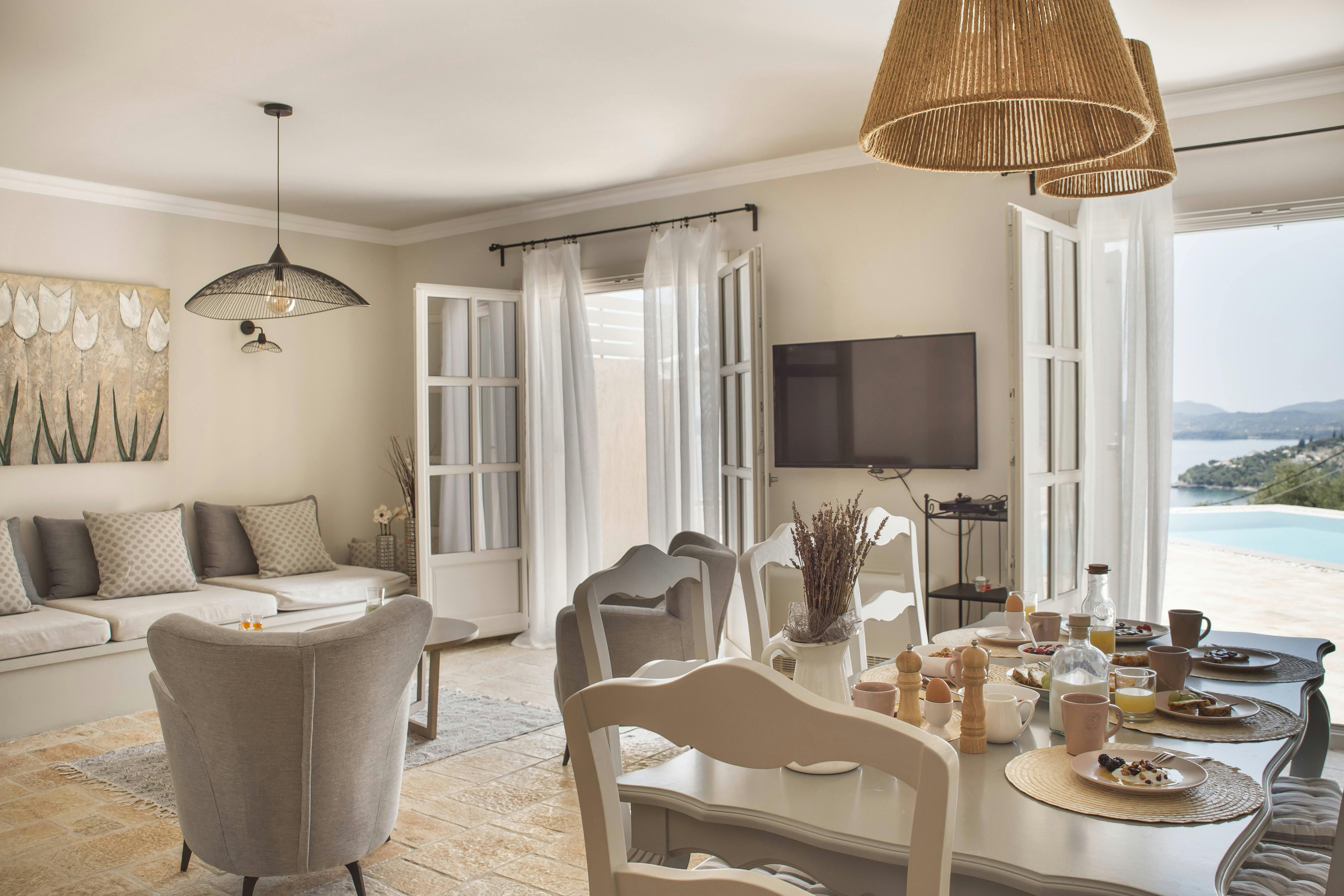 With endless sea views and a private pool, this home is a dream island escape. You can rest and recharge outside while sipping drinks on the terrace. The rooms are perfect for families and one of the bedrooms is tucked away in the annexe for extra privacy. Housekeeping is included in your stay and there are a range of extra services available – from private chefs to organised excursions. We recommend having a car to explore further afield, but it’s just a short drive to the village of Barbati and Glyfa beach.