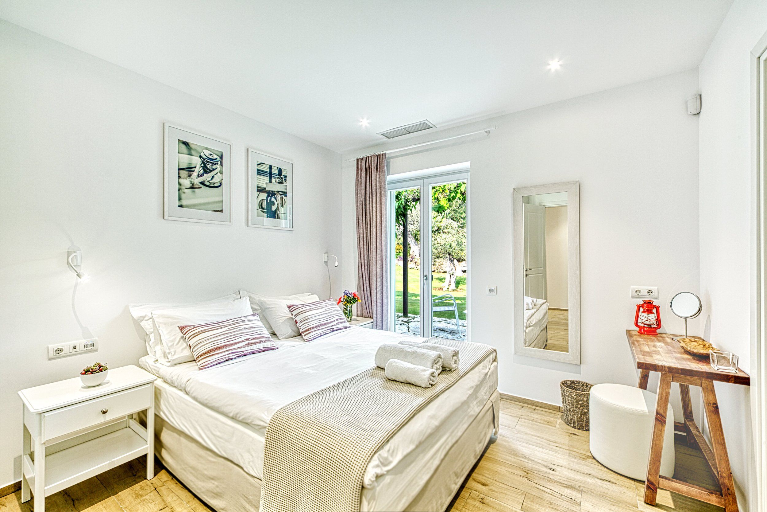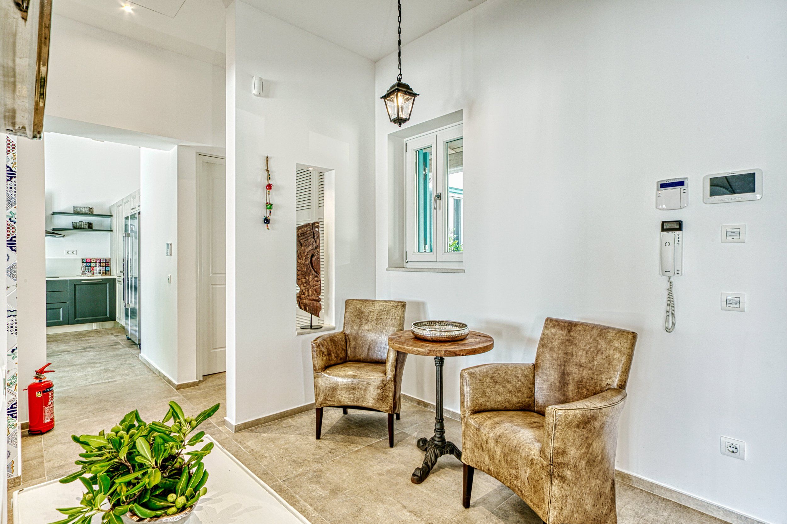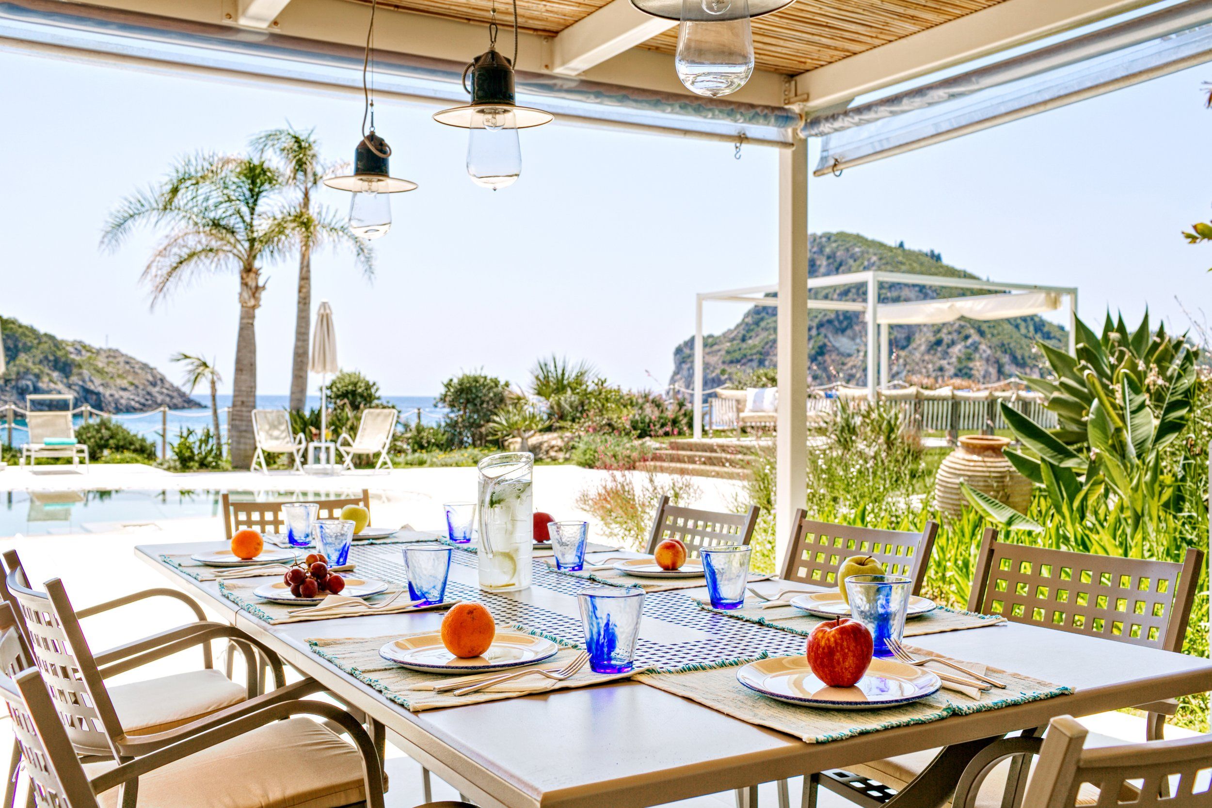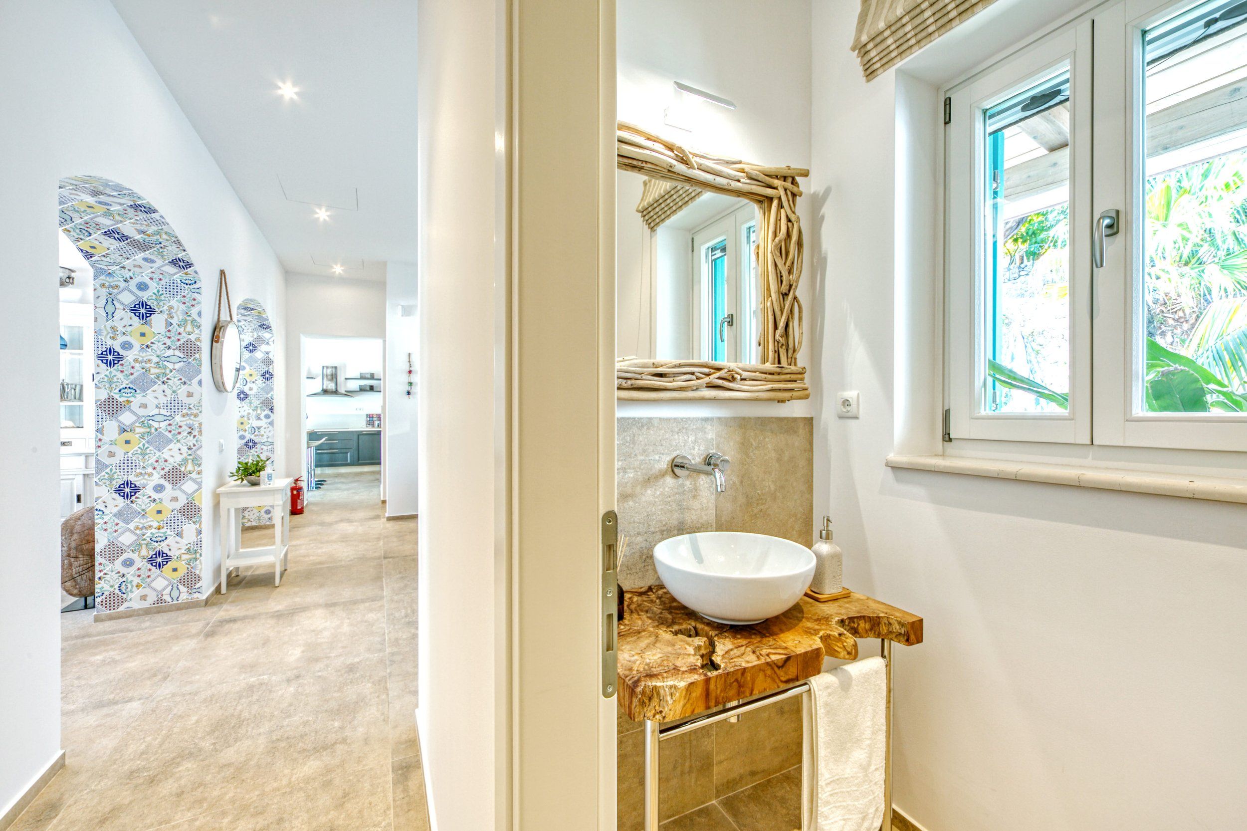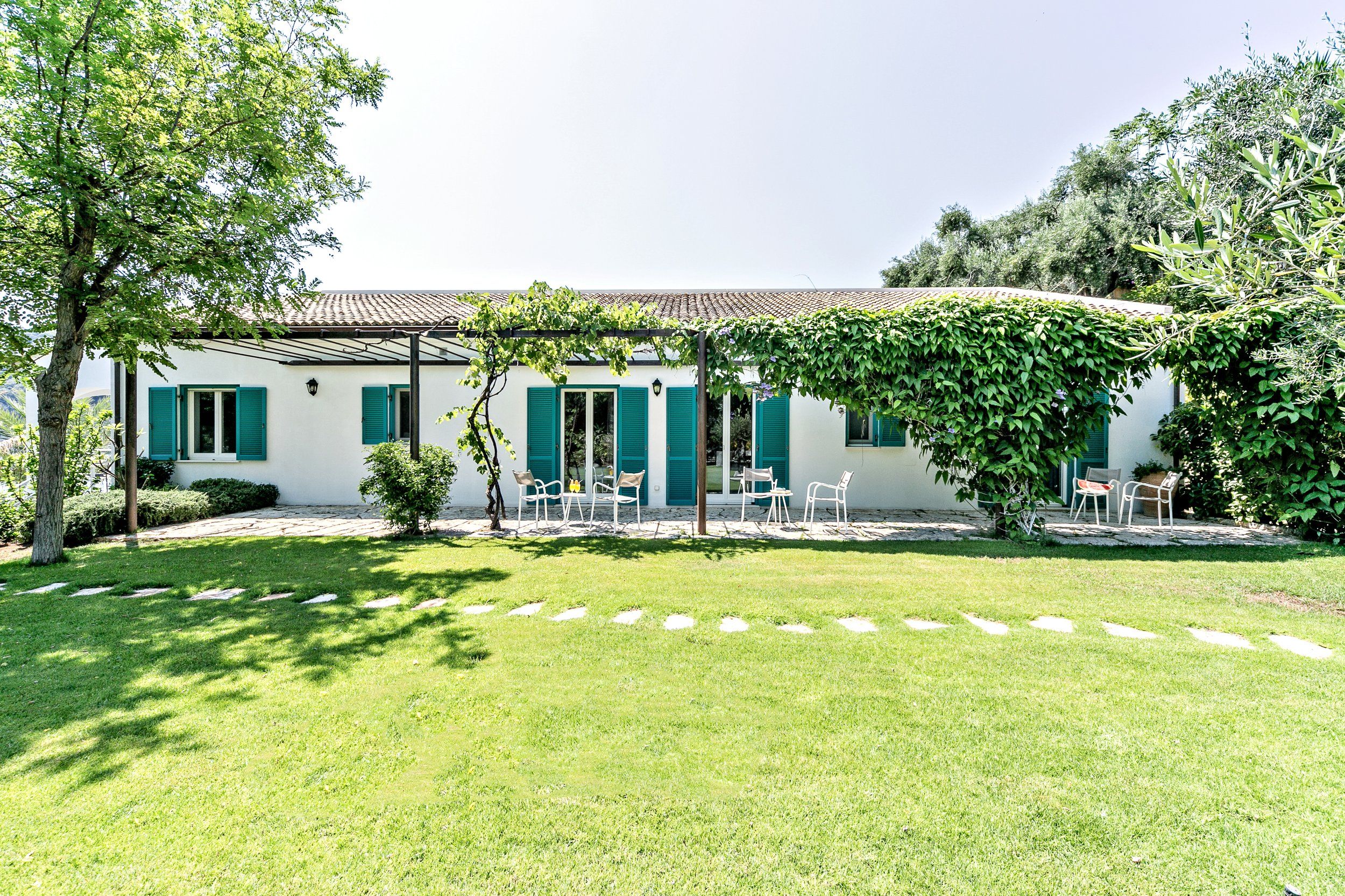 One of Corfu’s most popular and picturesque beaches is right on the doorstep of this deluxe villa. A private path leads from the terrace to the sand of Paleokastritsa beach where boats for snorkelling trips, tavernas for long lunches and shaded loungers await. So, you can join the crowds on the beach or opt for the privacy of your terrace, overlooking the sea. Sunsets here are particularly spectacular – illuminating the coastline in golden light – perhaps best enjoyed from the covered lounge area with a cold drink in hand. A porticoed veranda covers sofas and chairs all facing the sea and the serene swimming pool invites you for a dip in the heat of the day.