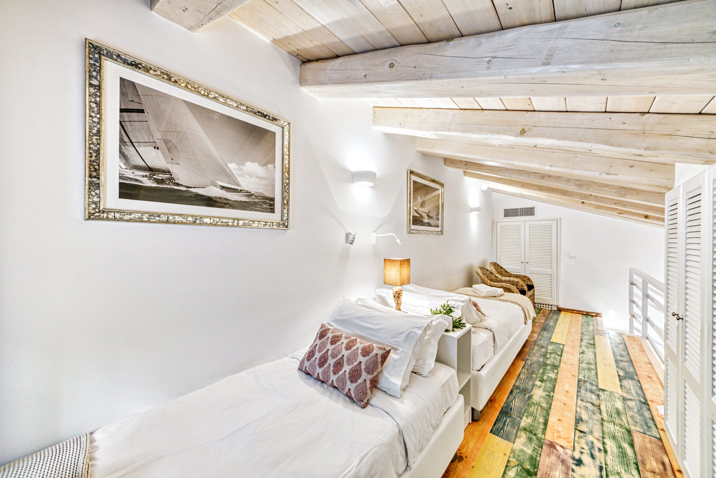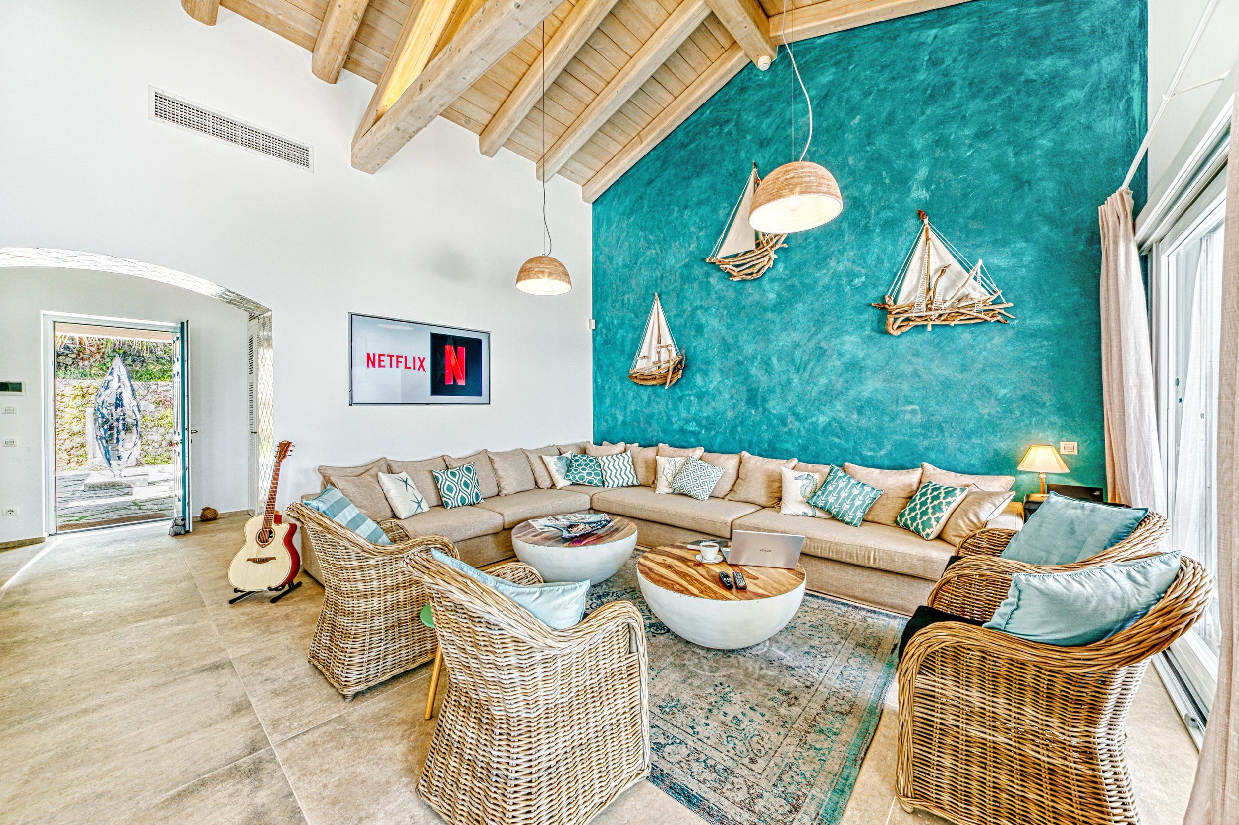 Pull back the glass doors and let the beachy breeze into the open living area. In here, a lofty wooden ceiling lets the air circulate and the decor is a soothing medley of scavenged artefacts – twisting rope lights above the long dining table and driftwood pieces throughout. We love the blue feature wall by the huge corner sofa which shimmers like the sea outside. Wicker accents in peaceful bedrooms create that by-the-beach feel and glass doors lead straight to the terrace.