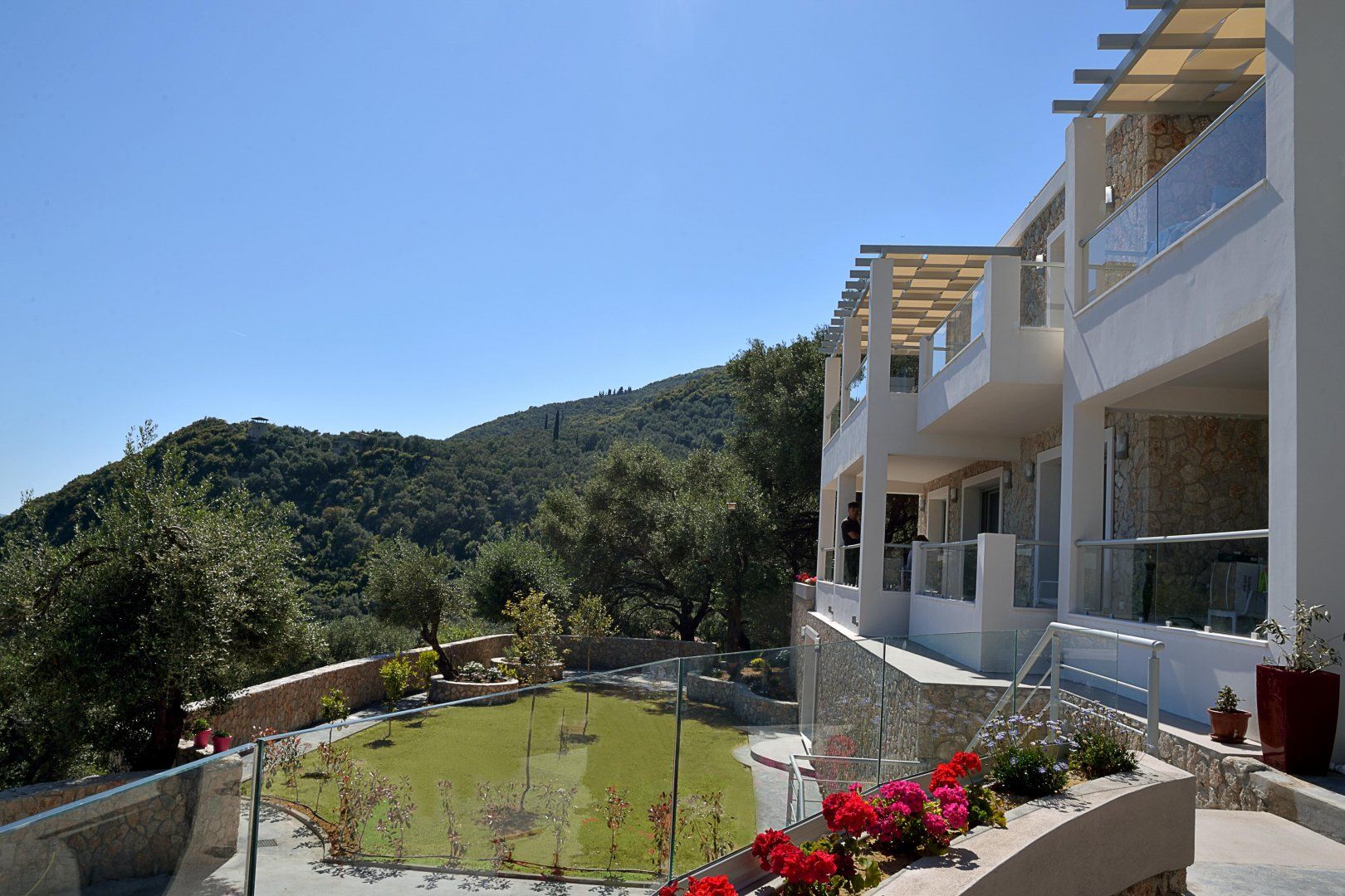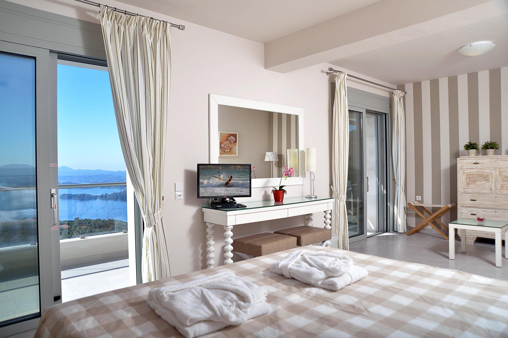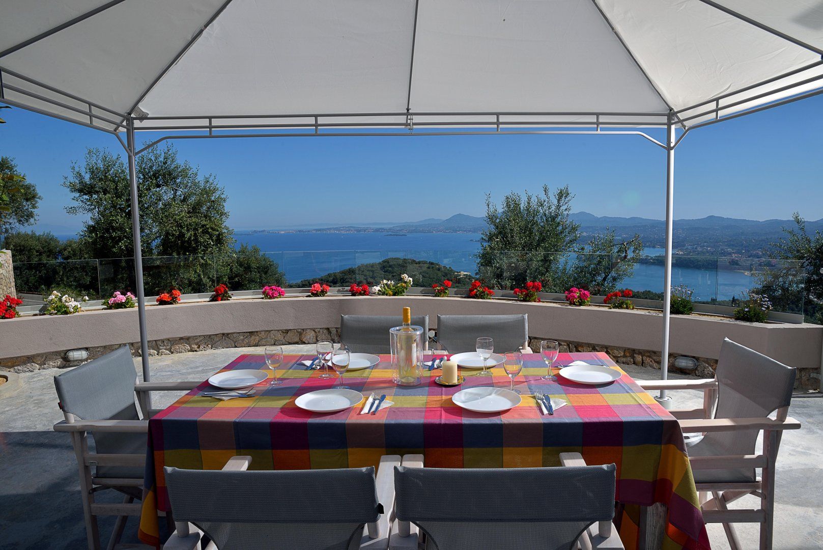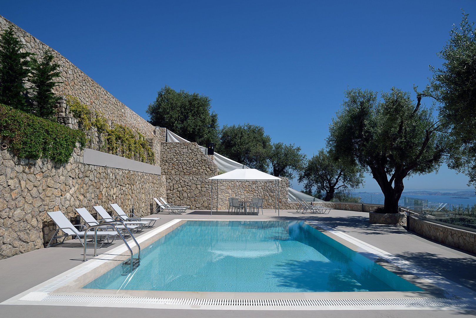 Perched on a picturesque hillside surrounded by olive trees in northern Corfu, this villa has a gorgeous view of the Ionian Sea and the island's coastal villages in the distance.