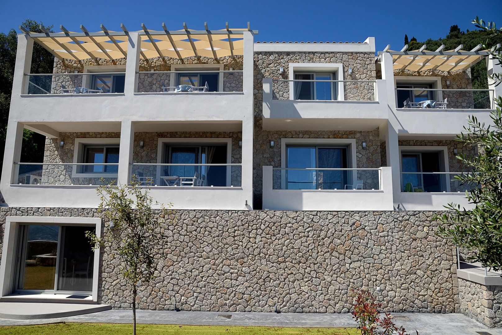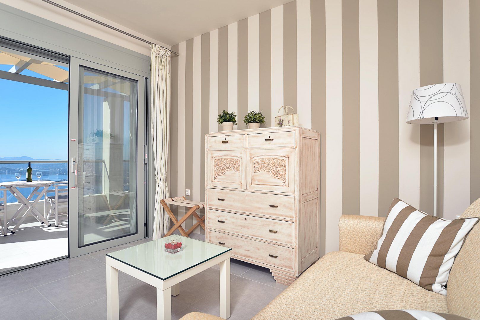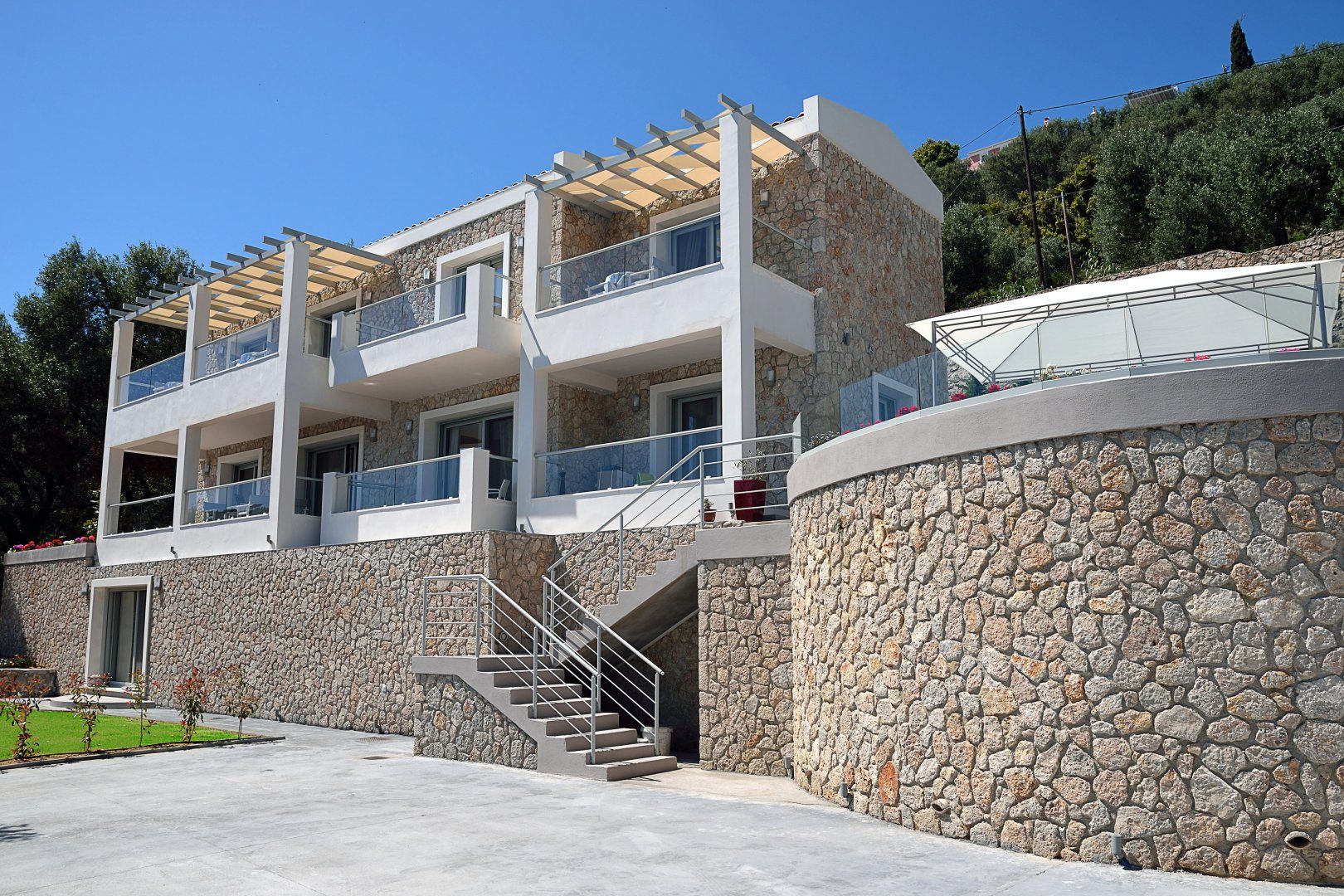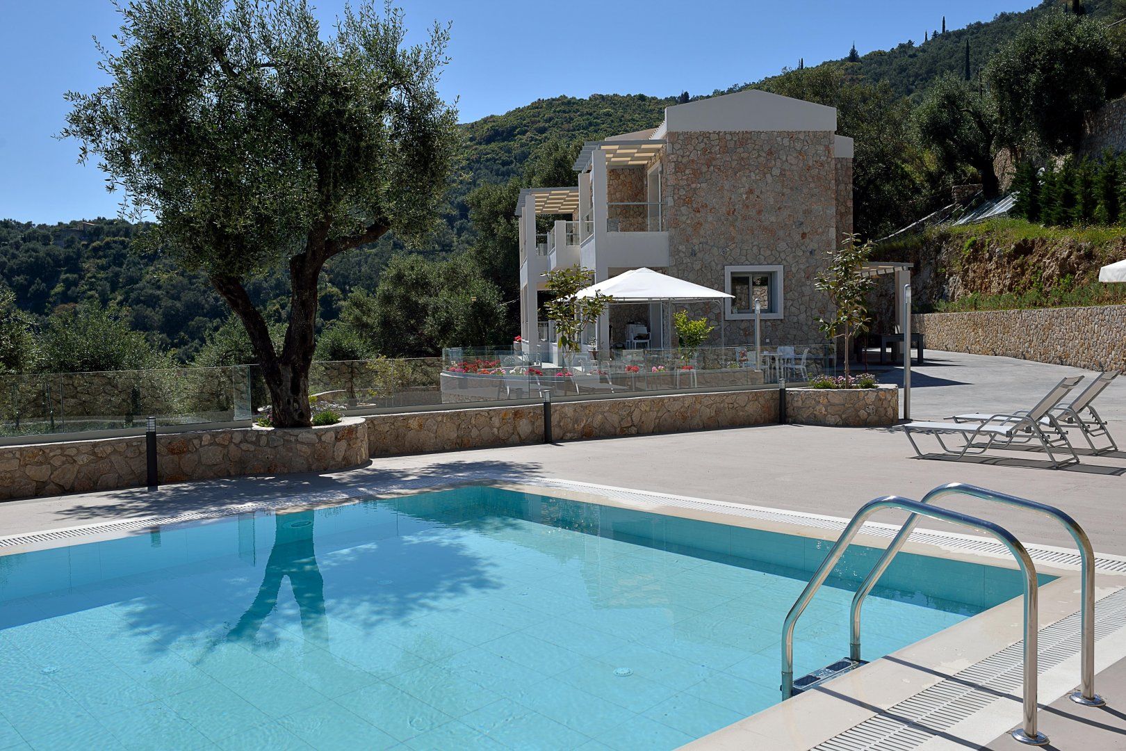 Perched on a picturesque hillside surrounded by olive trees in northern Corfu, this villa has a gorgeous view of the Ionian Sea and the island's coastal villages in the distance.
