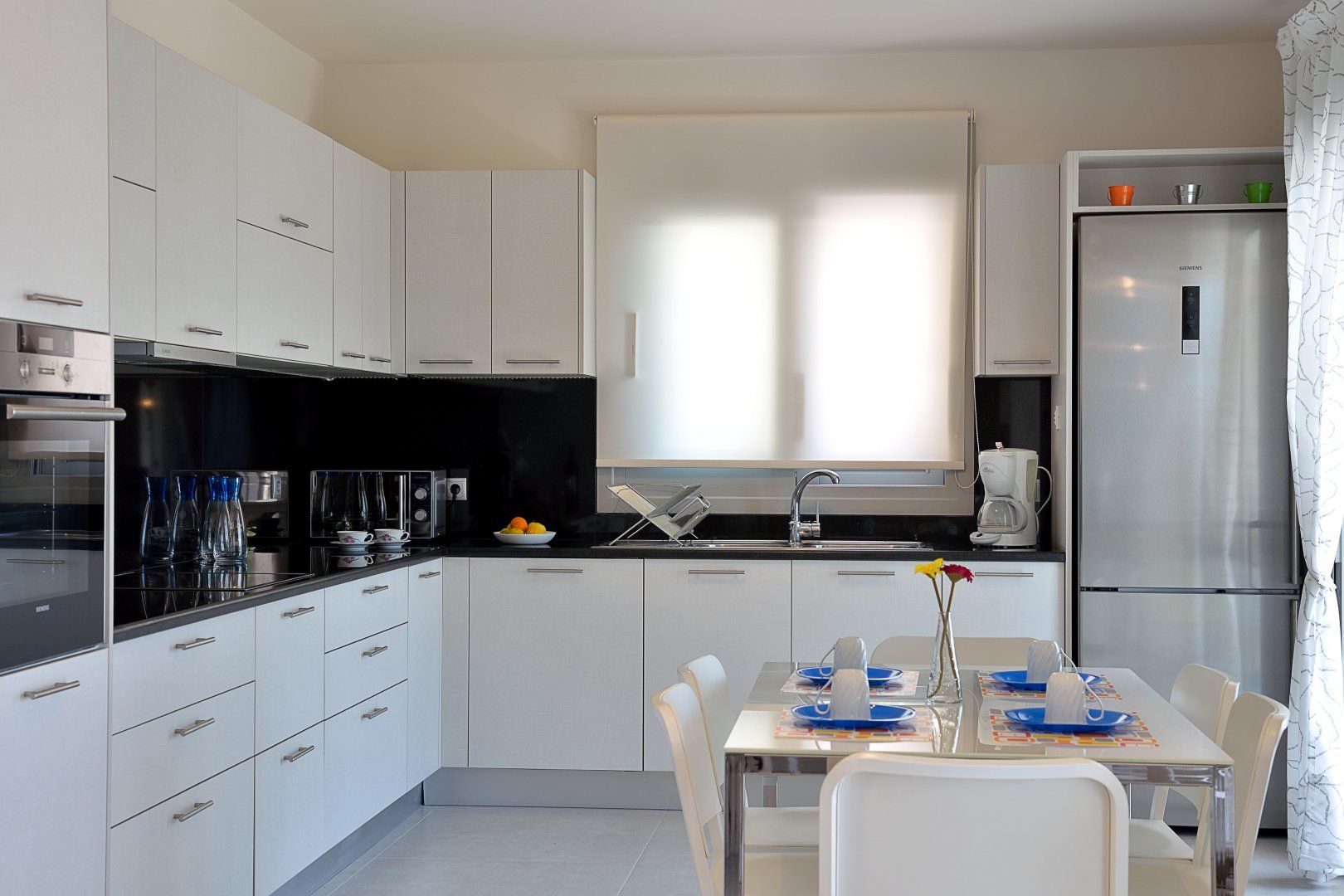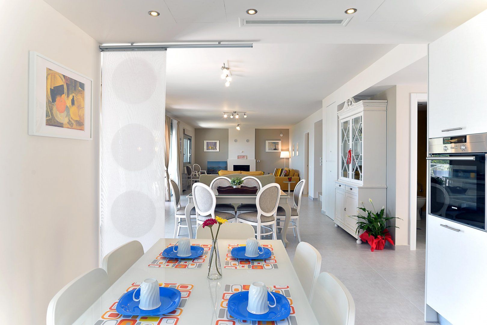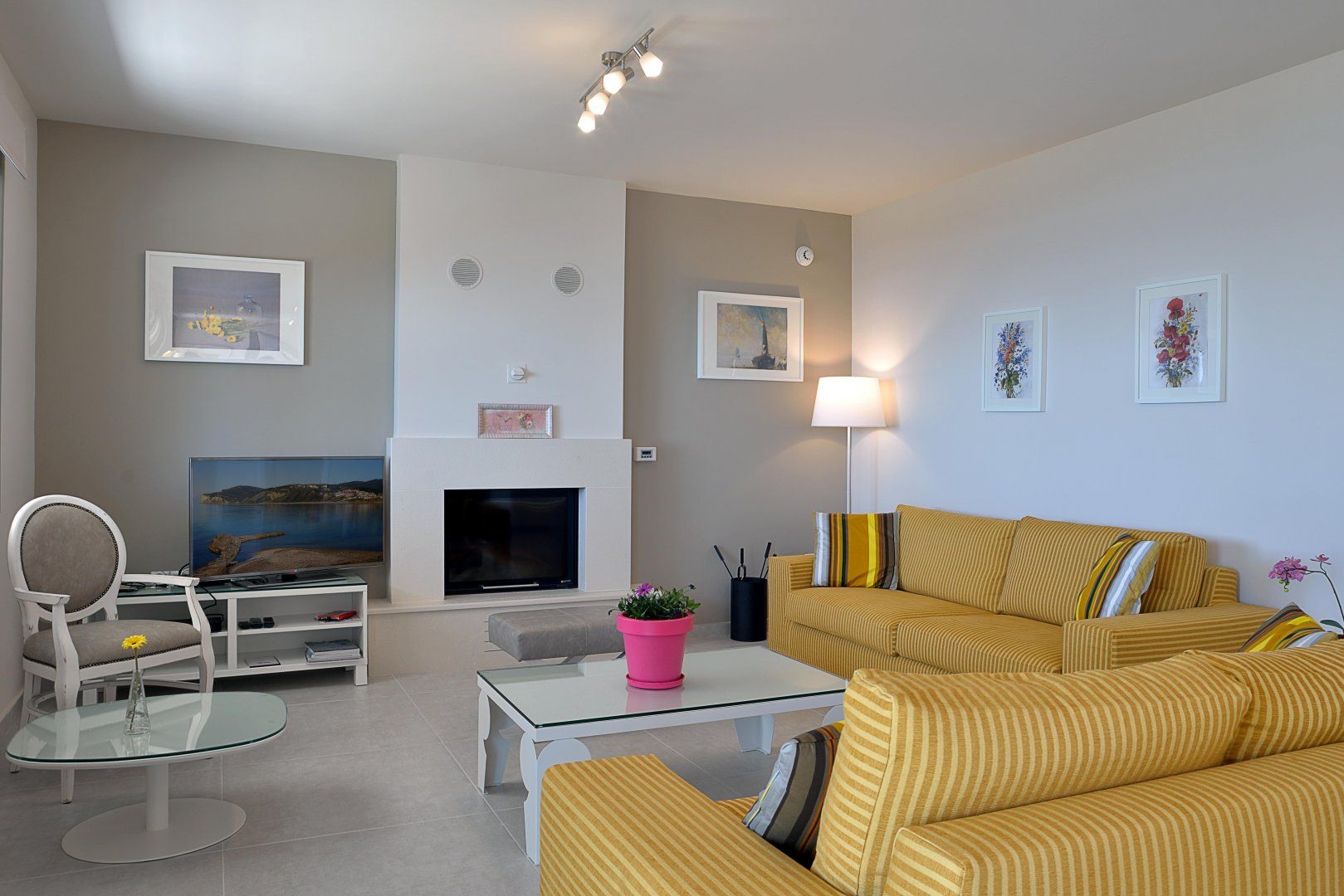 Inside, the home is gloriously bright as a result of the generous amount of floor-to-ceiling windows and glass doors. The stark white walls and sleek surfaces work to accentuate this natural light, while welcome bursts of colour come from the furnishings and artwork. We're glad to see a fireplace in the living room, which will be the perfect setting once the sun goes down.