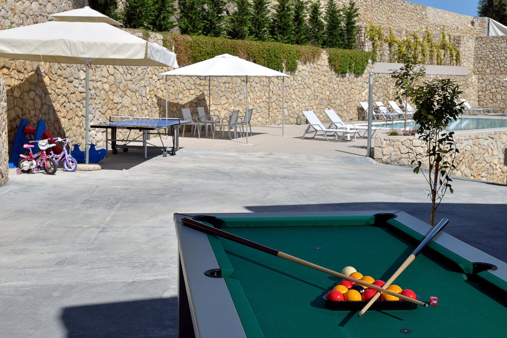 Thankfully, there's no shortage of ways to admire this landscape, whether you're seated on one of the bedroom's balconies, enjoying a dinner cooked on the barbecue underneath the pergola, or even paddling about in the swimming pool. Thanks to the tables out on the terrace, you can even drink in the scenery while playing a spot of ping-pong or pool.