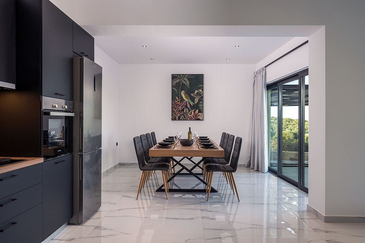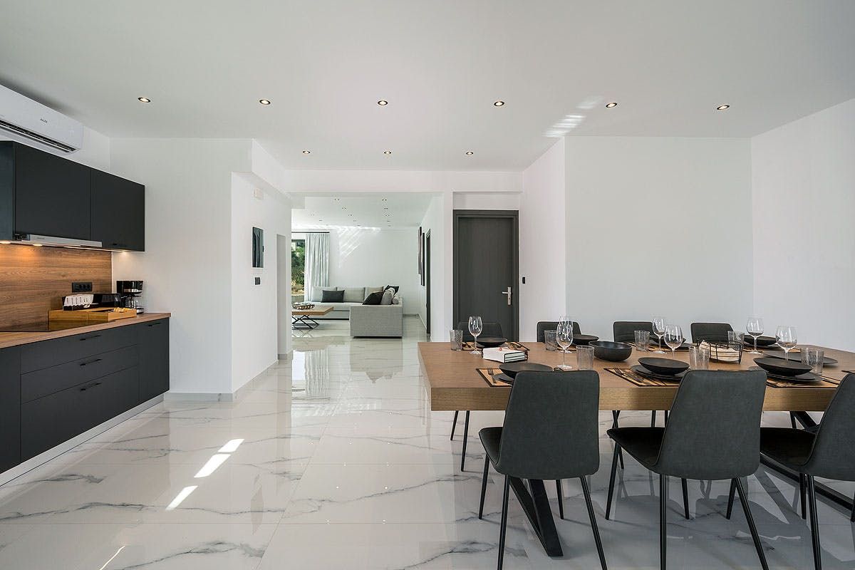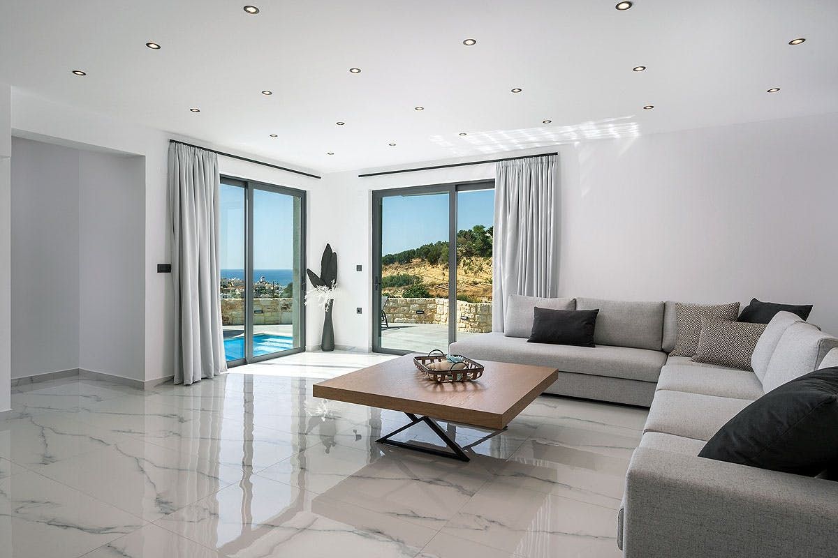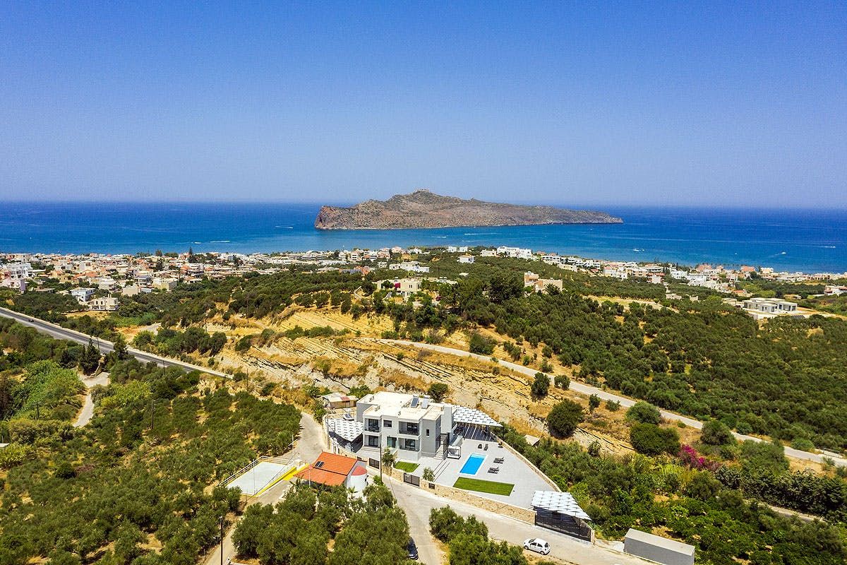 This complex of two modern villas, each with four double bedrooms, is a great solution for large families or groups of friends travelling together and wanting to stay in close proximity while also enjoying their privacy. Just a stroll away from the famous Agia Marina Beach, the homes boast sweeping views over the coast and the surrounding countryside – you’ll be able to marvel at them from the generous outdoor areas, which include swimming pools with plenty of sun loungers and day beds, as well as alfresco dining spaces, perfect for communal barbecue dinners and sunset drinks. The interiors are sleek and minimalist, with more than ample room for everyone in the party to be able to find a cosy nook.