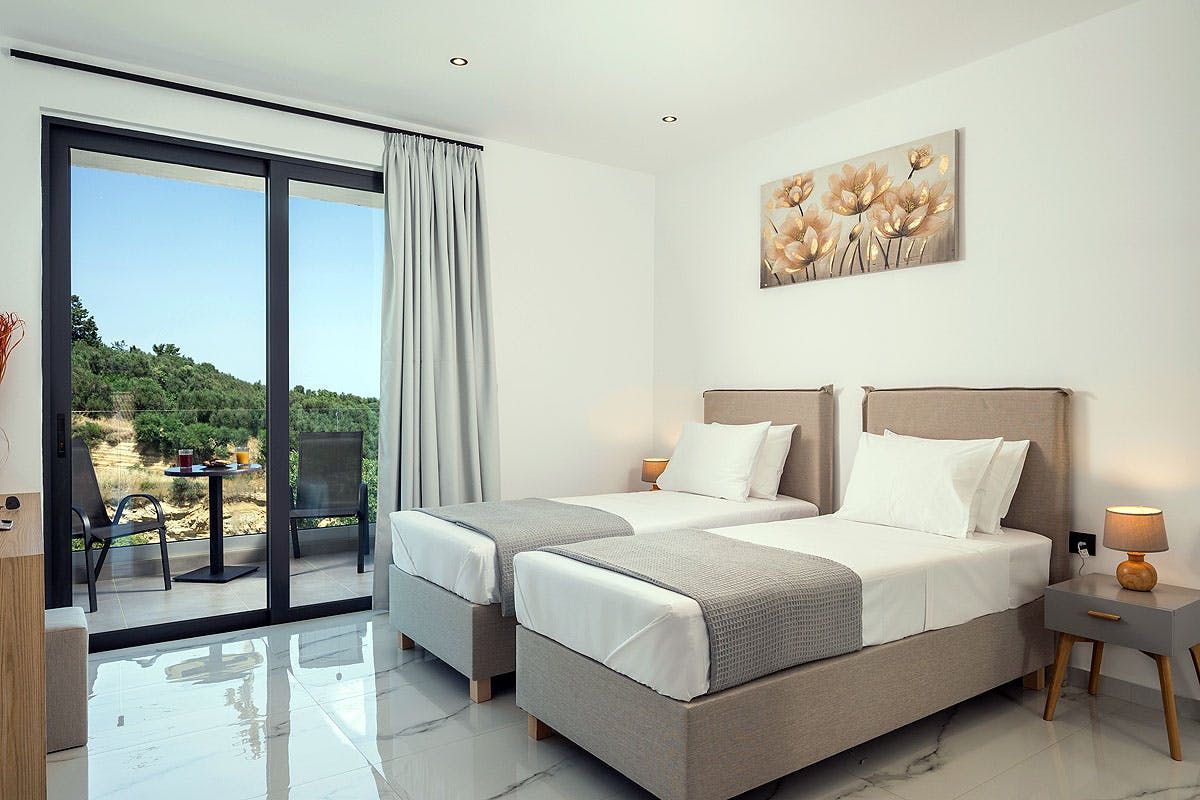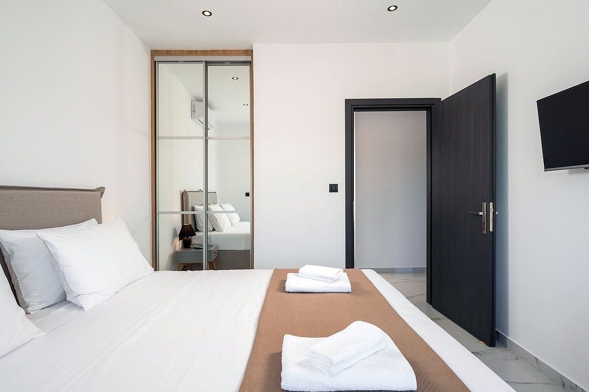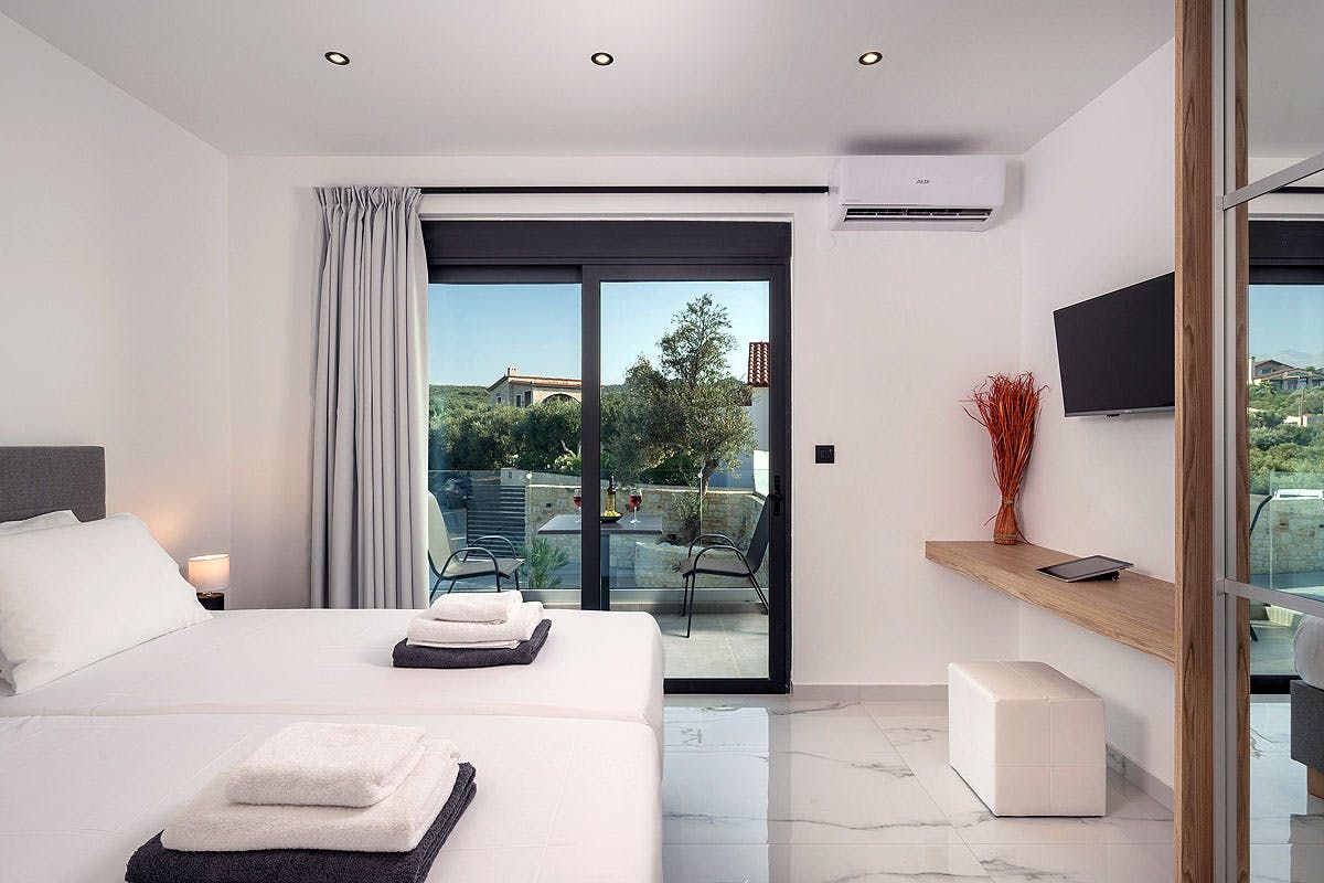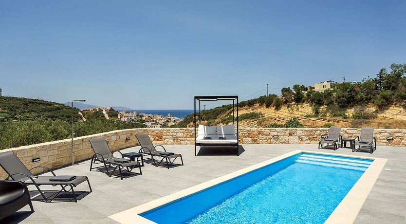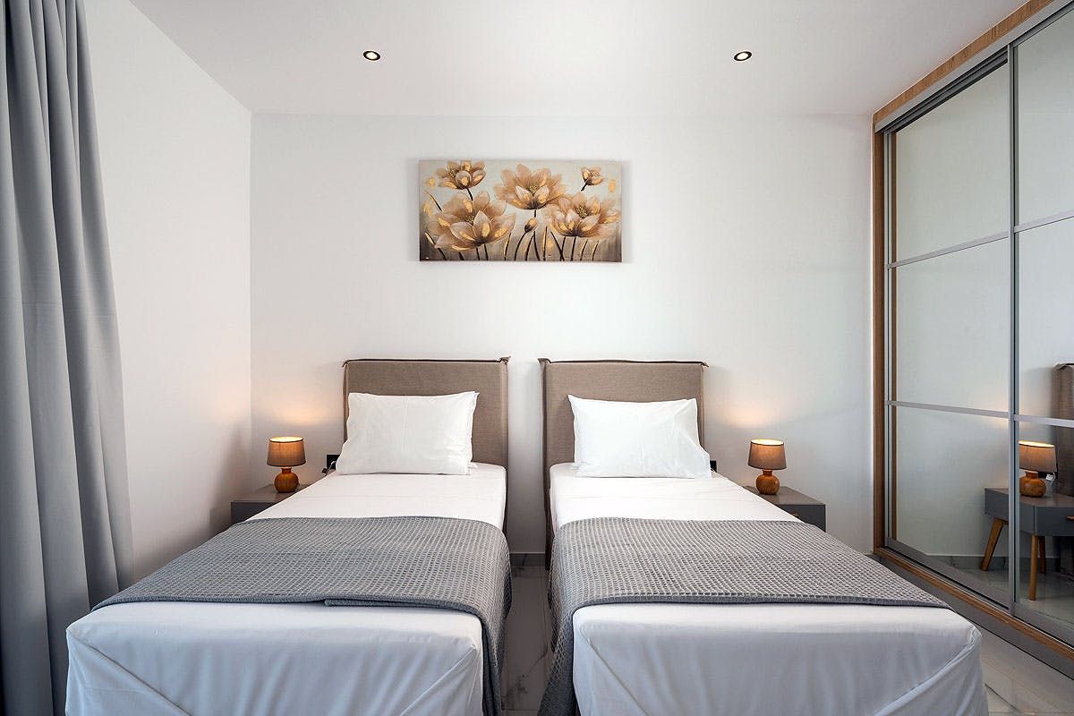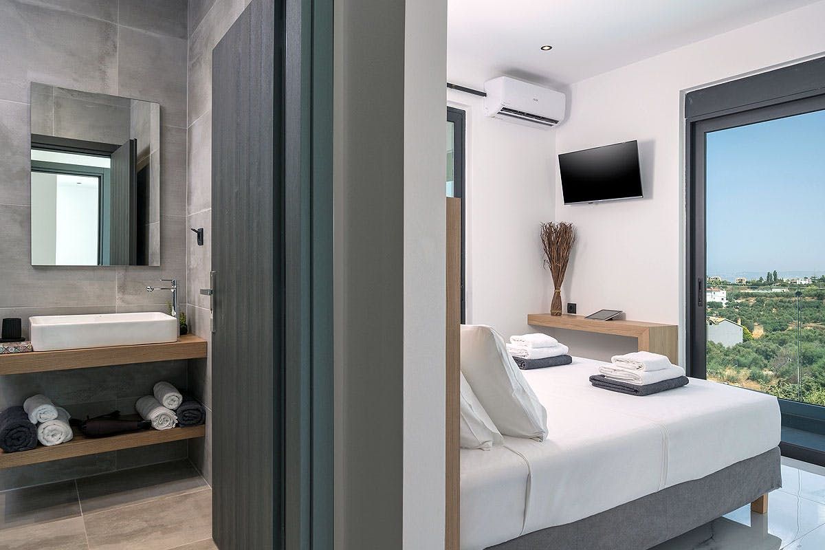 This complex of two modern villas, each with four double bedrooms, is a great solution for large families or groups of friends travelling together and wanting to stay in close proximity while also enjoying their privacy. Just a stroll away from the famous Agia Marina Beach, the homes boast sweeping views over the coast and the surrounding countryside – you’ll be able to marvel at them from the generous outdoor areas, which include swimming pools with plenty of sun loungers and day beds, as well as alfresco dining spaces, perfect for communal barbecue dinners and sunset drinks. The interiors are sleek and minimalist, with more than ample room for everyone in the party to be able to find a cosy nook.
