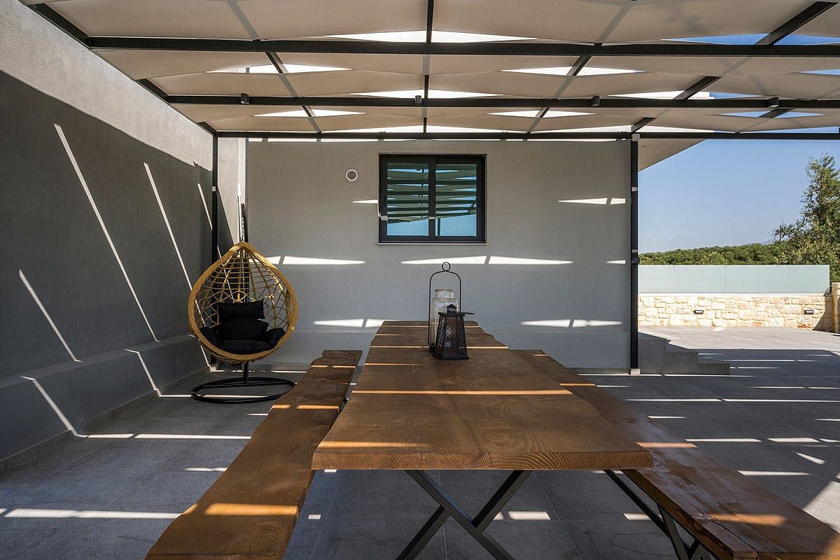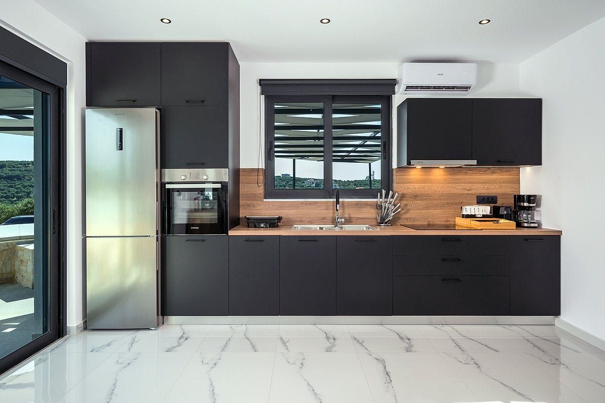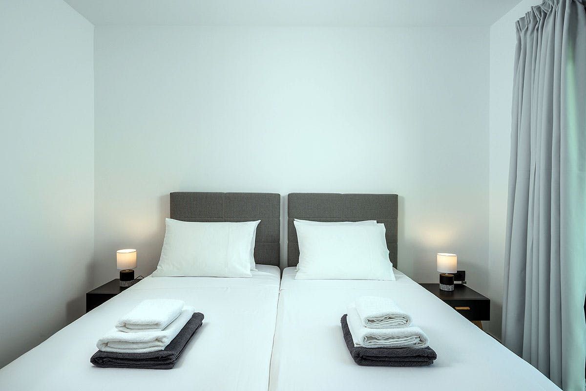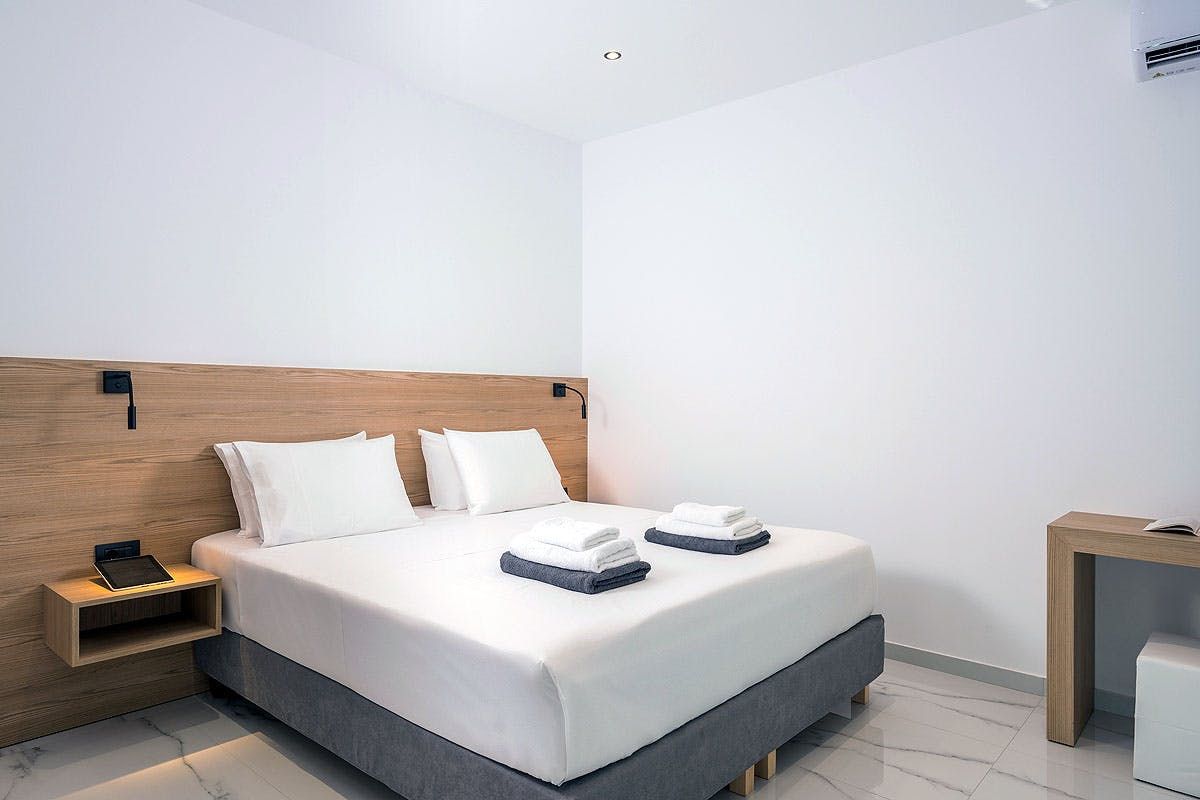 This complex of two modern villas, each with four double bedrooms, is a great solution for large families or groups of friends travelling together and wanting to stay in close proximity while also enjoying their privacy. Just a stroll away from the famous Agia Marina Beach, the homes boast sweeping views over the coast and the surrounding countryside – you’ll be able to marvel at them from the generous outdoor areas, which include swimming pools with plenty of sun loungers and day beds, as well as alfresco dining spaces, perfect for communal barbecue dinners and sunset drinks. The interiors are sleek and minimalist, with more than ample room for everyone in the party to be able to find a cosy nook.