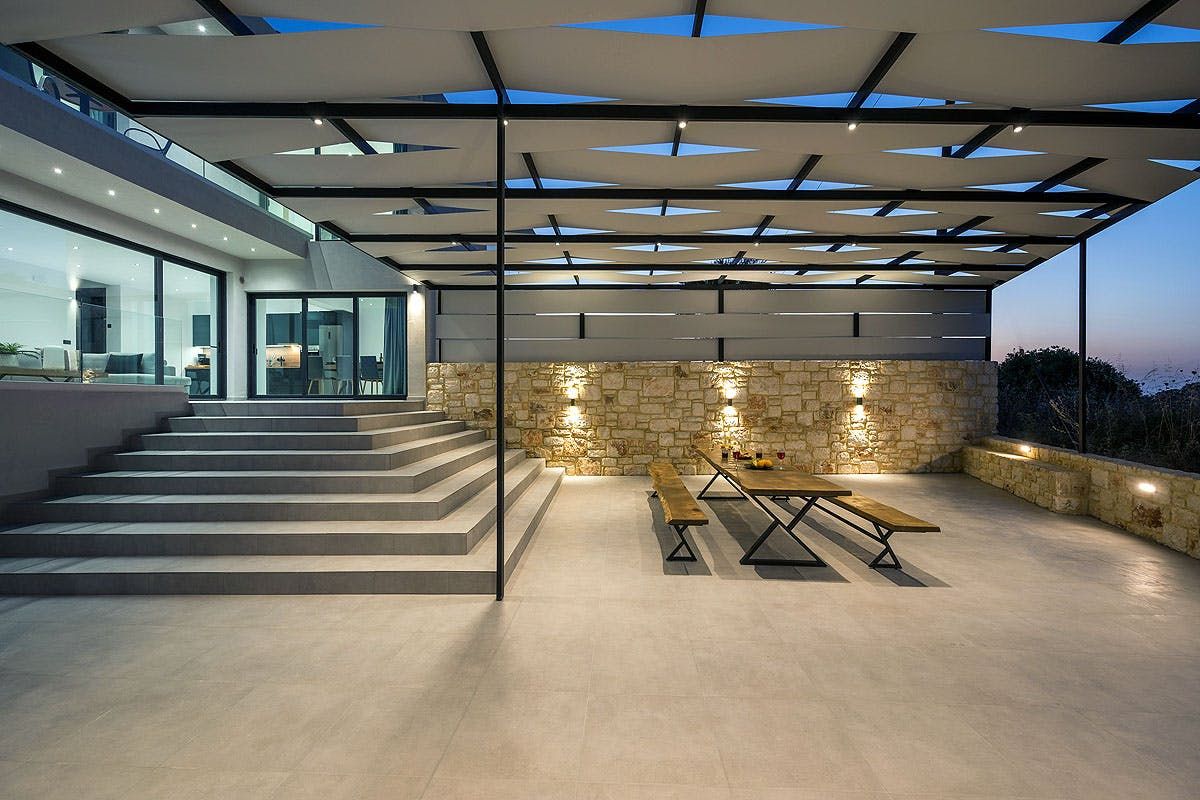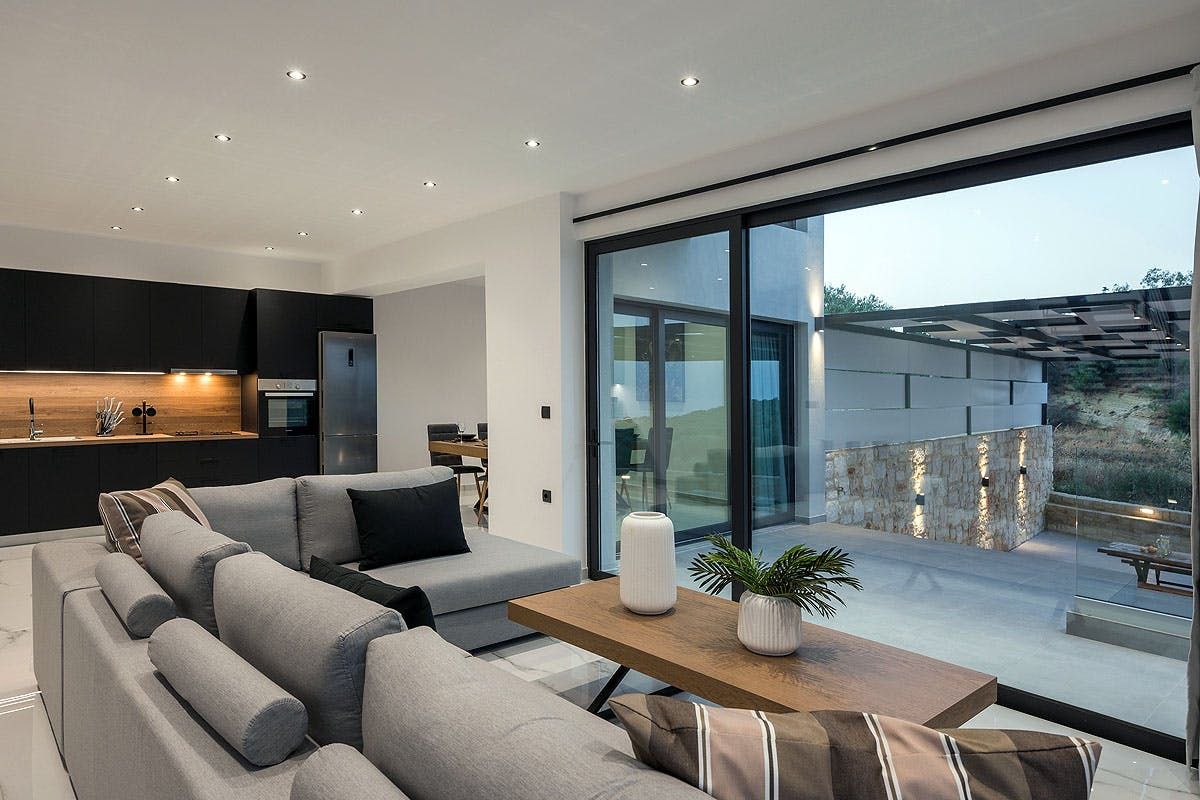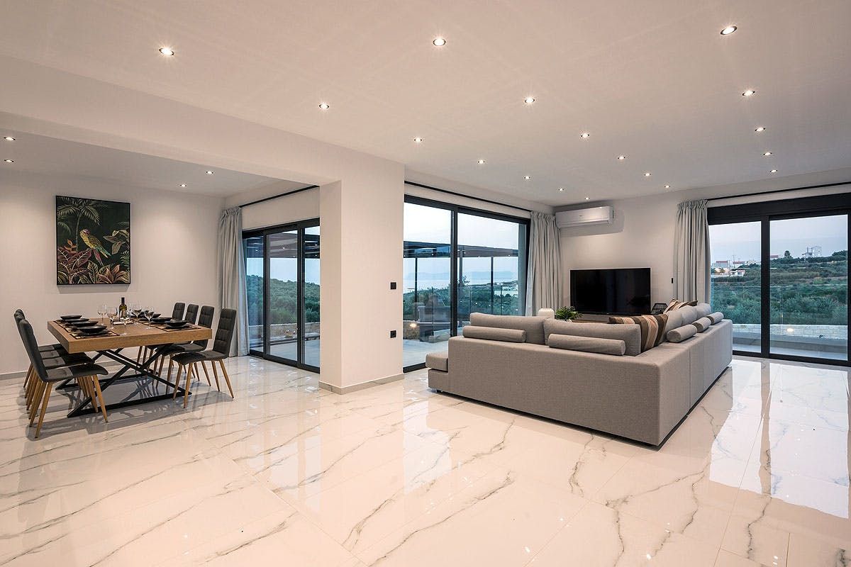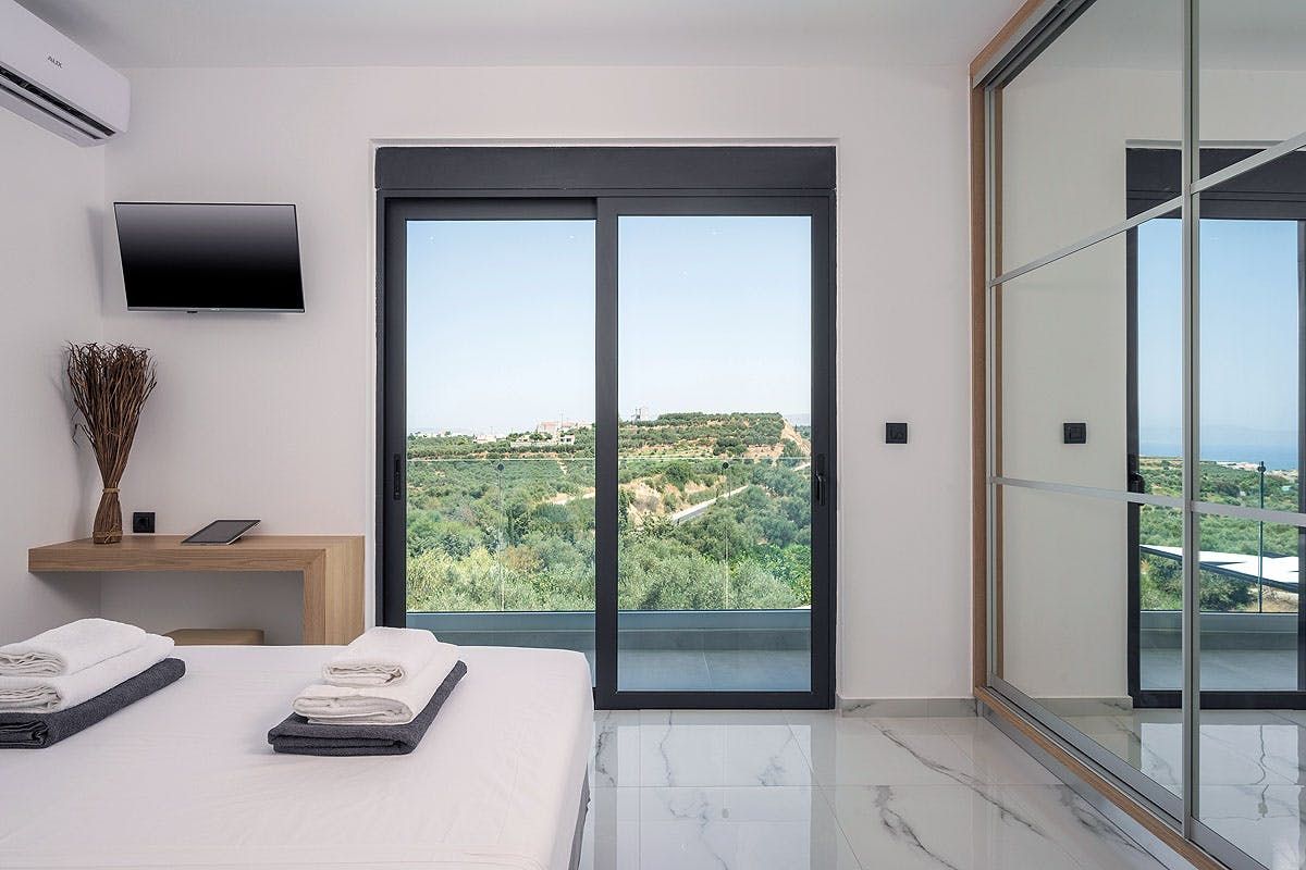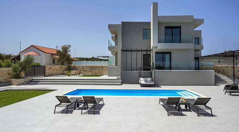 This sleek villa is situated within walking distance of the famous Agia Marina Beach, making it the perfect spot for a relaxing Crete holiday. In case you don’t feel like walking, there’s plenty of space to kick back and relax by the pool – there are sun loungers and a sun bed here, not to mention the huge alfresco dining area, complete with a barbecue. Inside it’s all about minimalist elegance – from the modern kitchen to a comfy living area, this home has you covered. And of course, those views of the surrounding countryside and the sea in the distance are pretty special too.