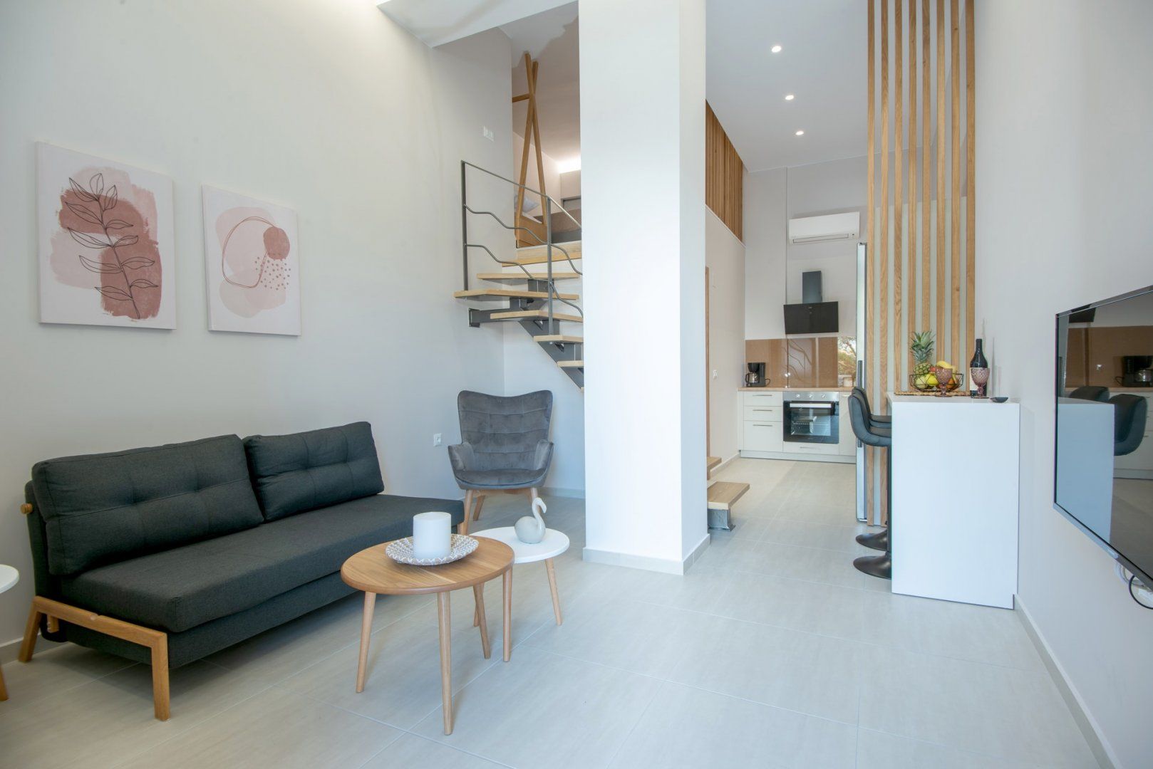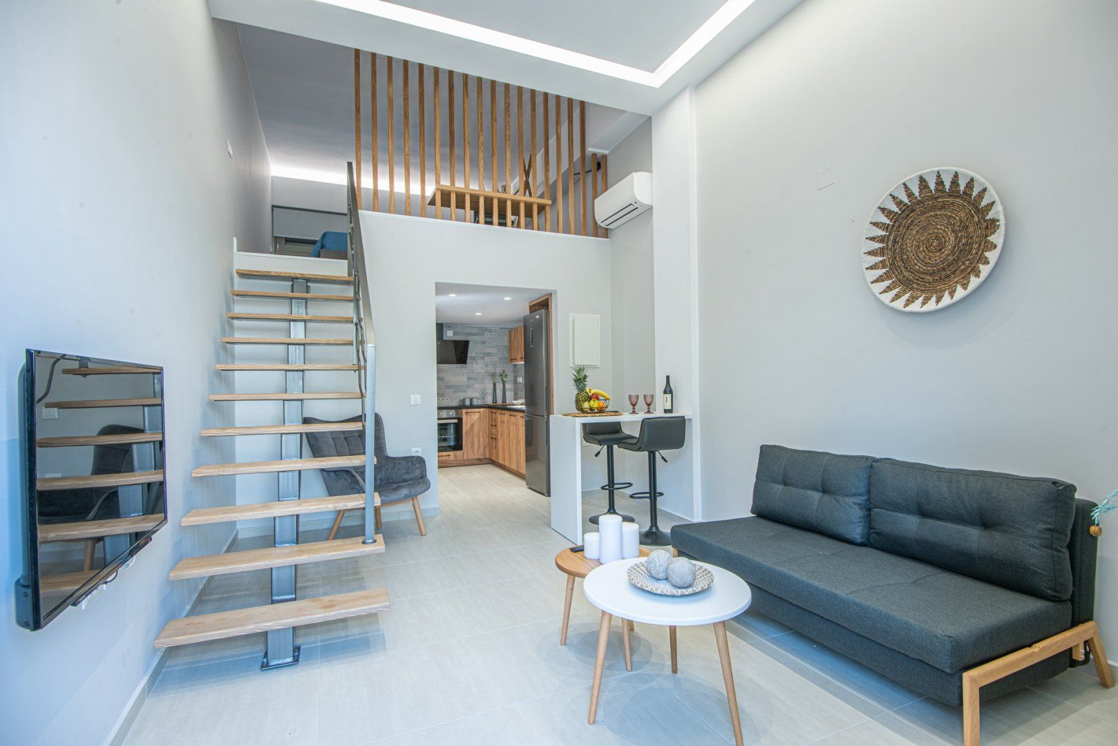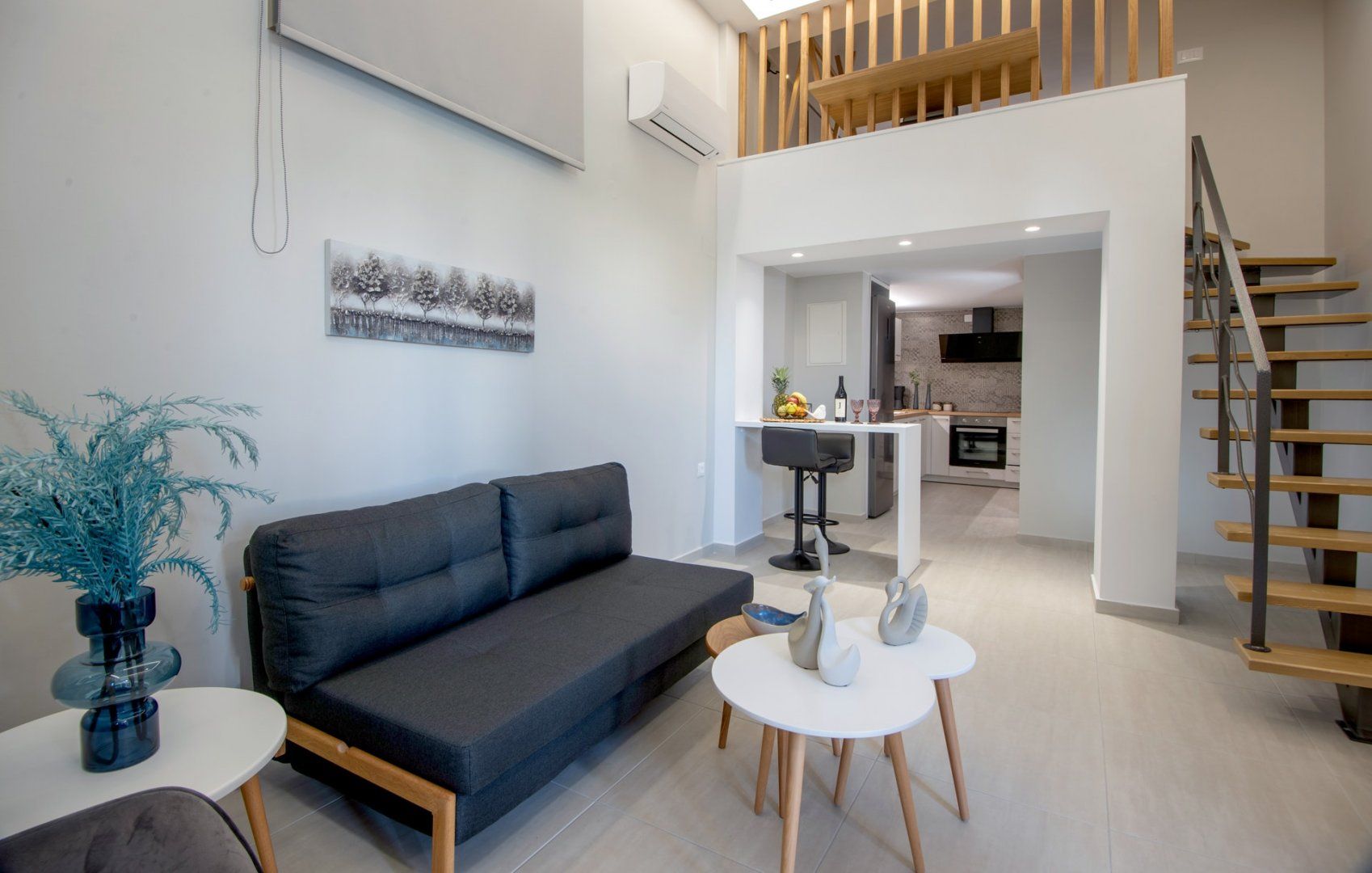 This home has a great location – it’s just 400 metres from the centre of Agios Nikolaos. Have a stroll around the Bay of Mirabello, or explore the harbour and the cafés and restaurants that line the shore of Voulismeni Lake. The nearby beaches of Ammos and Almiros are a must for beach lovers too. Back at this modern apartment – there are stairs to climb and although there’s an outdoor seating area, it’s not private, as it shares the terrace with neighbouring apartments.